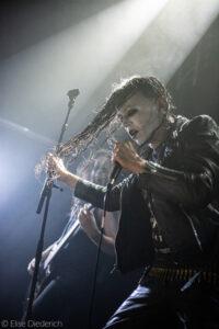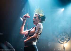 À 21h25 c’est clairement le clou du spectacle qui arrive théâtralement sur scène ; il est plus que certain qu’une écrasante majorité du public de ce soir est venu pour Seth. J’avais eu un gros coup de cœur pour le dernier album du groupe bordelais, « La morsure du Christ », qui avait été un de mes albums phares de 2021, mais j’appréhendais un peu ce que pouvait donner l’ambiance de leurs concerts, surtout dans une salle comme le Petit Bain… Et je peux dire que je n’ai pas été déçue du voyage, et ce dès les premières notes du concert, ouvert par le titre éponyme, bien connu des fans. Les spectateurs, qui s’étaient tenus plutôt tranquilles, attendant l’heure du grand défouloir, pendant les concerts de Thagirion et Merrimack, ont ouvert les vannes et beaucoup se sont mis à pogoter sans fin, en insistant pour donner de nombreux coups de poing et coups de coude, encore et encore, dans les personnes qui ne tenaient pas à s’agiter, dont des personnes assez frêles et petites, des femmes, des photographes… Bref, impossible de profiter vraiment du spectacle malgré tout le décorum sophistiqué à base de tenue de prêtre sataniste pour la chanteur, de bougies, de statues chrétiennes, de verre de vin/sang (logique quand on se fait appeler Saint Vincent), bref toute une installation agréable à l’œil, mais vu le maelstrom constant derrière moi j’ai clairement passé la moitié du concert retournée pour parer le plus possible les mandales octroyées par le groupe de brutes. Je n’ai absolument rien contre les gens qui veulent pogoter et slammer tant que cela reste entre personnes souhaitant pogoter et slammer, entre personnes consentantes en fait, en revanche je ne comprends pas le principe de venir spécifiquement se laisser tomber de tout son poids contre les gens qui ont l’outrecuidance de vouloir profiter d’un concert d’une autre façon, tranquillement, en s’imprégnant juste de la musique… Le tumulte semblait d’ailleurs apprécié par le groupe qui a pas mal encouragé le public à continuer de mettre le boxon. Le son étant toujours aussi mauvais depuis le début de la soirée je n’ai quasiment rien entendu des paroles, en plus d’être en mode survie pour ne pas me faire assommer, ce qui brouille un peu l’écoute aussi : dommage quand l’on pense que Seth a une écriture remarquablement ciselée et recherchée, et un son impeccable en studio ; là le son se rapprochait plus d’un gloubiboulga trop fort, et l’ambiance dans la fosse d’un concert de hardcore ou de grind, youpi. À la fin du show le groupe fit appel à une performeuse pour un petit numéro d’effeuillage à base d’ingrédients se voulant subversifs tout en répondant efficacement au fan service : nudité féminine, mise en scène d’agression, sang de porc versé sur les seins, mime de gestuelle sexuelle avec une statue de la Vierge, petit numéro de feu avec des cubes enflammés… Un interlude esthétique et pas nécessairement utile (sur 17 personnes sur scène pendant 3 concerts successifs une seule était une femme et c’était la seule à poil, ce n’était pas vraiment le sens du hashtag « more women on stage »…) mais qui eut l’avantage d’offrir un petit répit et d’arrêter de me prendre des gnons pendant les cinq minutes où les spectateurs étaient hypnotisés par l’envoûtant pouvoir des femmes nues pour faire joli. J’aurais aimé adorer le concert et passer un excellent moment mais ni l’ambiance générale ni la qualité du son n’ont vraiment permis ça, dommage, malgré les qualités de performers des musiciens et leurs efforts pour fournir un spectacle total.