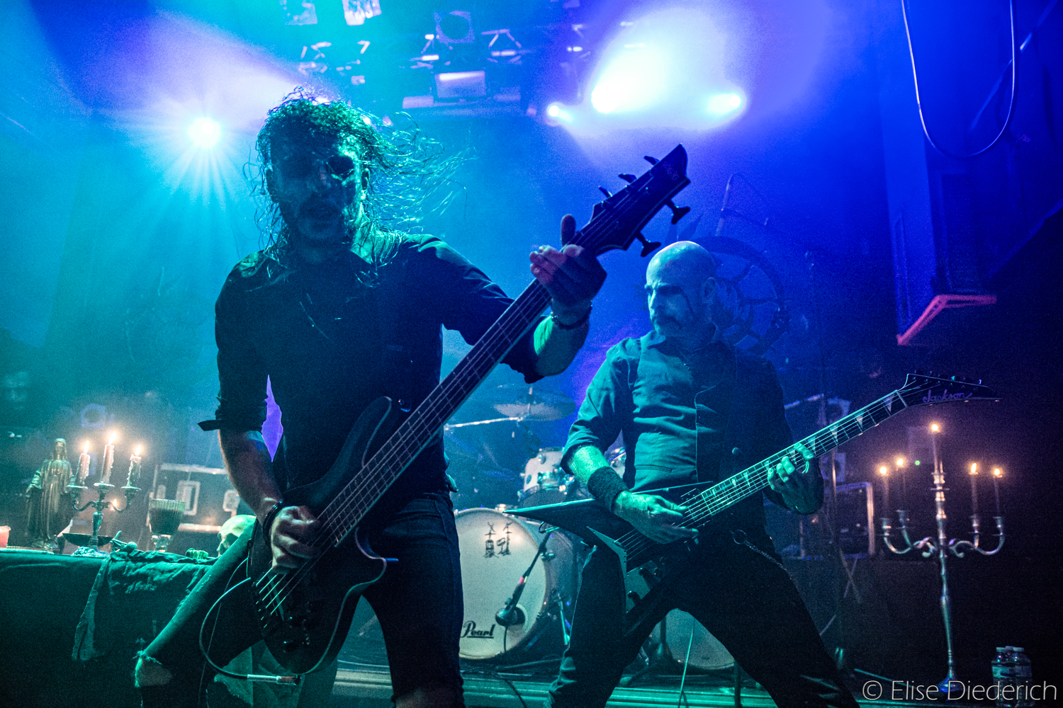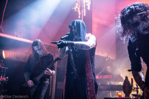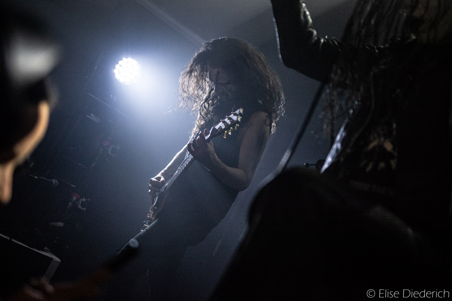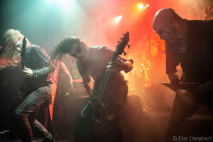 À 18h55 c’est Thagirion qui a ouvert le bal du diable, pour ce qui vraisemblablement le tout premier concert du groupe, existant depuis 2011 mais dont l’EP « On the path of shattered bells » (également le morceau inaugural du set) date seulement de 2021. Je ne connaissais pas du tout la formation, mais j’ai été surprise d’apprendre que son pilier, Vagus Nox, aux commandes de tous les instruments tour à tour, avait joué avec Mayhem, Abbath, Goat Torment, Loudblast, Satyricon, Shining, Svart Crown et j’en passe… Donc un groupe à la fois très récent mais déjà fort confirmé. Sur scène Vagus Nox à la guitare était accompagné des membres fixes Spir Ignis au chant et de CsR à la batterie ainsi que d’un bassiste et d’un guitariste de session. Ils ont livré un show musclé, froid, impartial, rapide. On ne peut pas dire qu’il y ait eu beaucoup d’interactions ni de mise en scène, les musiciens étaient juste là pour jouer – et bien jouer. Le son n’était pas toujours bien réglé, trop fort, avec des paroles un peu noyées et dures à discerner, mais une belle énergie était constante du début à la fin, quelque chose qui tenait en haleine tout le long des 50 minutes de la prestation. Sur le dernier titre, « Vanguard », le groupe fut rejoint par le guitariste de Seth, caméo fort apprécié par le public du Petit Bain.