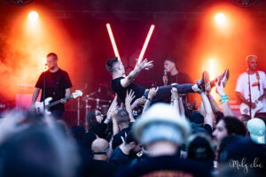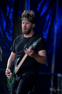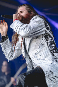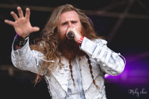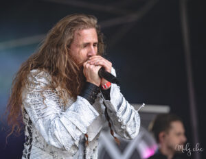 Xaon est le prochain groupe, et pareil, belle découverte car je ne connaissais pas, mais rien que la veste du chanteur qui semait des petites paillettes de peinture un peu partout, ça valait le coup! Nan… En vrai, le chanteur à un charisme fou, et il en joue énormément, ce qui rend ce set un peu barré mais vraiment cool à voir sur scène.