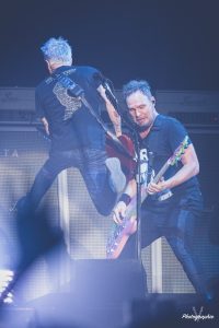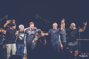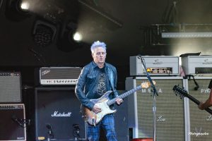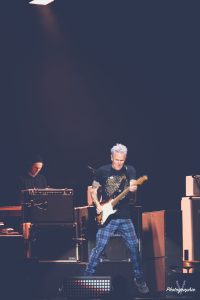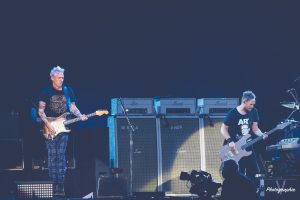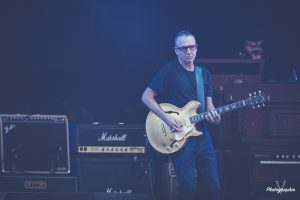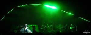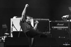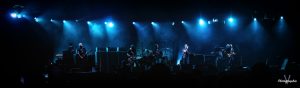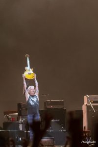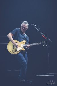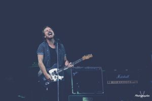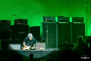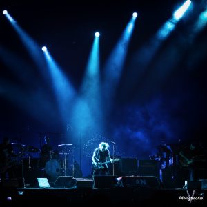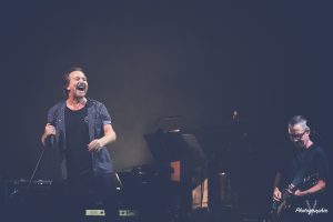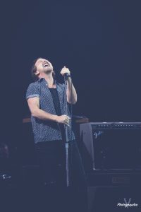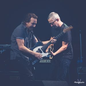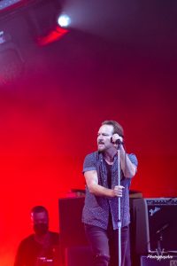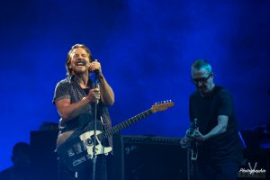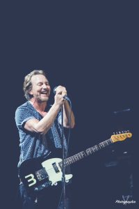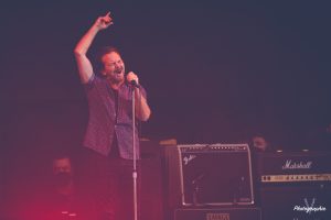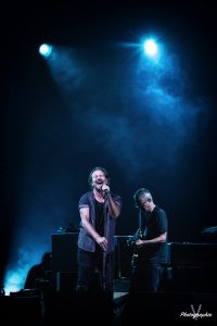 On voulait être là pour eux et on n’a pas été déçu d’être venu. Déjà parce qu’avant on a eu droit à de très bons artistes, ensuite parce que le spectacle de ce soir a été à la hauteur des attentes du public qui attendait leur retour depuis 2006 (On y était !!). Premier constat Eddie Vedder a toujours de la voix. Contrairement à beaucoup de chanteur de sa génération, il n’a rien perdu de son savoir-faire. Une seule fois il ratera un hurlement qui restera dans sa gorge, beau joueur ça le fera marrer. Le monsieur à l’air d’avoir tiré un poil sur la bouteille avant le concert et il pendra quelque gorgé de vin durant ce dernier pour le style (faudra quand même lui dire un jour que son vin de scène est dégueulasse). Il a parfois des poses assez invraisemblables, le regard ailleurs et il arrêtera même un morceau en plein milieu parce qu’il a cru voir quelqu’un en détresse au milieu du public. Le morceau repartira comme si tout ceci était prévu. Mais tout ça est plutôt amusant, le mec est bon vivant (ça change de l’époque où il faisait des concerts entiers en tournant le dos au public), il est généreux envers le public. Le reste du groupe est un peu plus en retrait, mais bien là. McCready n’hésite pas à prendre la pose au milieu de ses solos, et nous vérifions avec lui qu’il n’a rien perdu, il changera de nombreuses fois de guitare nous exhibant une collection impressionnante de pelles vintages. Gossard toujours très discret assurent les chœurs et les rythmiques, jamais loin de son chanteur, témoignant d’une connivence touchante après autant de temps passé ensemble dans la même formation. Après tout on en a vu d’autres nettement moins camarades… La setlist passe toutes les périodes mais n’oublie pas le fan qui est venu entendre les classiques, la encore on a une vraie générosité de la part d’un groupe qui aimerait surement chanter de nouveaux titres plutôt que de servir ceux qu’ils jouent depuis si longtemps. Et que dire de la scène, tout en sobriété avec un piano droit en décor et des amplis vintages tout du long. On appréciera également la mise en lumière que vous découvrirez sur les photos qui accompagnent cet article.