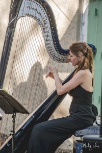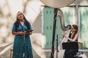 Cette seconde journée débute avec un duo classique, le duo. Harpe et musique d’opéra résonnent sur tout le site et accueillent les festivaliers tout en douceur et chant d’Opera.
