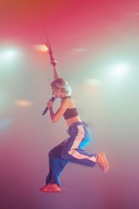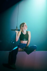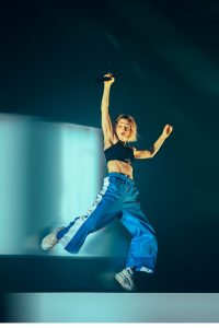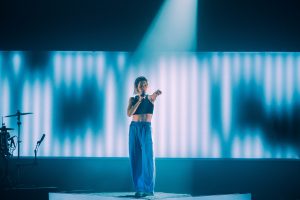 C’est au tour d’Aloïse Sauvage de monter sur scène. Une arrivée mystique avec une lumière bleue et une marche très lente pour arriver jusqu’à son cube, positionné au milieu de la scène. Souriante, énergique et acrobate, l’artiste a tout d’une grande showgirl ! Aloïse, diplômée du concours de l’académie Fratellini,  nous offre un show unique avec des acrobaties, tout en restant accrochée à son micro. Lumières et scénographie millimétrés, l’artiste se produit dans un décor lumineux et esthétique hors du commun.