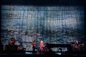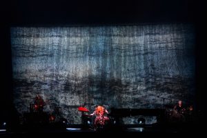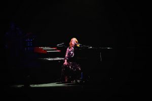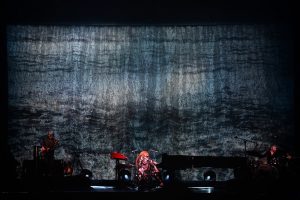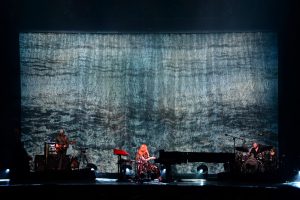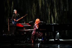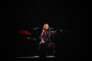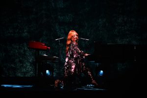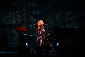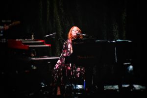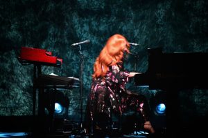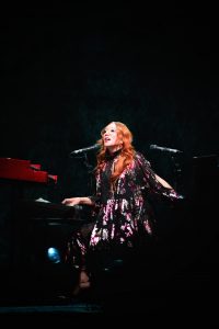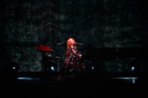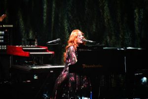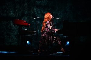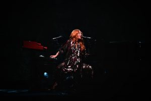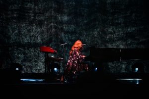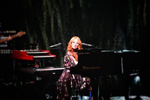 Le concert débute avec God, un titre emblématique de l’album Under the Pink (1994). Dès les premières notes, l’énergie de Tori Amos, entourée d’un bassiste à sa gauche et d’un batteur à sa droite, est palpable ; l’audience est immédiatement captivée.