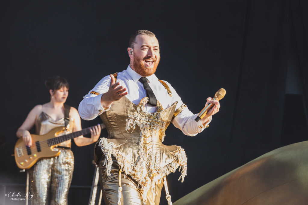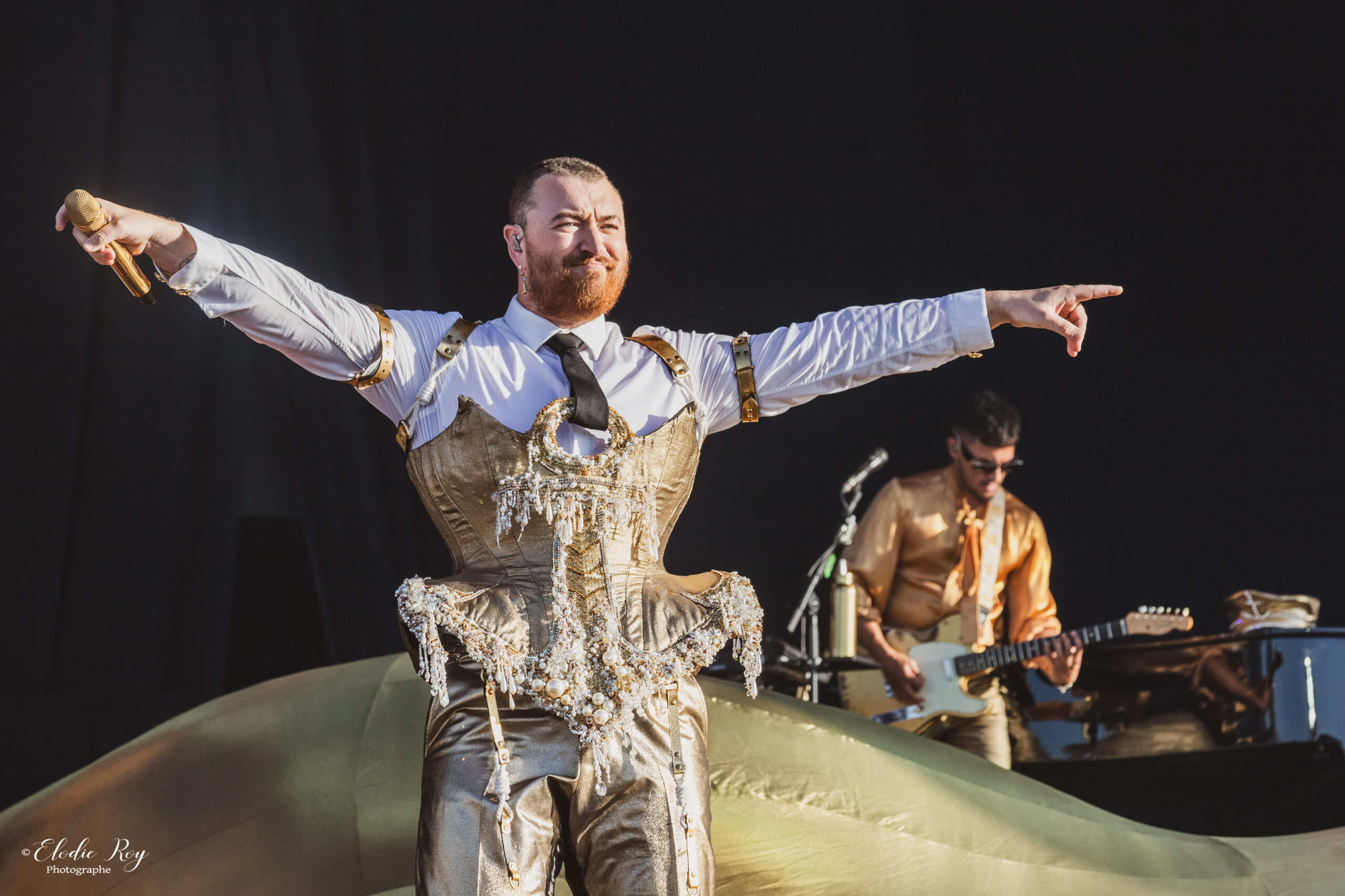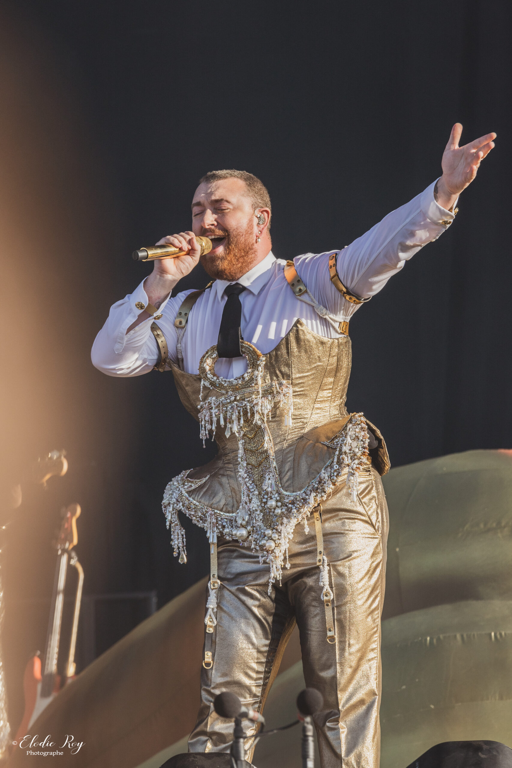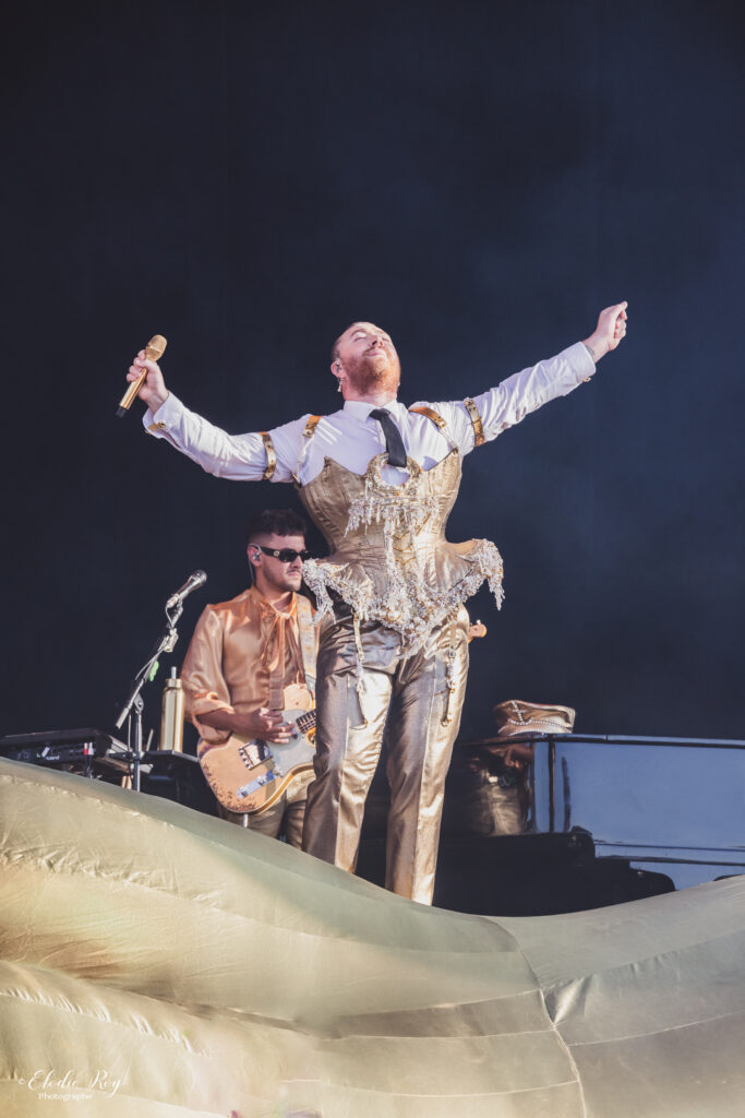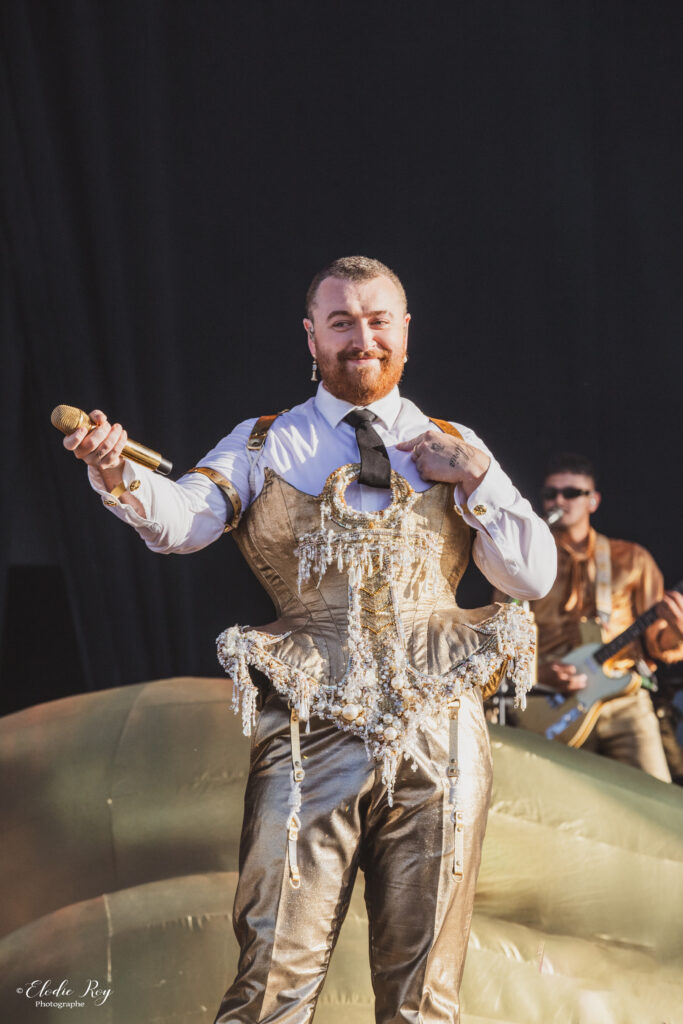 C’est parti pour une heure trente de show avec SAM SMITH. Pas besoin de présentation, tout le monde connait. Iel est devenu.e l’un.e des artistes les plus populaires et modèle pour beaucoup de personnes LGBTQI+ ! Première scénographie de dingue : une statue géante couleur or représentant une personne nue étendue sur toute la scène. Iel commence le show avec son plus grand titre Stay With Me (plus d’un milliard de vues sur YouTube) ! Sur scène, il y a 4 musicien.ne.s, 3 choristes ainsi que 6 dancers. Le public est excité et chante les paroles de chaque chanson. La première partie du concert est plus posée (composée de balades essentiellement autour de la rupture amoureuse). Tandis que la seconde partie est bien différente (composée de titres Pop Dance) comme Lose You, Promises et Unholy. Sam prend le temps de discuter avec le public et annonce que c’est la première fois que ce show est joué à l’extérieur. SAM SMITH résume les valeurs de son show en 3 mots : liberté, amour et fierté !