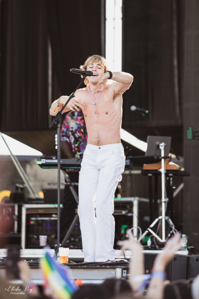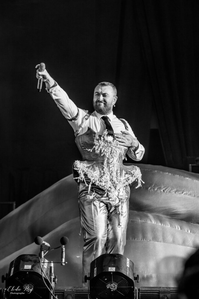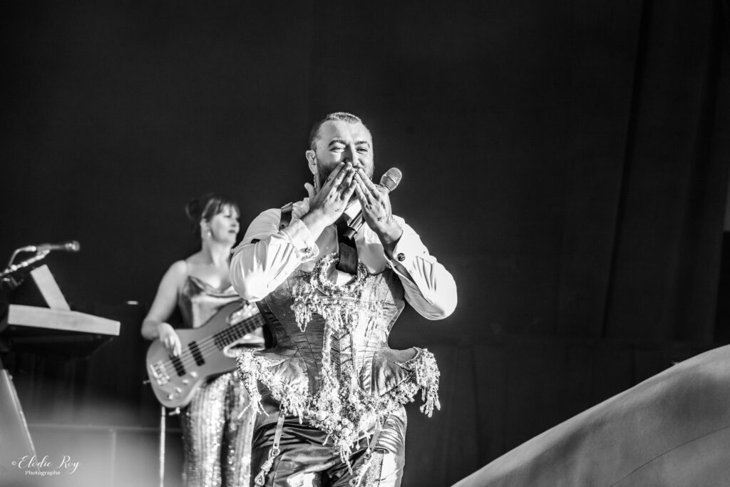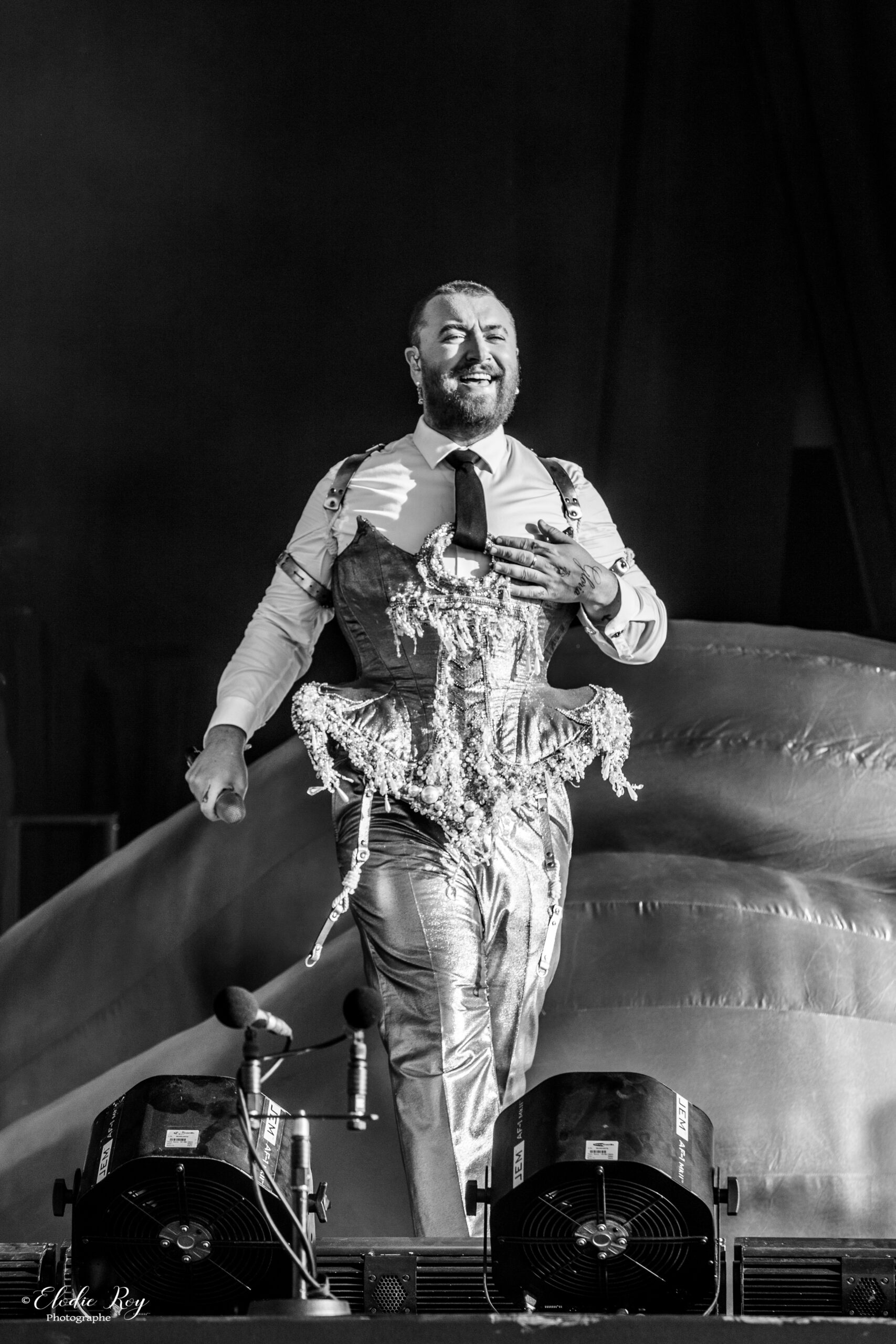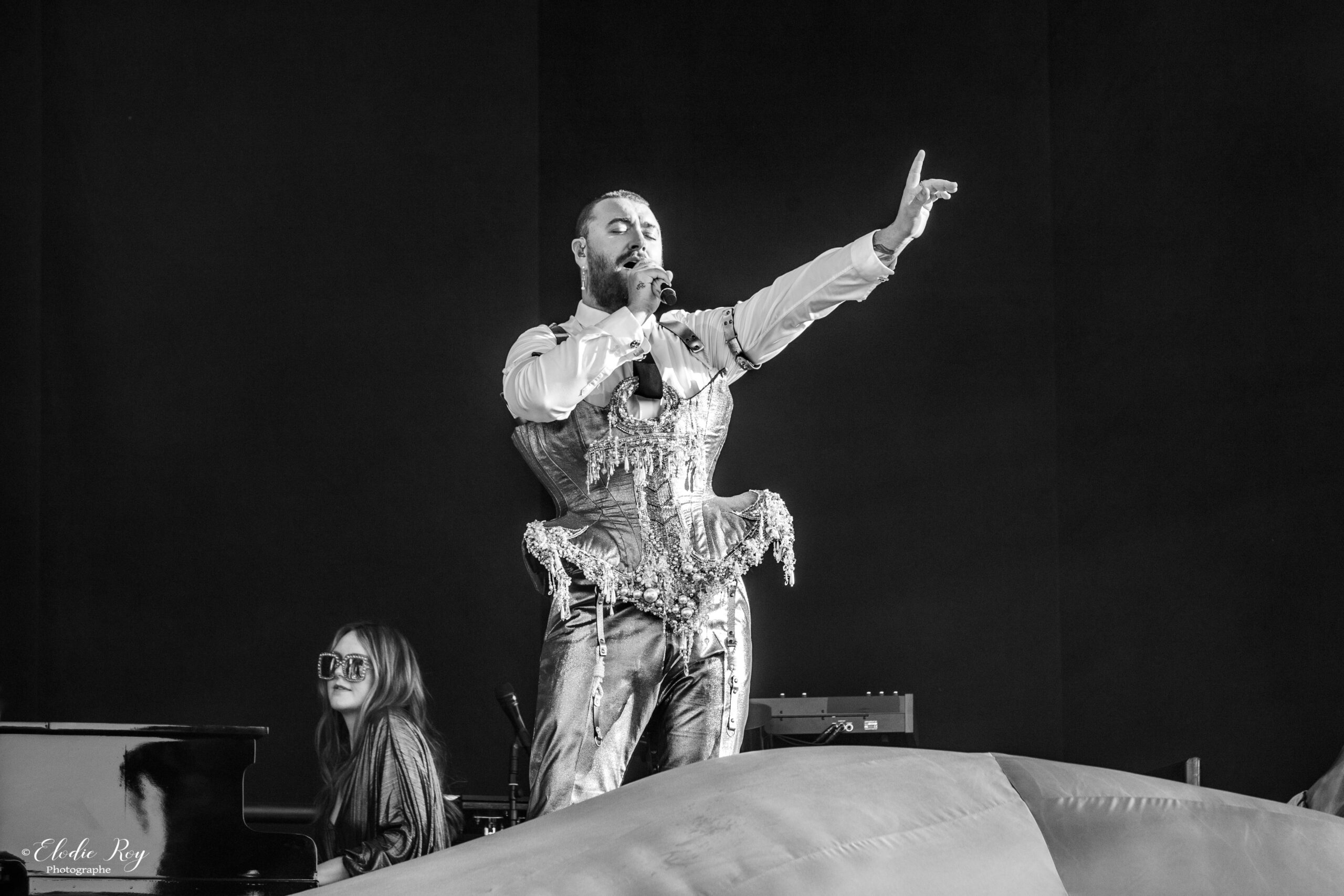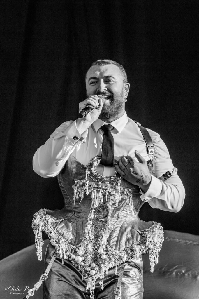 C’est parti pour une heure trente de show avec SAM SMITH. Pas besoin de présentation, tout le monde connait. Iel est devenu.e l’un.e des artistes les plus populaires et modèle pour beaucoup de personnes LGBTQI+ ! Première scénographie de dingue : une statue géante couleur or représentant une personne nue étendue sur toute la scène. Iel commence le show avec son plus grand titre Stay With Me (plus d’un milliard de vues sur YouTube) ! Sur scène, il y a 4 musicien.ne.s, 3 choristes ainsi que 6 dancers. Le public est excité et chante les paroles de chaque chanson. La première partie du concert est plus posée (composée de balades essentiellement autour de la rupture amoureuse). Tandis que la seconde partie est bien différente (composée de titres Pop Dance) comme Lose You, Promises et Unholy. Sam prend le temps de discuter avec le public et annonce que c’est la première fois que ce show est joué à l’extérieur. SAM SMITH résume les valeurs de son show en 3 mots : liberté, amour et fierté !