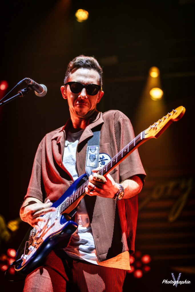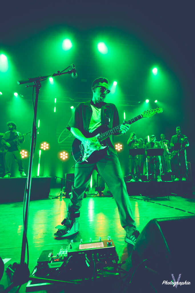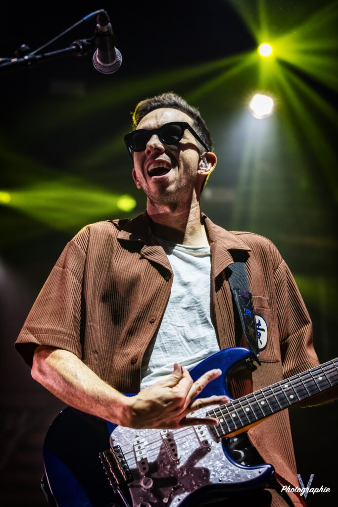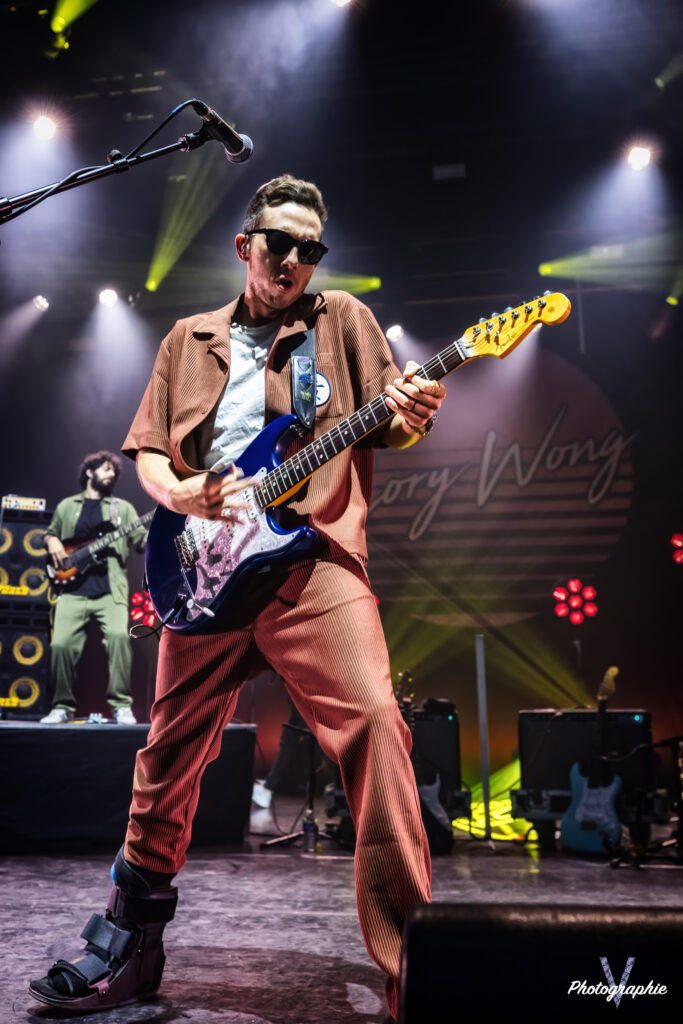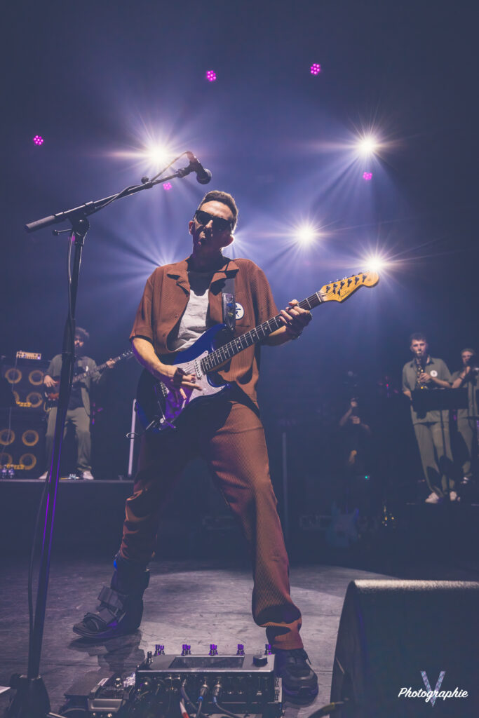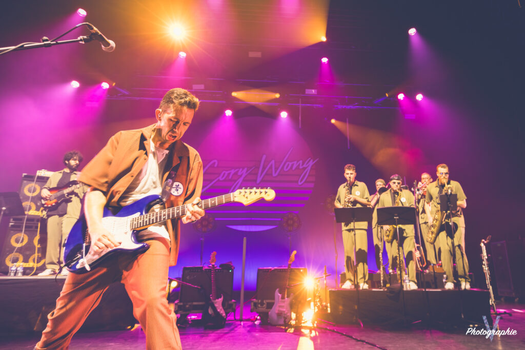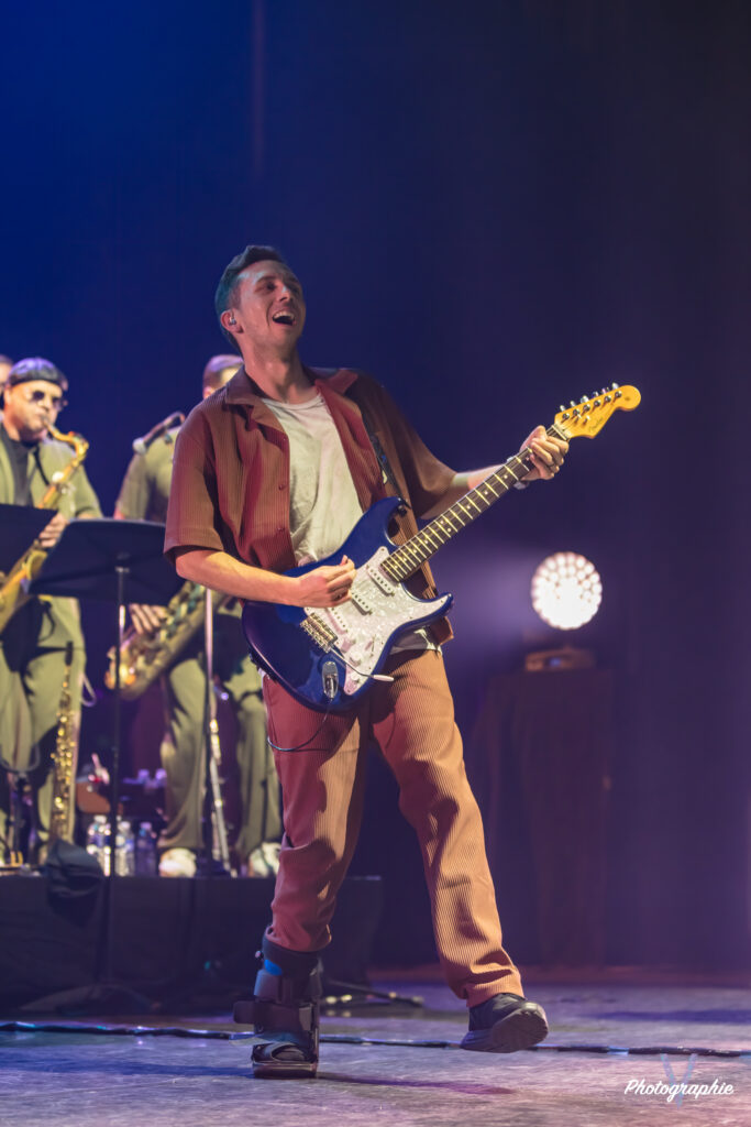 C’est avec un orchestre assez conséquent que Cory débarque batteur, bassiste, clavier et une section de cuivre composé principalement de saxos de toutes les tonalités, d’un trombone et d’une trompette. Au centre de la scène, Cory Wong tient la guitare d’une main de maître malgré un pied bien protégé dans un plâtre nouvelle génération. C’est peut dire que le gars est généreux, il bouge, tout sourire et encourage son public d’un geste, d’une petite pirouette. Ce dernier s’est déplacé en masse et remplit l’Olympia en configuration fosse debout. Il aura fallu jouer des coudes pour atteindre le pit photo.