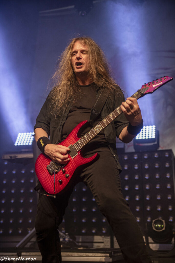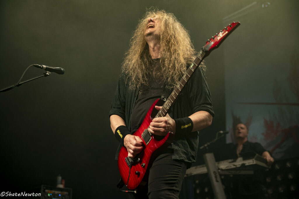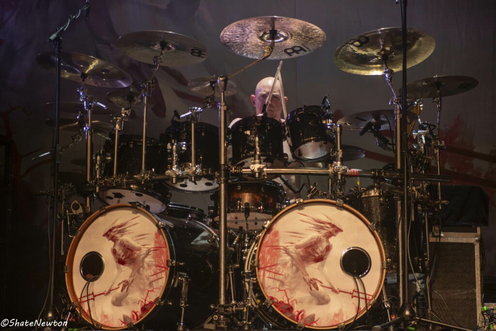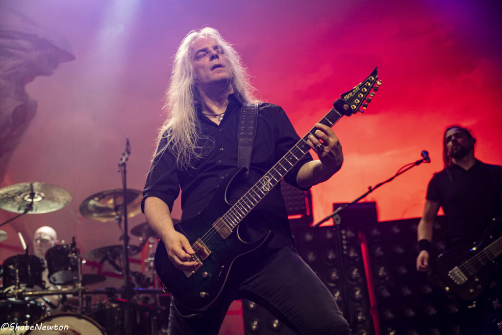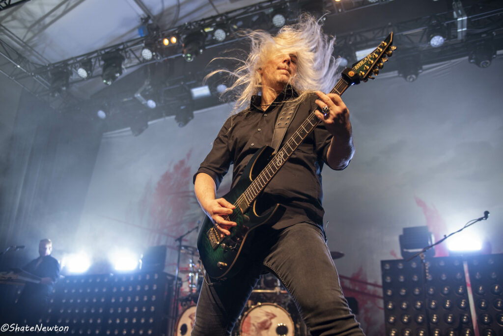 On y est, après toutes ces années de disette pour les salles françaises, les bardes du Metal sont de retour dans l’hexagone. Intro instrumentale sous jeu de lumière projetant l’immanquable dragon de Blind Guardian. Les arrivées commencent comme toujours par Frederik Ehmke (quelqu’un a-t-il déjà vu ce mec porter un truc sur les épaules ???), puis viennent nos amis gratteux André Olbrich (bientôt 40 ans de Blind Guardian) et Marcus Siepen récemment surnommé “The Witcher” avec l’apparition de sa crinière argentée. On n’oublie pas non plus les artistes de sessions avec le nouveau venu Johan van Stratum à la basse et Pat Bender au Clavier depuis plus de 20 ans. Dernier arrivé, mais le plus acclamé, Hansi fait son apparition sous une acclamation assourdissante avant d’ouvrir la set sur Imaginations From the Other Side. De manière générale, Blind Guardian ne fait pas de bling bling dans la mise en scène, on est sur du Epic/Power Metal qui se partage en chœur sur chaque titre que ce soit de manière homérique sur des titres comme Nightfall, Valhalla, Mirror Mirror (pour ne citer qu’eux) ou alors dans une symbiose mystique sur “The Bard’s Song”. Une petite anecdote visuelle tout de même sur le lancement de Secrets of the American Gods avec un changement de flag, la couverture de la jaquette de The God Machine laissant place à celle du box set, tous deux signés de l’artiste Peter Mohrbacher, nom qui parlera évidemment au joueur Magic the Gathering les plus assidus côté artwork. (Tu m’étonnes que la jaquette me faisait penser aux Eldrazis…).