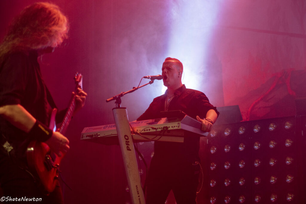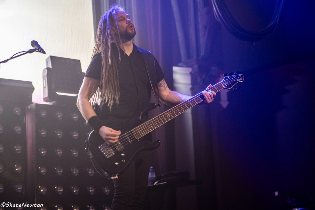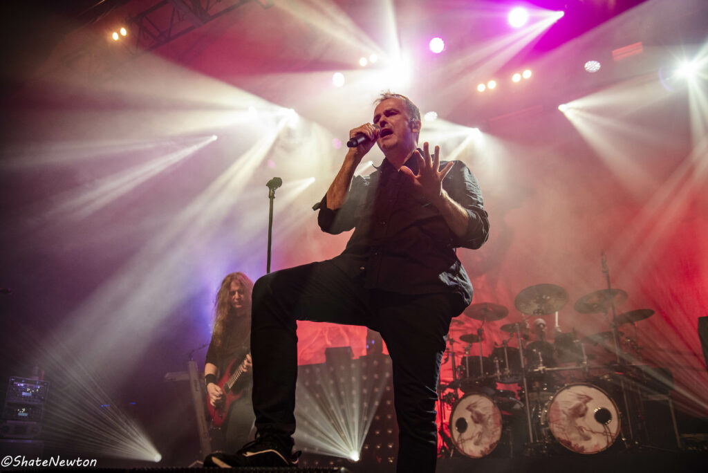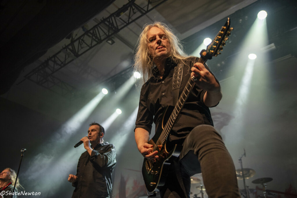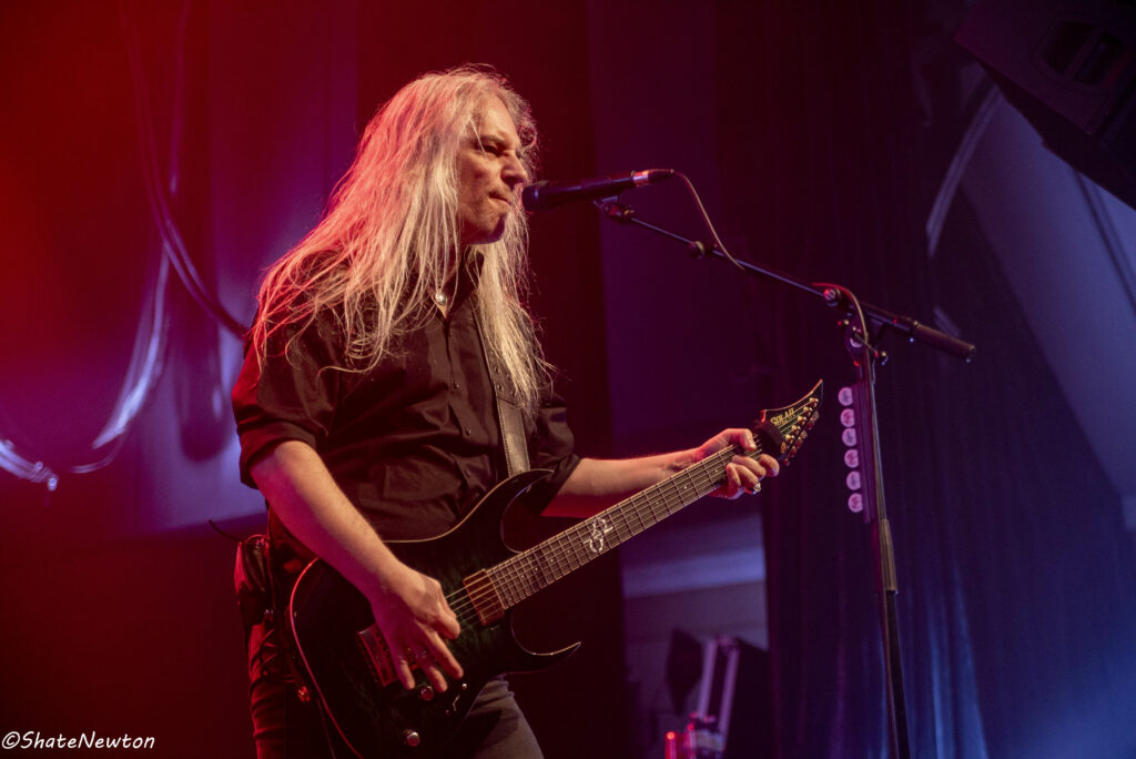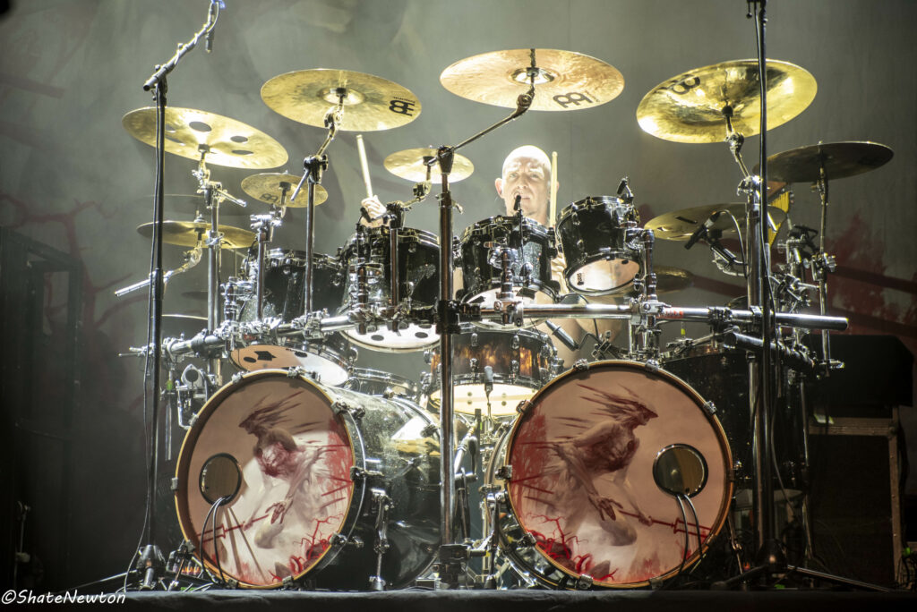 On y est, après toutes ces années de disette pour les salles françaises, les bardes du Metal sont de retour dans l’hexagone. Intro instrumentale sous jeu de lumière projetant l’immanquable dragon de Blind Guardian. Les arrivées commencent comme toujours par Frederik Ehmke (quelqu’un a-t-il déjà vu ce mec porter un truc sur les épaules ???), puis viennent nos amis gratteux André Olbrich (bientôt 40 ans de Blind Guardian) et Marcus Siepen récemment surnommé “The Witcher” avec l’apparition de sa crinière argentée. On n’oublie pas non plus les artistes de sessions avec le nouveau venu Johan van Stratum à la basse et Pat Bender au Clavier depuis plus de 20 ans. Dernier arrivé, mais le plus acclamé, Hansi fait son apparition sous une acclamation assourdissante avant d’ouvrir la set sur Imaginations From the Other Side. De manière générale, Blind Guardian ne fait pas de bling bling dans la mise en scène, on est sur du Epic/Power Metal qui se partage en chœur sur chaque titre que ce soit de manière homérique sur des titres comme Nightfall, Valhalla, Mirror Mirror (pour ne citer qu’eux) ou alors dans une symbiose mystique sur “The Bard’s Song”. Une petite anecdote visuelle tout de même sur le lancement de Secrets of the American Gods avec un changement de flag, la couverture de la jaquette de The God Machine laissant place à celle du box set, tous deux signés de l’artiste Peter Mohrbacher, nom qui parlera évidemment au joueur Magic the Gathering les plus assidus côté artwork. (Tu m’étonnes que la jaquette me faisait penser aux Eldrazis…).
