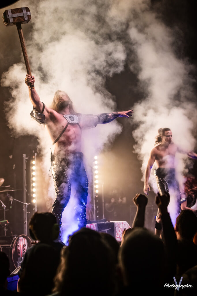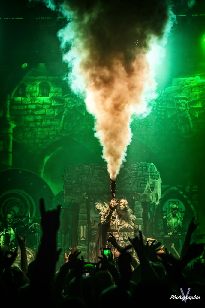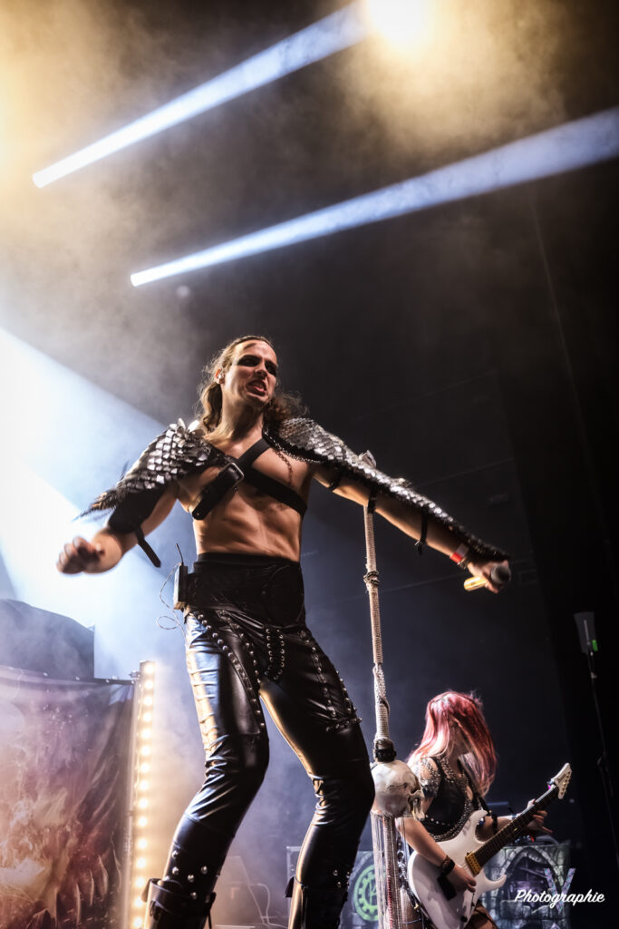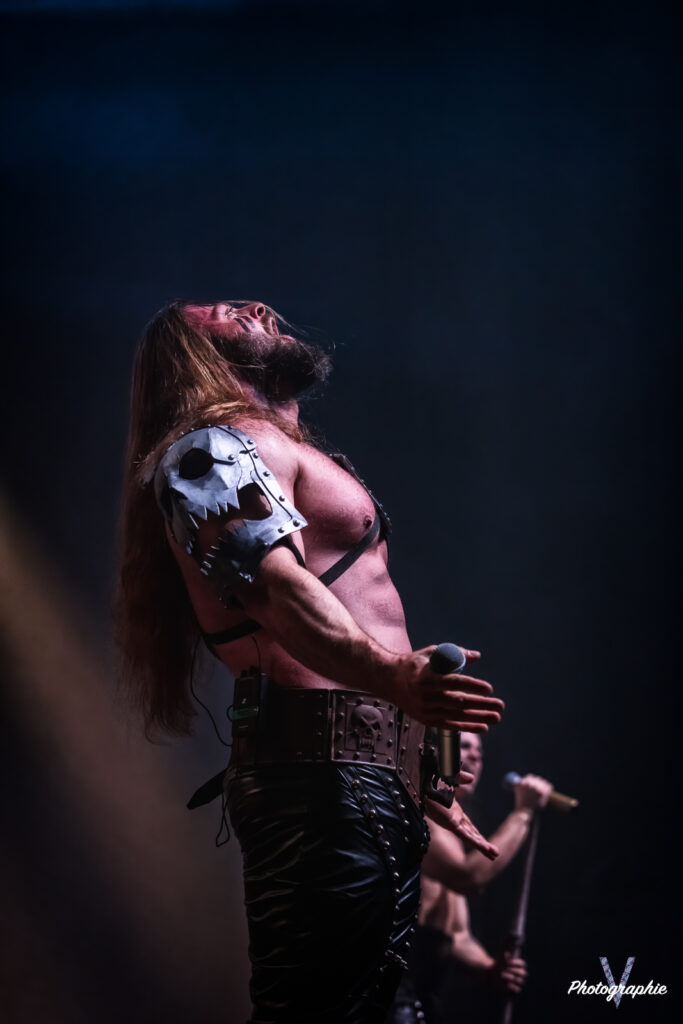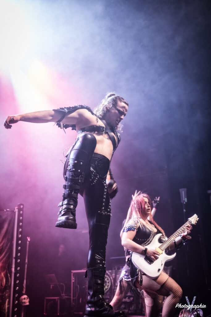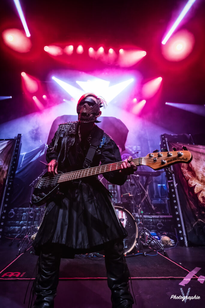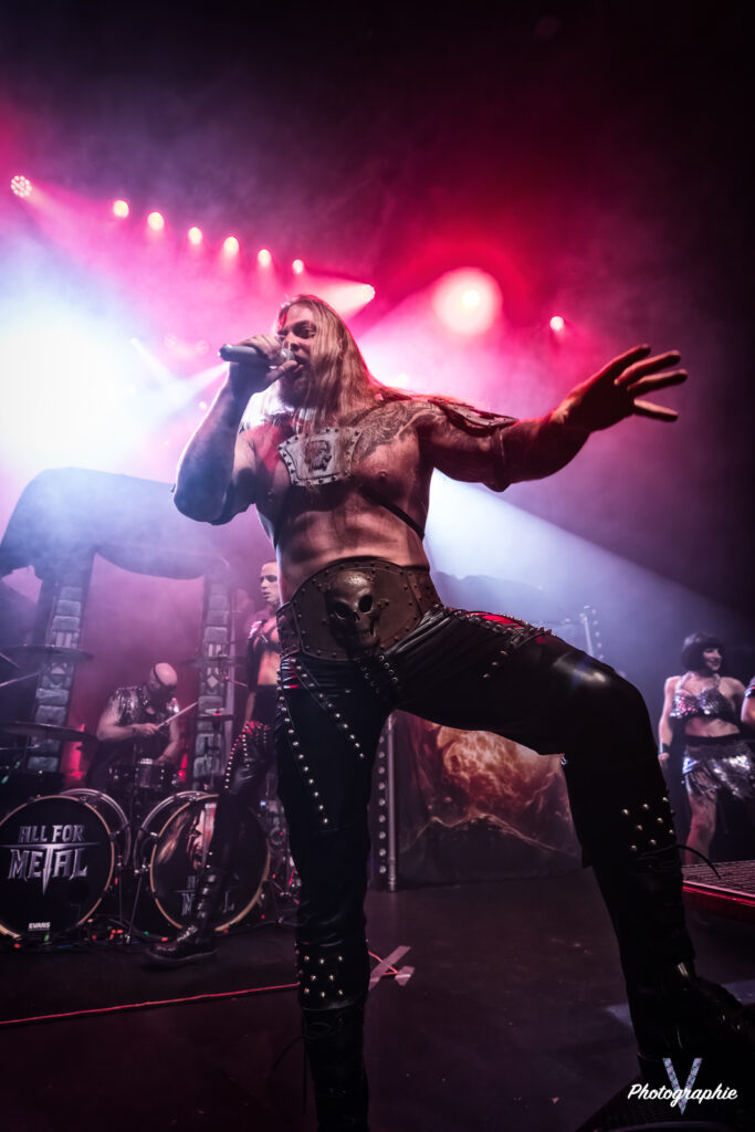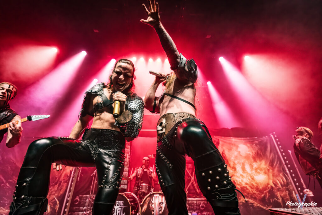 Avec All For Metal que nous découvrons ce soir, c’est une toute autre chanson. Le Heavy Metal à tendance True (pour les néophytes, le True Metal représente la seconde vague de Heavy qui eut son heure de gloire dans les années 2000 avec des groupes comme Hammerfall, les paroles sont souvent épiques sur des thèmes Fantasy) des germains va faire des miracles ce soir sur le public du Forum. Niveau look, on est pas mal sur l’imaginaire Conan, les paroles pour le peu qu’on y a prêté attention parlent plutôt des dieux nordiques et des légendes du même acabit. Sur scène il y a du monde, deux chanteurs dont un monté comme une armoire qui s’est en plus dessiné de faux abdos sur le ventre. Effet garanti ! Ensuite on a un et une guitariste (avant elles étaient deux filles pour tripoter les cordes mais en 2023 le line up a évolué) pour tenir les côtés de la scène. Le bassiste quant à lui est masqué et joue parfaitement son rôle de croque-mort sorcier (il arrive sur scène avec une lanterne en forme de crâne fumant), le batteur est également caché par un masque. En sus, nous avons deux danseuses qui viendront mettre le feu sur les plateformes. La musique est énergique, les chanteurs prennent beaucoup la parole entre chaque titre pour maintenir l’attention du public, ça joue bien, ça bouge bien, c’est un show bien huilé en somme. Vu la longueur du set, la présence des All For Metal tient presque de la co-tête d’affiche. Une belle surprise qui dans le cœur de certains spectateurs a quasiment volé la vedette à Lordi.
