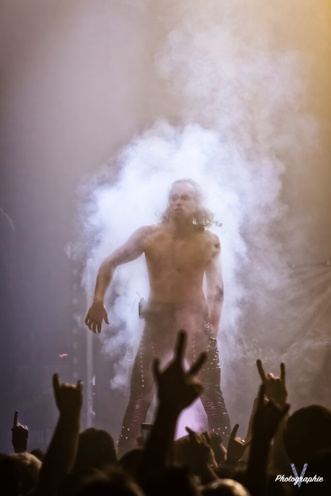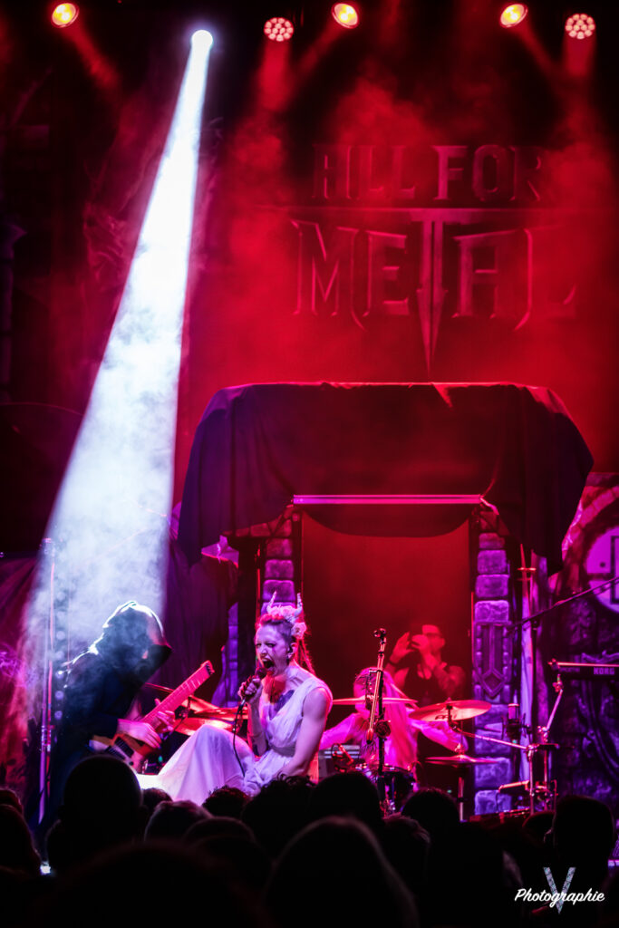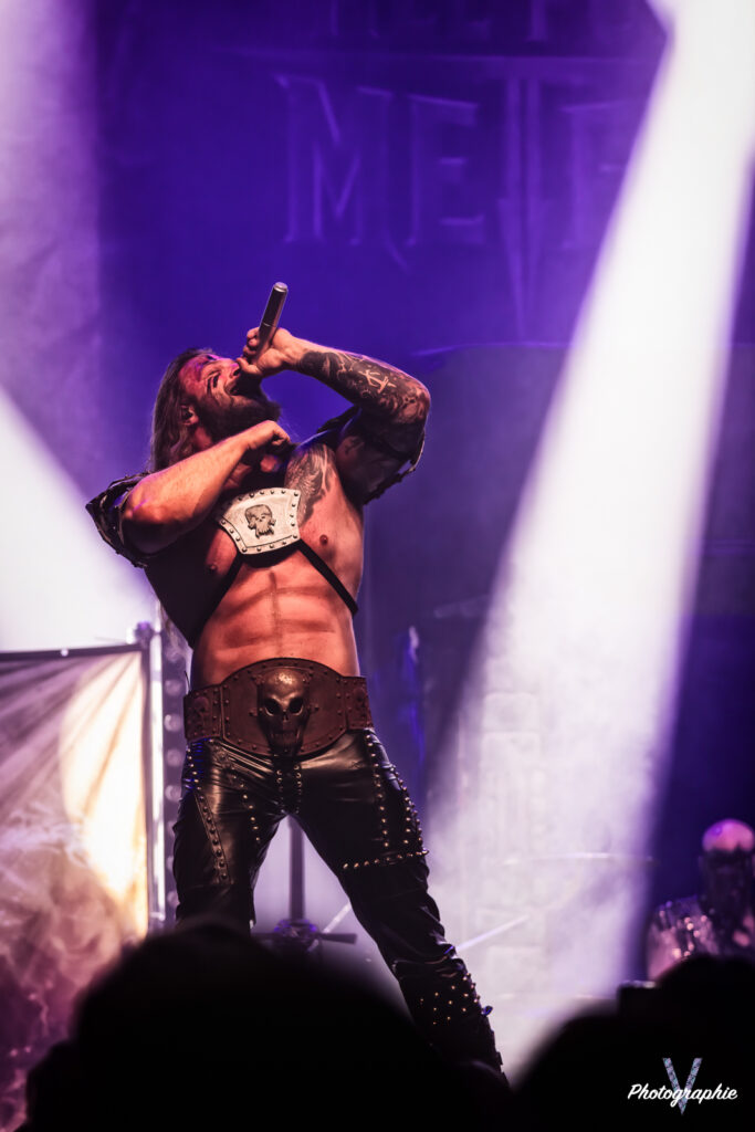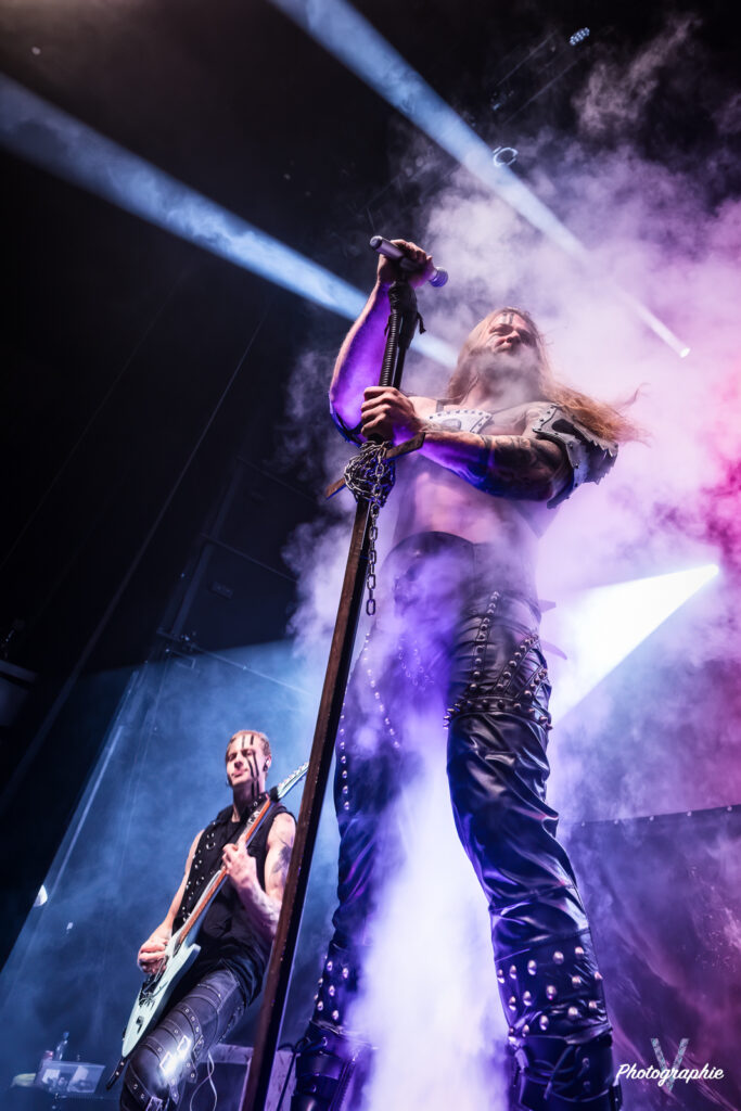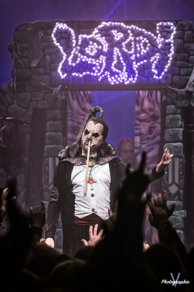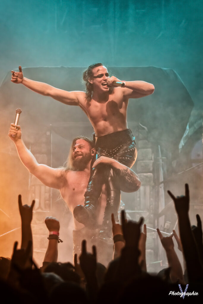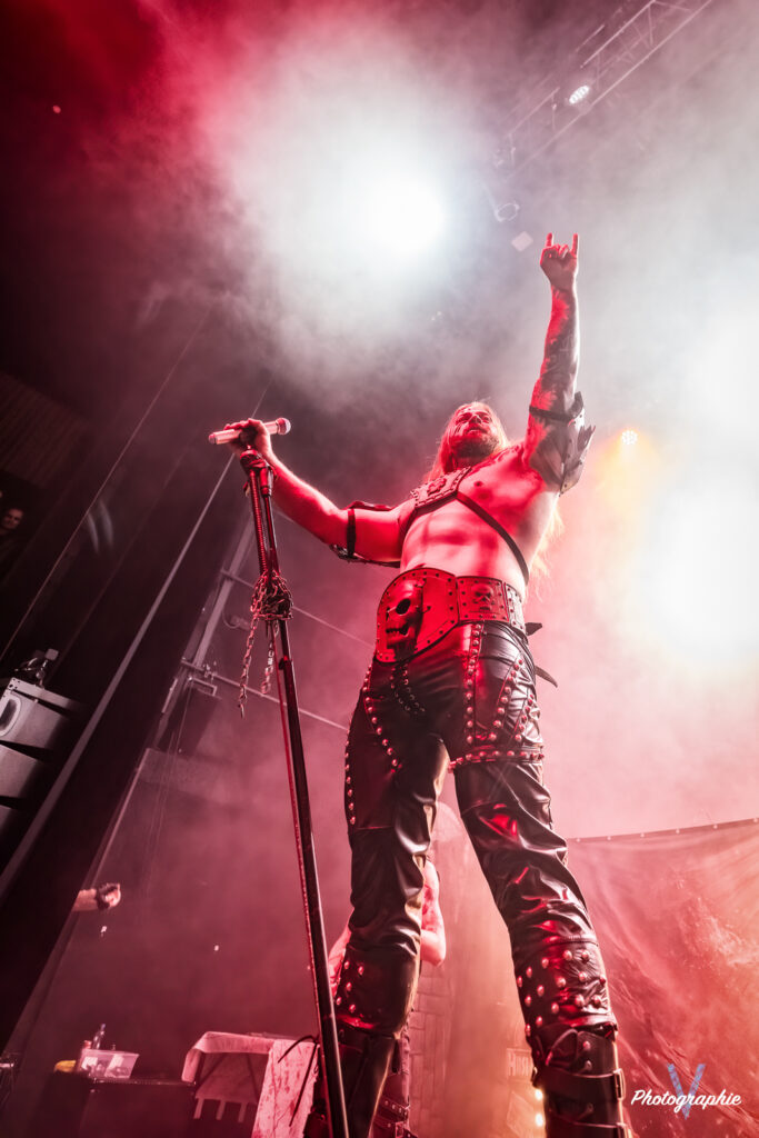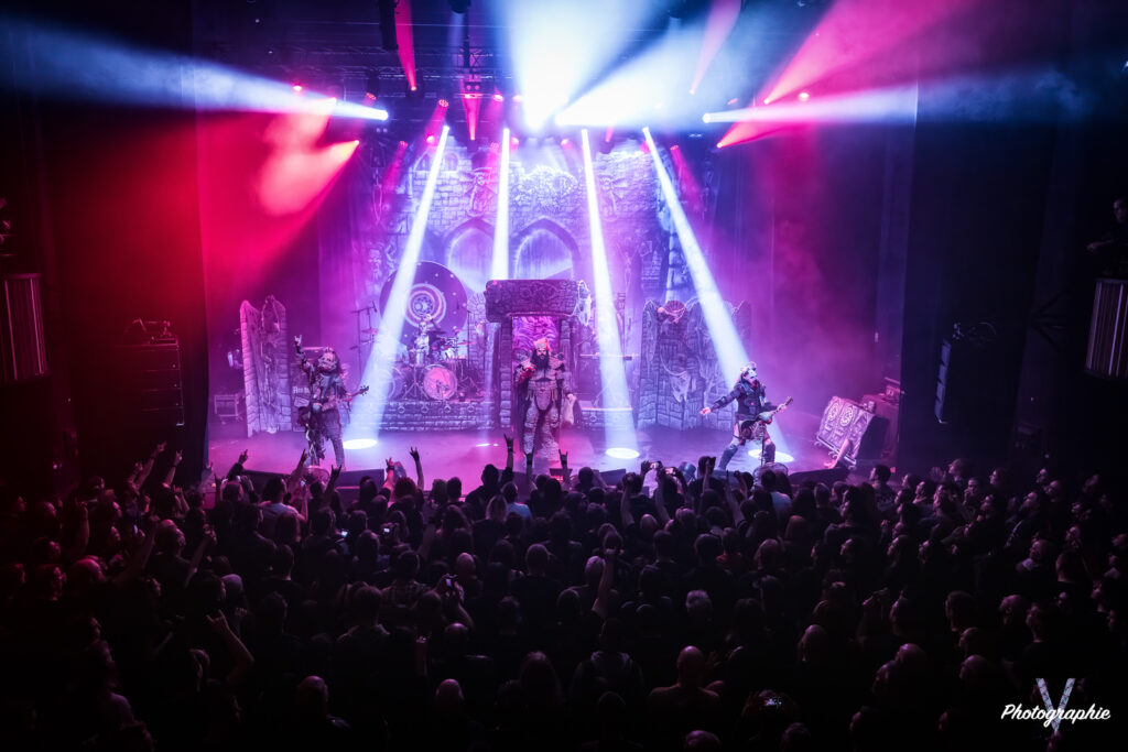 Avec All For Metal que nous découvrons ce soir, c’est une toute autre chanson. Le Heavy Metal à tendance True (pour les néophytes, le True Metal représente la seconde vague de Heavy qui eut son heure de gloire dans les années 2000 avec des groupes comme Hammerfall, les paroles sont souvent épiques sur des thèmes Fantasy) des germains va faire des miracles ce soir sur le public du Forum. Niveau look, on est pas mal sur l’imaginaire Conan, les paroles pour le peu qu’on y a prêté attention parlent plutôt des dieux nordiques et des légendes du même acabit. Sur scène il y a du monde, deux chanteurs dont un monté comme une armoire qui s’est en plus dessiné de faux abdos sur le ventre. Effet garanti ! Ensuite on a un et une guitariste (avant elles étaient deux filles pour tripoter les cordes mais en 2023 le line up a évolué) pour tenir les côtés de la scène. Le bassiste quant à lui est masqué et joue parfaitement son rôle de croque-mort sorcier (il arrive sur scène avec une lanterne en forme de crâne fumant), le batteur est également caché par un masque. En sus, nous avons deux danseuses qui viendront mettre le feu sur les plateformes. La musique est énergique, les chanteurs prennent beaucoup la parole entre chaque titre pour maintenir l’attention du public, ça joue bien, ça bouge bien, c’est un show bien huilé en somme. Vu la longueur du set, la présence des All For Metal tient presque de la co-tête d’affiche. Une belle surprise qui dans le cœur de certains spectateurs a quasiment volé la vedette à Lordi.