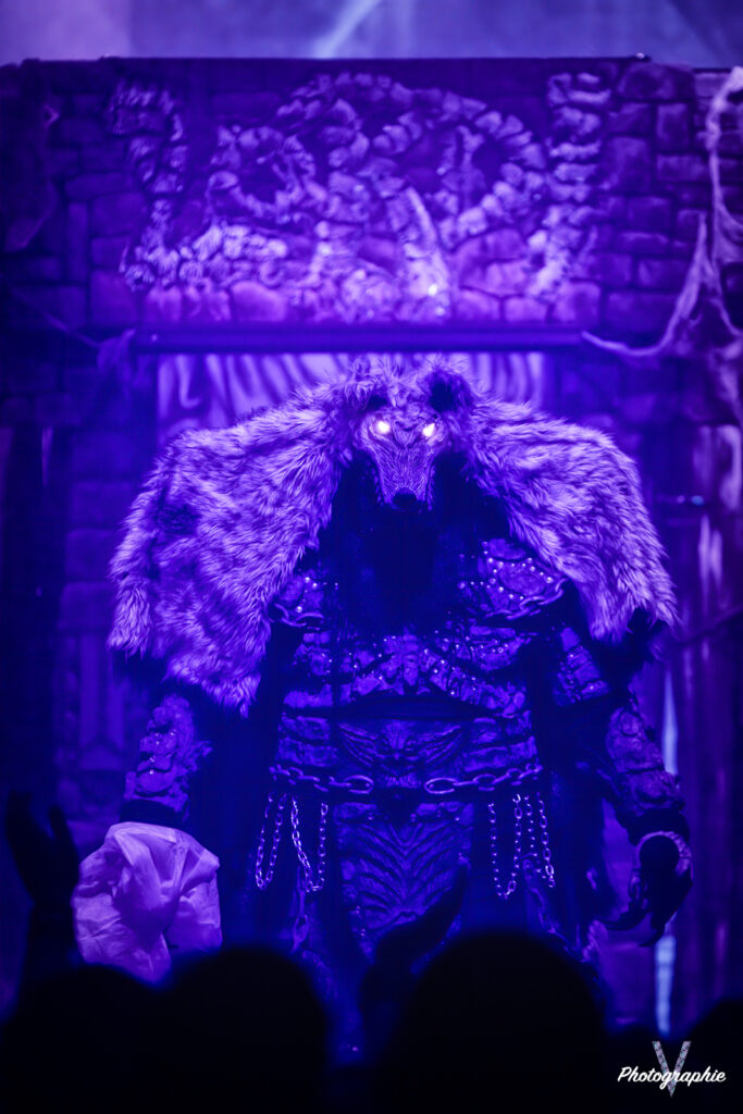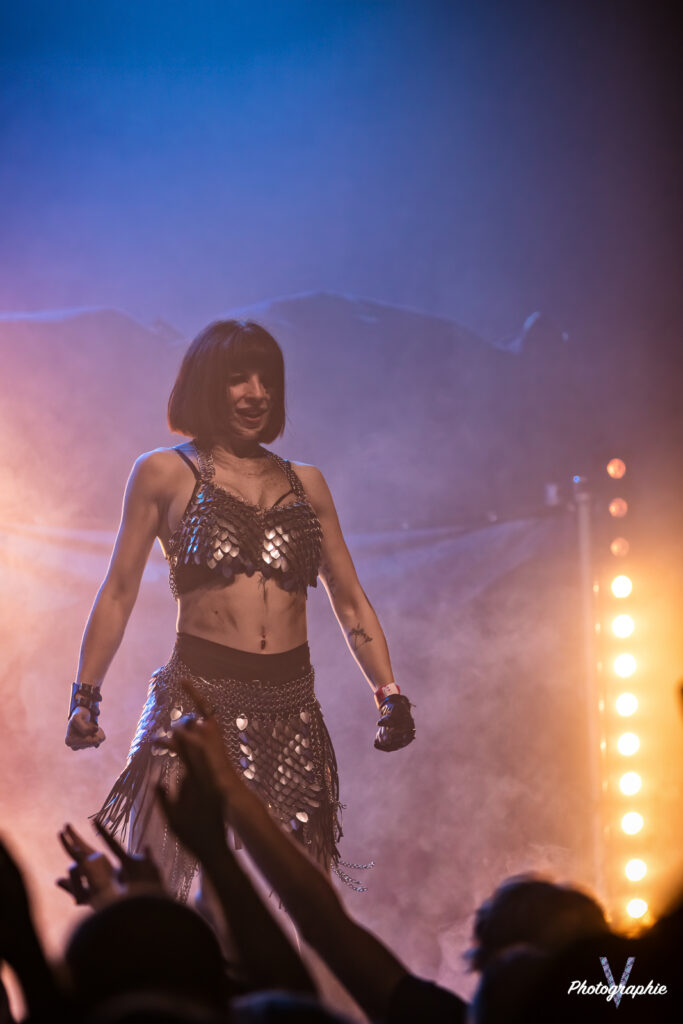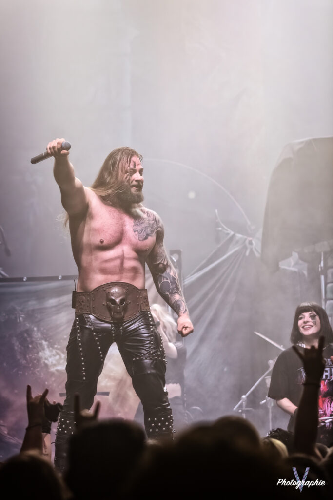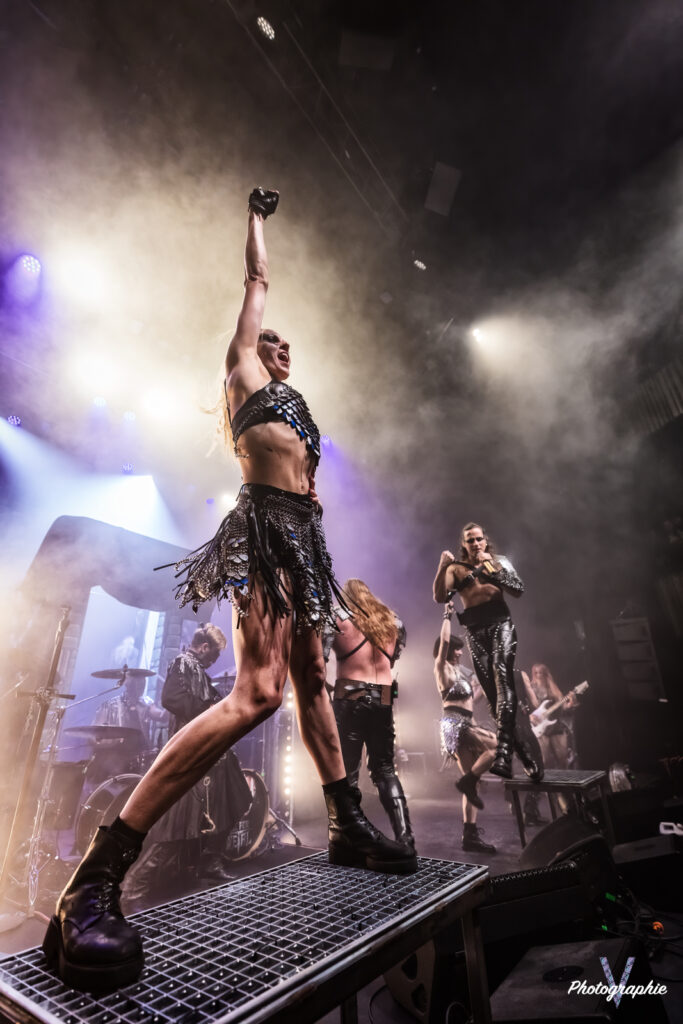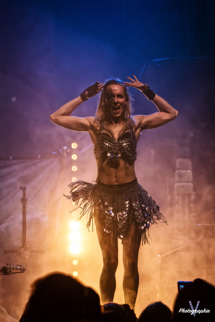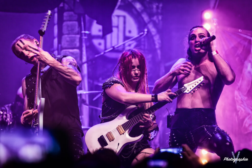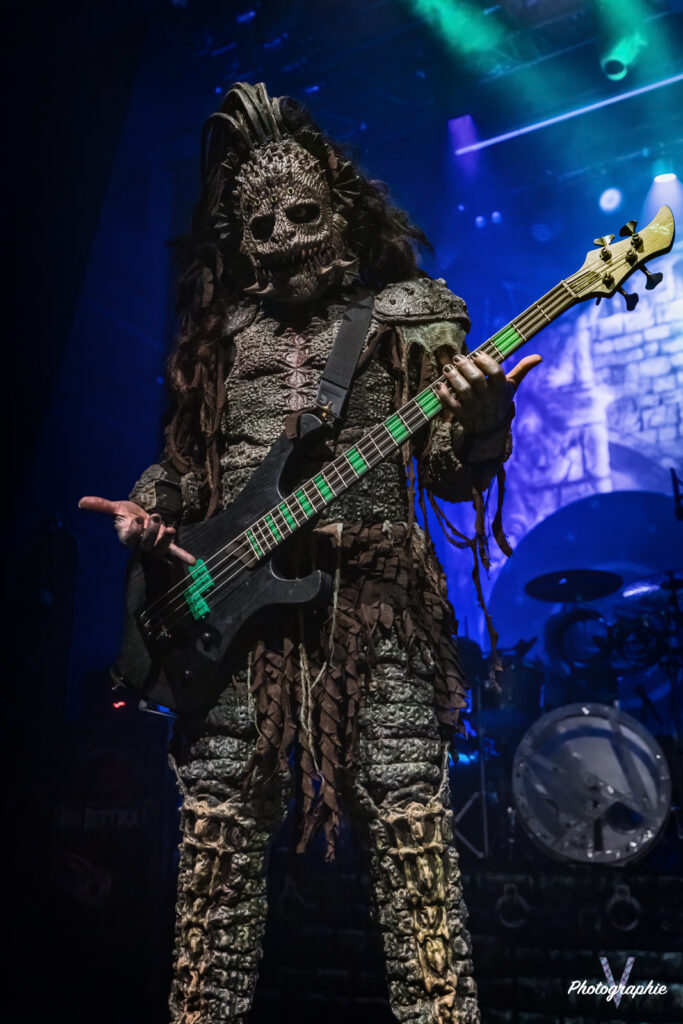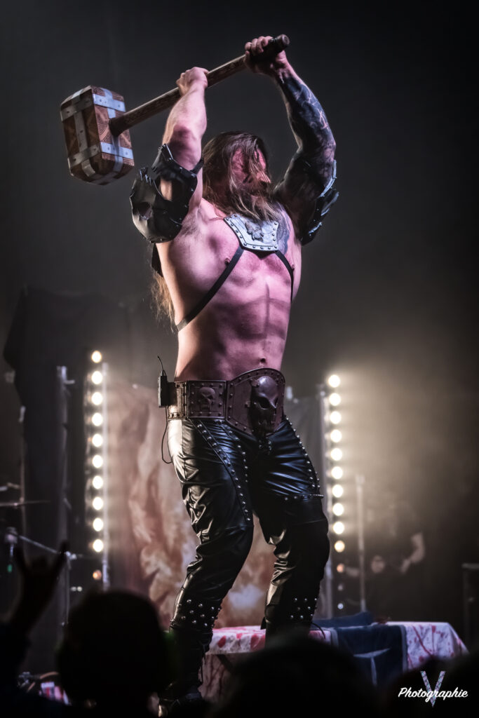 Avec All For Metal que nous découvrons ce soir, c’est une toute autre chanson. Le Heavy Metal à tendance True (pour les néophytes, le True Metal représente la seconde vague de Heavy qui eut son heure de gloire dans les années 2000 avec des groupes comme Hammerfall, les paroles sont souvent épiques sur des thèmes Fantasy) des germains va faire des miracles ce soir sur le public du Forum. Niveau look, on est pas mal sur l’imaginaire Conan, les paroles pour le peu qu’on y a prêté attention parlent plutôt des dieux nordiques et des légendes du même acabit. Sur scène il y a du monde, deux chanteurs dont un monté comme une armoire qui s’est en plus dessiné de faux abdos sur le ventre. Effet garanti ! Ensuite on a un et une guitariste (avant elles étaient deux filles pour tripoter les cordes mais en 2023 le line up a évolué) pour tenir les côtés de la scène. Le bassiste quant à lui est masqué et joue parfaitement son rôle de croque-mort sorcier (il arrive sur scène avec une lanterne en forme de crâne fumant), le batteur est également caché par un masque. En sus, nous avons deux danseuses qui viendront mettre le feu sur les plateformes. La musique est énergique, les chanteurs prennent beaucoup la parole entre chaque titre pour maintenir l’attention du public, ça joue bien, ça bouge bien, c’est un show bien huilé en somme. Vu la longueur du set, la présence des All For Metal tient presque de la co-tête d’affiche. Une belle surprise qui dans le cœur de certains spectateurs a quasiment volé la vedette à Lordi.