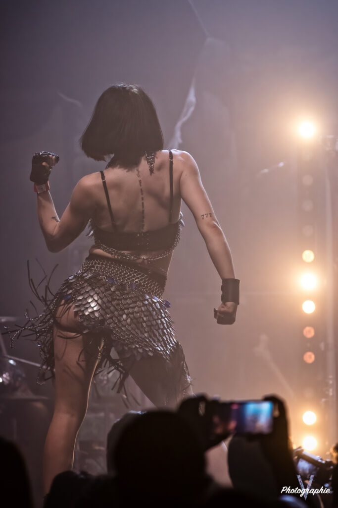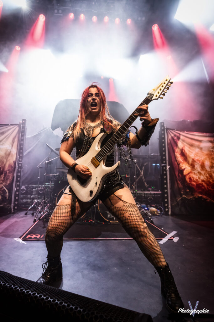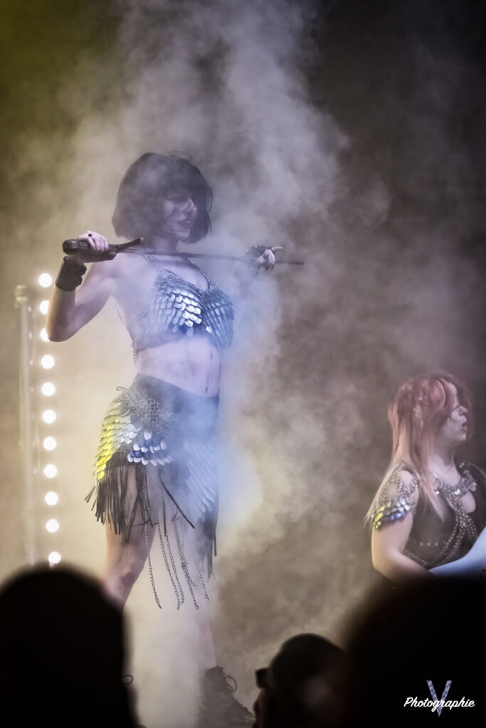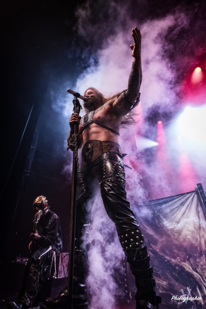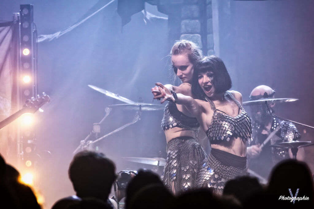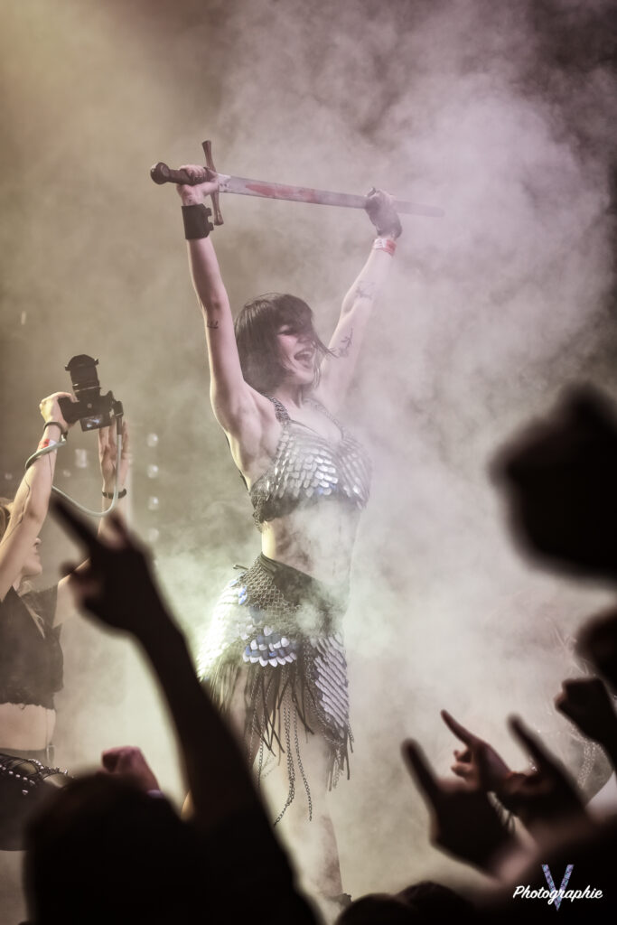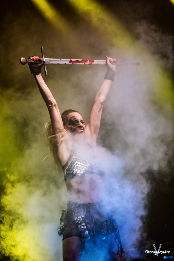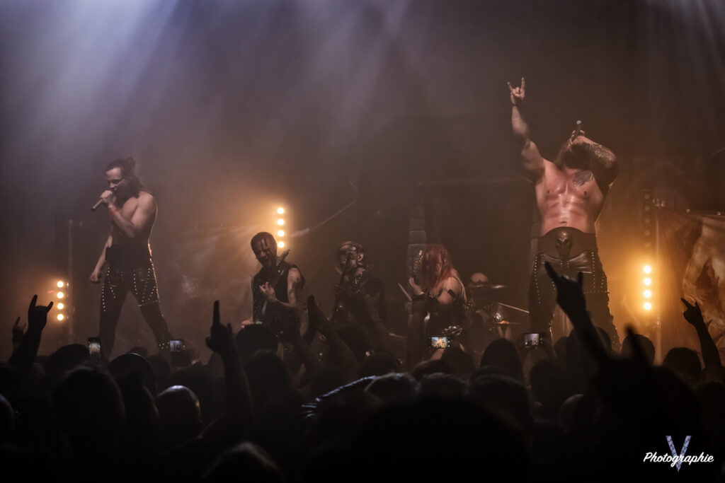 Avec All For Metal que nous découvrons ce soir, c’est une toute autre chanson. Le Heavy Metal à tendance True (pour les néophytes, le True Metal représente la seconde vague de Heavy qui eut son heure de gloire dans les années 2000 avec des groupes comme Hammerfall, les paroles sont souvent épiques sur des thèmes Fantasy) des germains va faire des miracles ce soir sur le public du Forum. Niveau look, on est pas mal sur l’imaginaire Conan, les paroles pour le peu qu’on y a prêté attention parlent plutôt des dieux nordiques et des légendes du même acabit. Sur scène il y a du monde, deux chanteurs dont un monté comme une armoire qui s’est en plus dessiné de faux abdos sur le ventre. Effet garanti ! Ensuite on a un et une guitariste (avant elles étaient deux filles pour tripoter les cordes mais en 2023 le line up a évolué) pour tenir les côtés de la scène. Le bassiste quant à lui est masqué et joue parfaitement son rôle de croque-mort sorcier (il arrive sur scène avec une lanterne en forme de crâne fumant), le batteur est également caché par un masque. En sus, nous avons deux danseuses qui viendront mettre le feu sur les plateformes. La musique est énergique, les chanteurs prennent beaucoup la parole entre chaque titre pour maintenir l’attention du public, ça joue bien, ça bouge bien, c’est un show bien huilé en somme. Vu la longueur du set, la présence des All For Metal tient presque de la co-tête d’affiche. Une belle surprise qui dans le cœur de certains spectateurs a quasiment volé la vedette à Lordi.