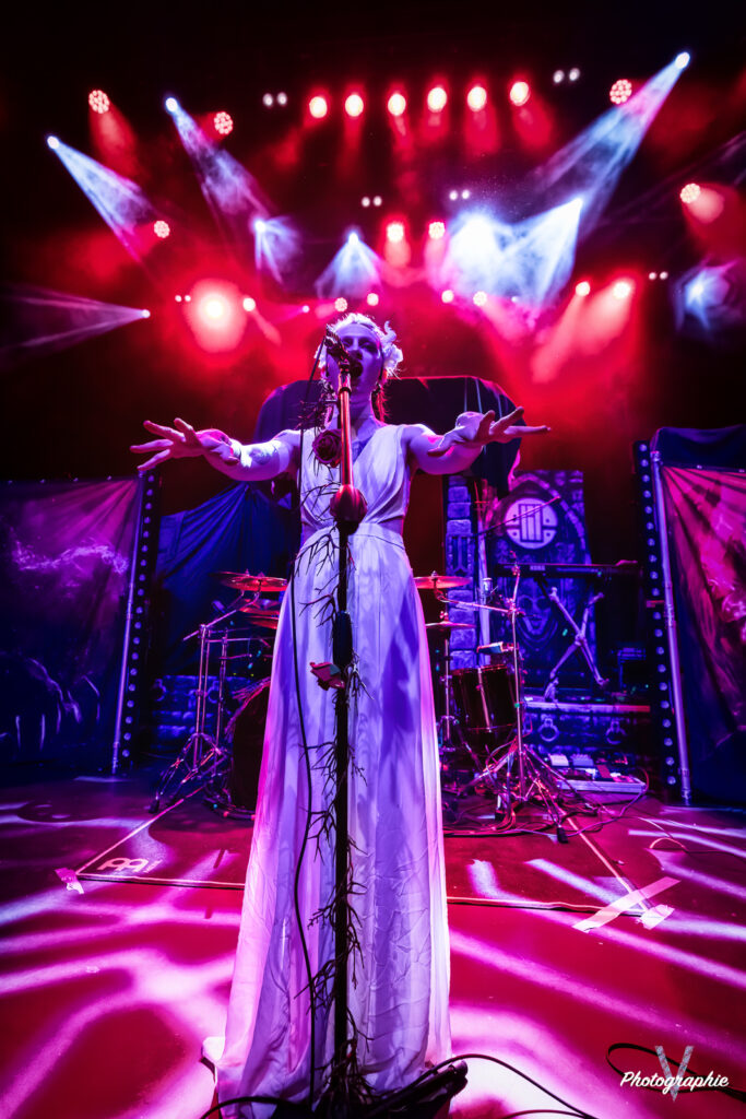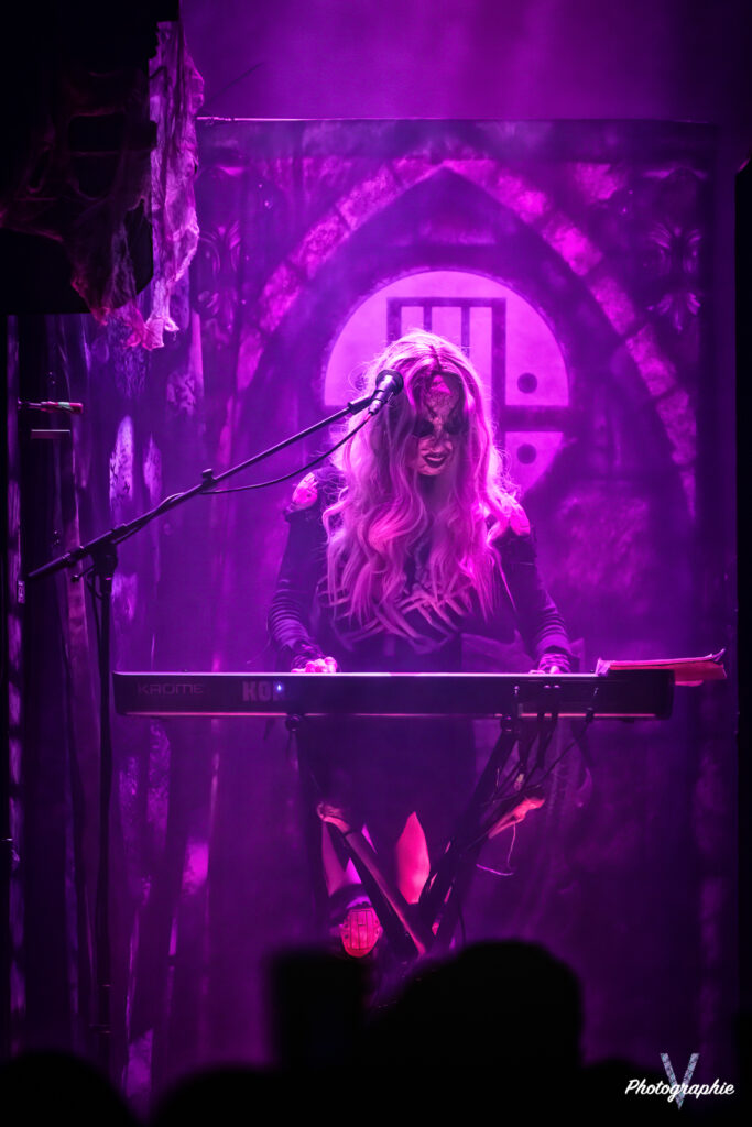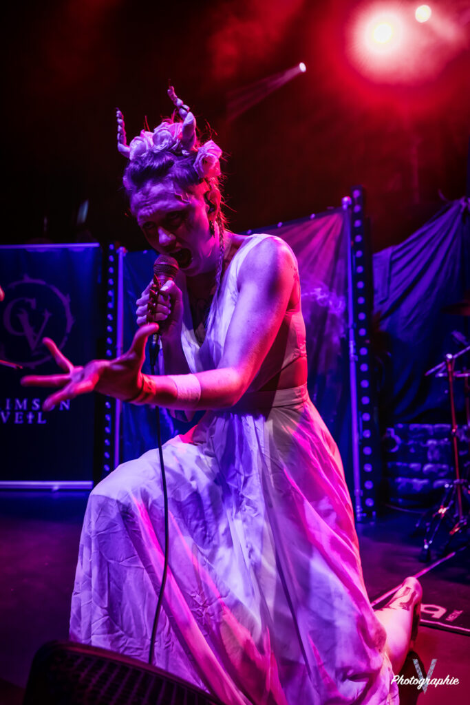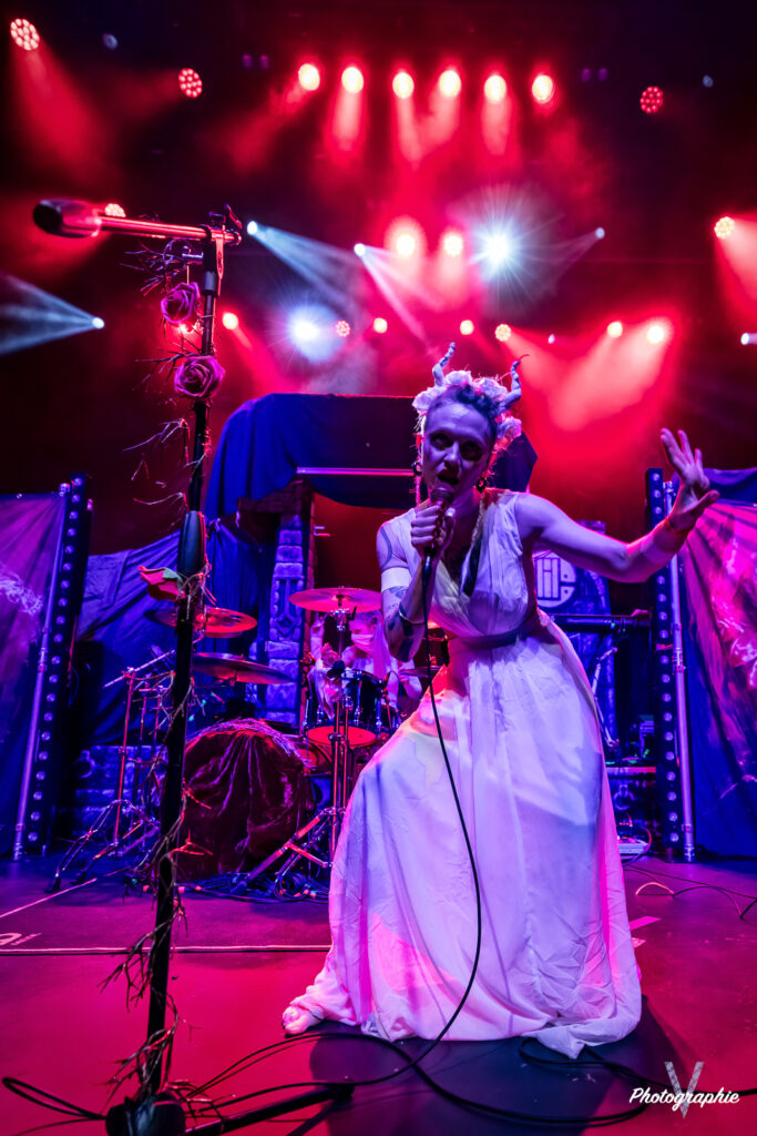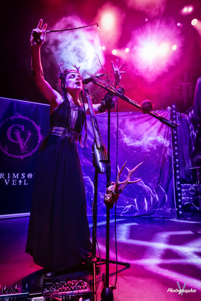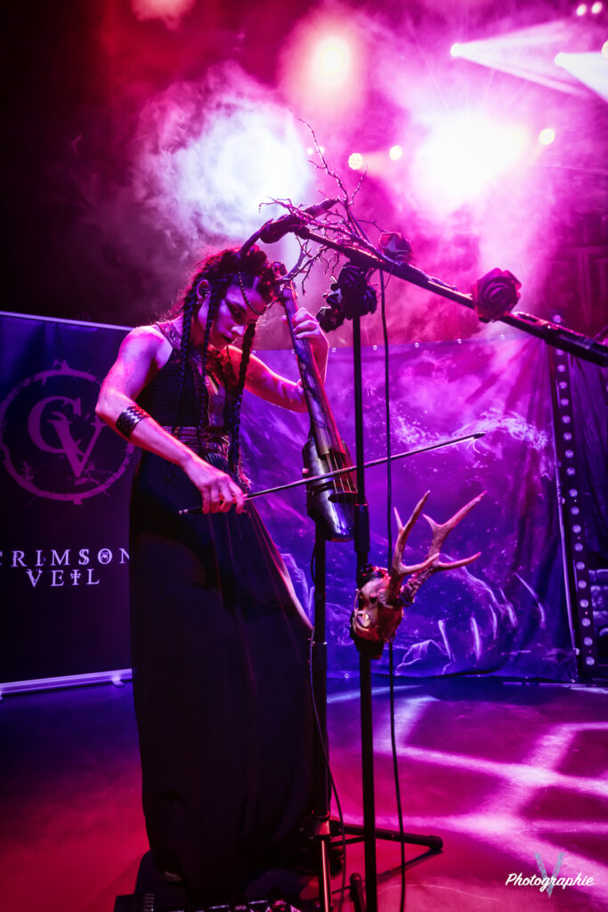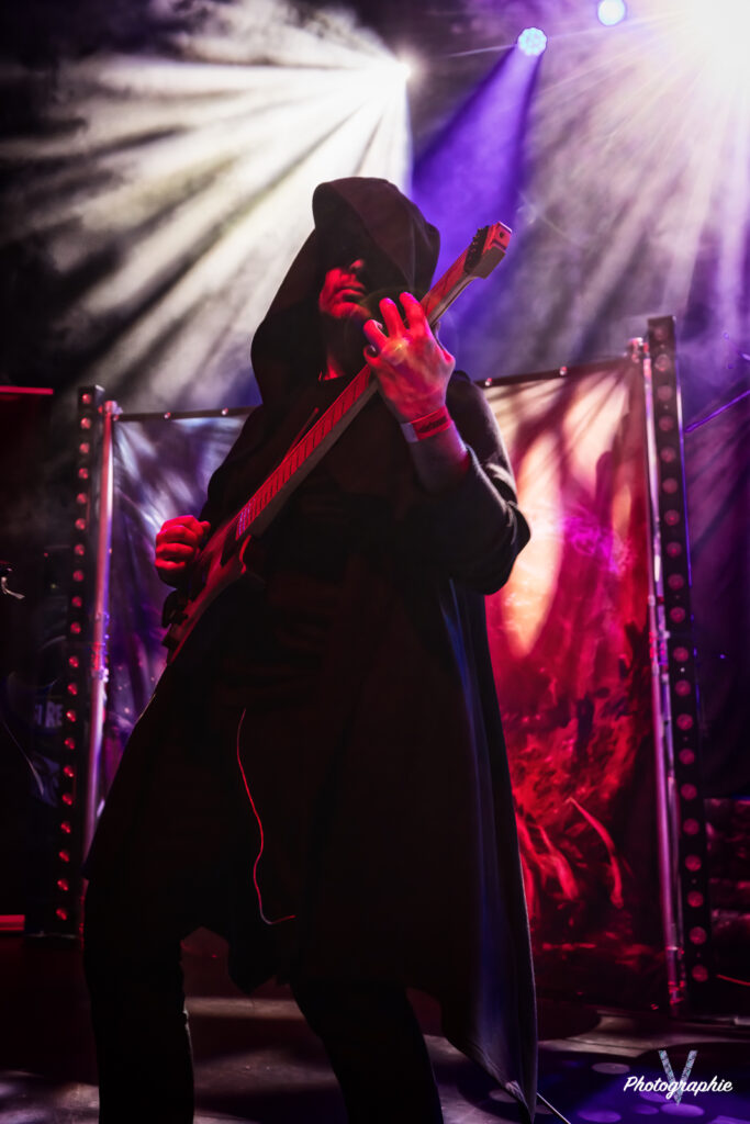 Pour Crimson Veil cette tournée c’est un peu une première expérience puisqu’on apprend que le groupe joue aujourd’hui son troisième concert depuis sa création. Et quelque part ça nous rassure un peu car même si on sent une grosse implication de la chanteuse du quatuor tout n’est pas encore vraiment au point. On ne jugera pas des compositions ce soir mais de la manière de les mettre en scène. On sent encore un groupe fragile avec une batteuse qui s’applique tellement qu’on perçoit comme une retenue dans sa manière de jouer. D’un côté de la scène, nous avons une violoncelliste qui joue dans son coin et semble un peu s’ennuyer. Même si le style musical n’a rien de festif, un peu plus d’engagement serait bienvenu. De l’autre côté de la scène on a un guitariste encapuchonné avec une guitare de shredder qui a gardé ses lunettes. On dirait presque qu’il s’est trompé de groupe. Pourtant sur les photos officielles, il a un maquillage et pas de lunettes. Problème de timing dans les loges ? Flemme ? Dans un groupe où tout le monde est looké et où cet aspect semble primordial c’est dommage de jouer les vilains petits canards en ne jouant pas le jeu.