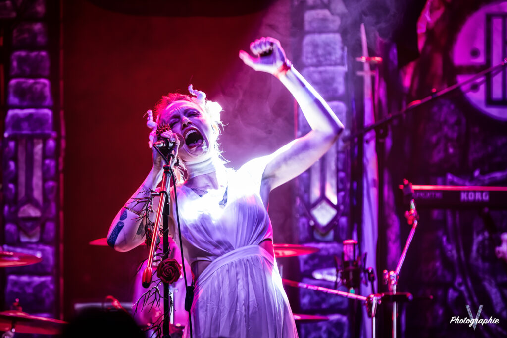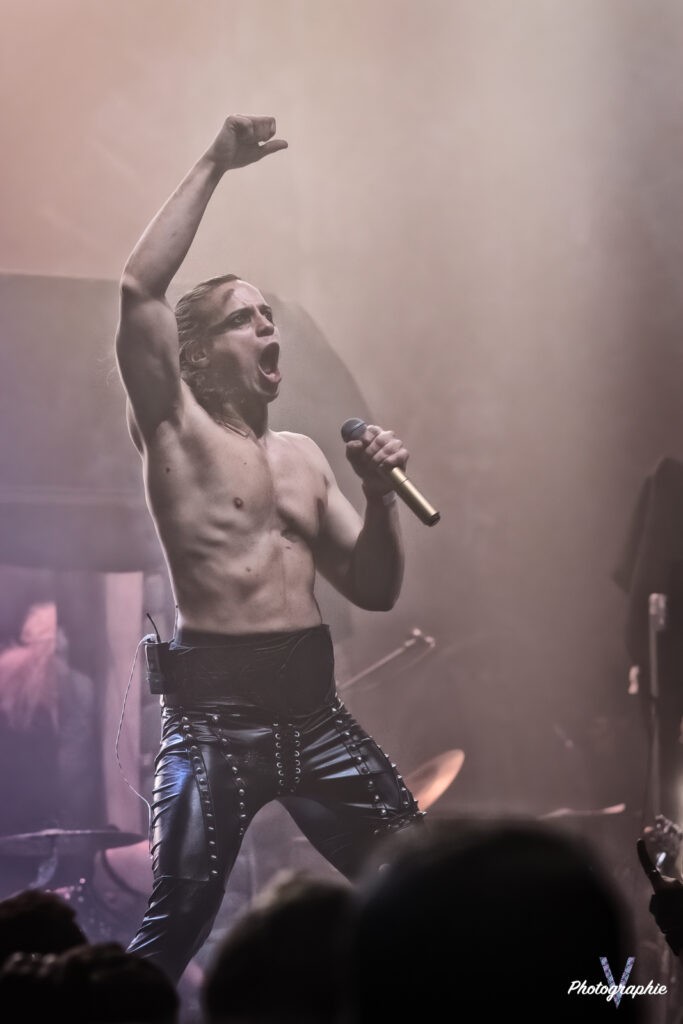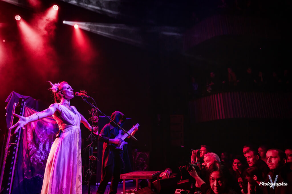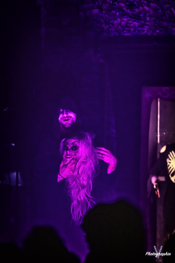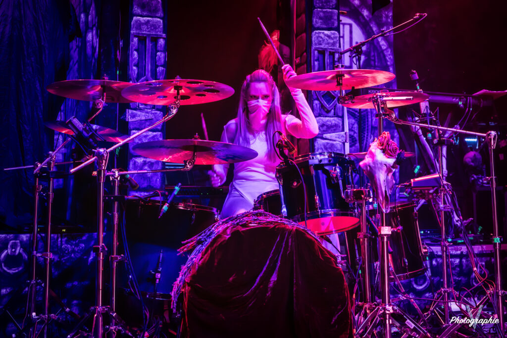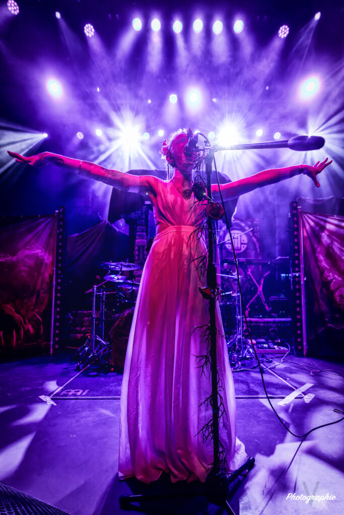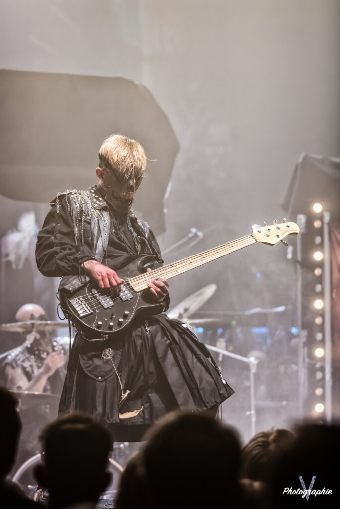 Pour Crimson Veil cette tournée c’est un peu une première expérience puisqu’on apprend que le groupe joue aujourd’hui son troisième concert depuis sa création. Et quelque part ça nous rassure un peu car même si on sent une grosse implication de la chanteuse du quatuor tout n’est pas encore vraiment au point. On ne jugera pas des compositions ce soir mais de la manière de les mettre en scène. On sent encore un groupe fragile avec une batteuse qui s’applique tellement qu’on perçoit comme une retenue dans sa manière de jouer. D’un côté de la scène, nous avons une violoncelliste qui joue dans son coin et semble un peu s’ennuyer. Même si le style musical n’a rien de festif, un peu plus d’engagement serait bienvenu. De l’autre côté de la scène on a un guitariste encapuchonné avec une guitare de shredder qui a gardé ses lunettes. On dirait presque qu’il s’est trompé de groupe. Pourtant sur les photos officielles, il a un maquillage et pas de lunettes. Problème de timing dans les loges ? Flemme ? Dans un groupe où tout le monde est looké et où cet aspect semble primordial c’est dommage de jouer les vilains petits canards en ne jouant pas le jeu.