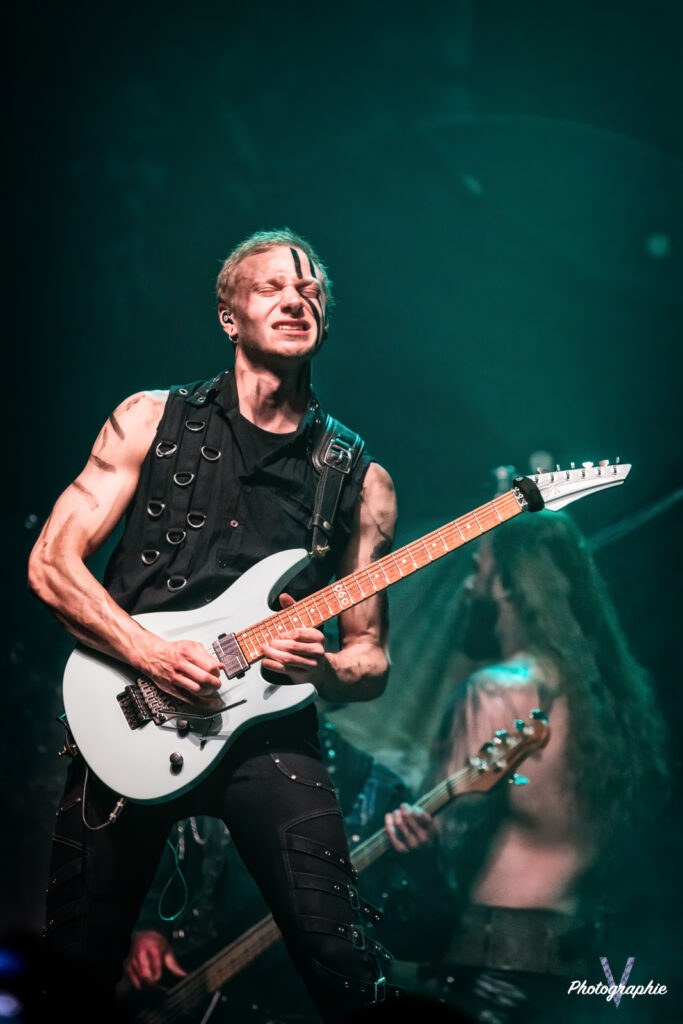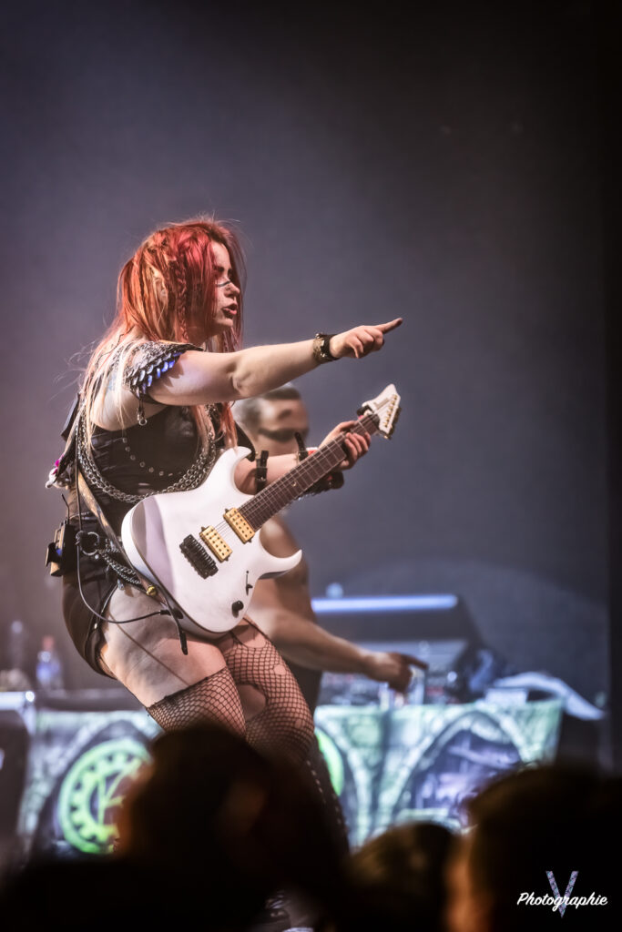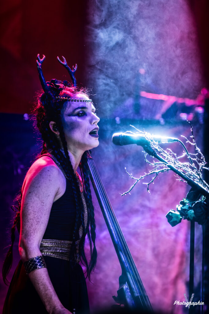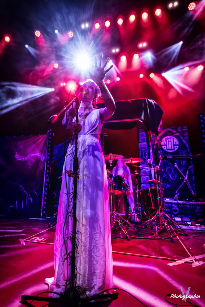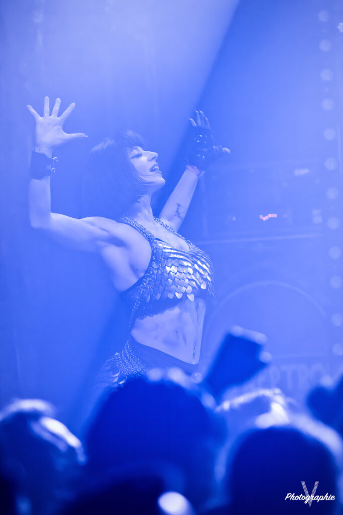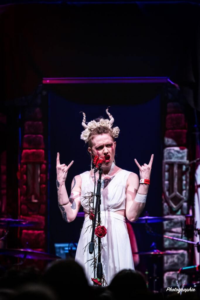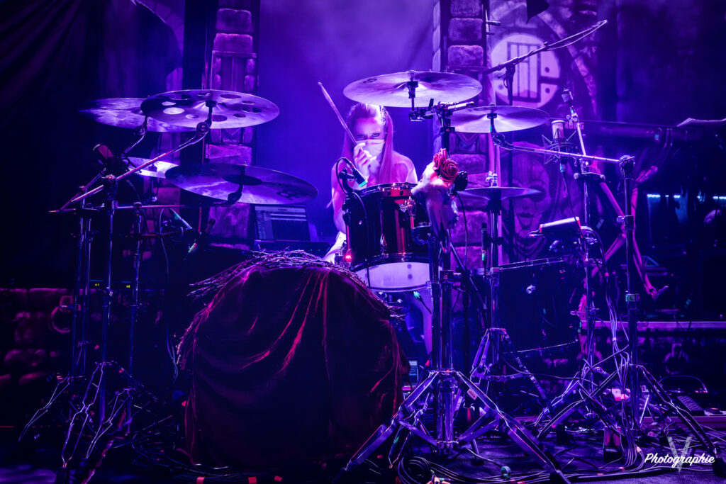 Pour Crimson Veil cette tournée c’est un peu une première expérience puisqu’on apprend que le groupe joue aujourd’hui son troisième concert depuis sa création. Et quelque part ça nous rassure un peu car même si on sent une grosse implication de la chanteuse du quatuor tout n’est pas encore vraiment au point. On ne jugera pas des compositions ce soir mais de la manière de les mettre en scène. On sent encore un groupe fragile avec une batteuse qui s’applique tellement qu’on perçoit comme une retenue dans sa manière de jouer. D’un côté de la scène, nous avons une violoncelliste qui joue dans son coin et semble un peu s’ennuyer. Même si le style musical n’a rien de festif, un peu plus d’engagement serait bienvenu. De l’autre côté de la scène on a un guitariste encapuchonné avec une guitare de shredder qui a gardé ses lunettes. On dirait presque qu’il s’est trompé de groupe. Pourtant sur les photos officielles, il a un maquillage et pas de lunettes. Problème de timing dans les loges ? Flemme ? Dans un groupe où tout le monde est looké et où cet aspect semble primordial c’est dommage de jouer les vilains petits canards en ne jouant pas le jeu.