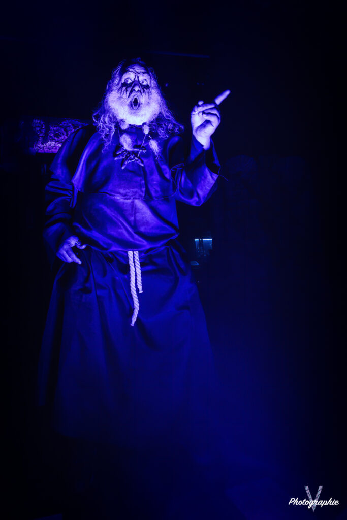 Après une intro en forme de déclaration d’amour au groupe KISS (le groupe ne se cache pas de l’énorme influence que les Américains on eut à tous les niveaux de leur concept) sous la forme de God Of Thunder diffusé en entier, un moine flippant annonce l’entrée en scène des Freaks de Lordi . Pour ceux qui ont raté ça à l’Alhambra l’année dernière, le Forum fait un peu office de rattrapage et pour ceux qui y étaient ils ont aussi bien fait de venir car ce n’est pas complètement le même show.