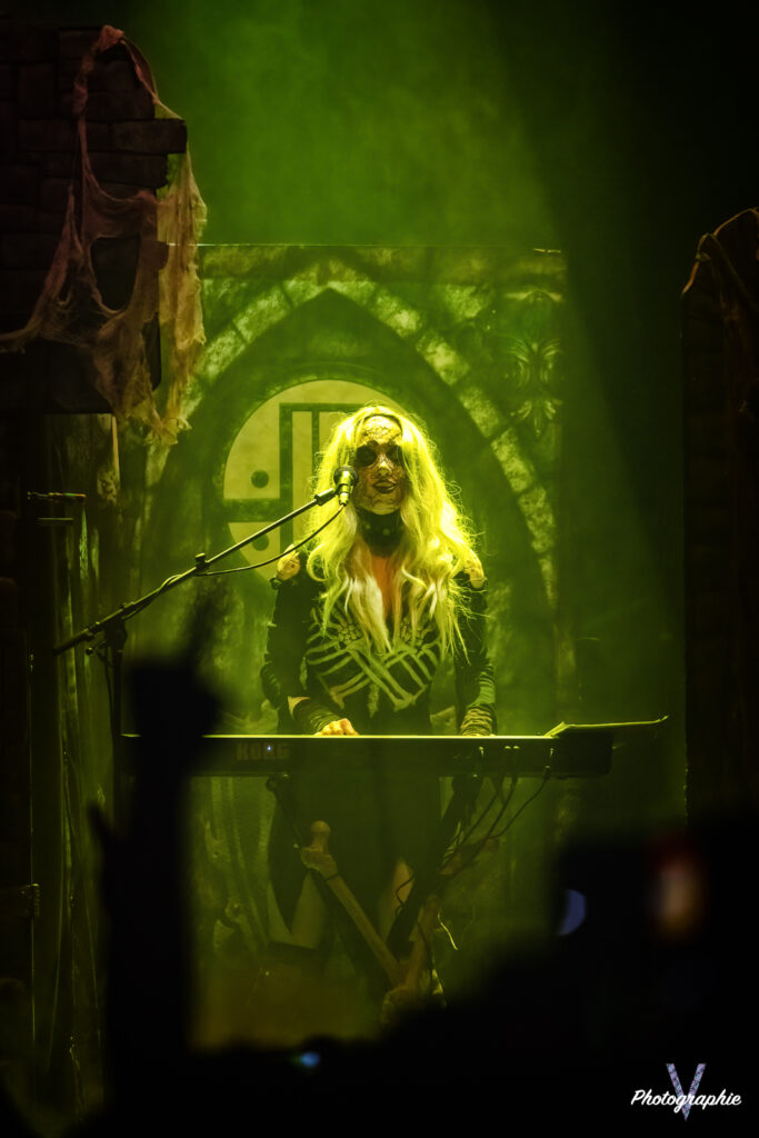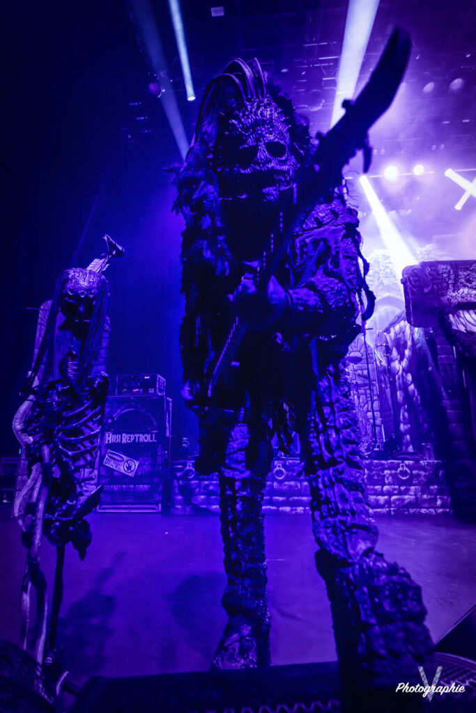 Les décors et les costumes sont quasiment les mêmes, la setlist évolue avec les tableaux qui vont avec. On garde tout de même les fondamentaux avec la présentation des musiciens sous la forme d’un solo sur un thème imposé. Cette fois, c’est la musique de film qui est à l’honneur. Ainsi le bassiste est plutôt Jurassic Park, le guitariste Retour Vers le Futur, le batteur plutôt Star Wars avec la Marche Impériale et la claviériste on ne se souvient plus. Mr Lordi parle un peu moins entre les titres, on l’a connu plus prolixe. Après All For Metal, le Hard Rock de Lordi semble un peu plus plan-plan, mais le show reste d’une rare efficacité avec des refrains qui restent bien en tête et une attitude scénique extrêmement travaillée. Le groupe réserve toujours un petit plus comme un serpent fumant, des confettis, un fusil à fumée etc. On n’a pas les mêmes moyens que pour un show d’Alice Cooper ou de Kiss, mais Lordi a à cœur de toujours trouver des idées pour nous divertir visuellement. Le seul vrai truc qui pêche ce sont les éclairages souvent monochrome, un coup tout est bleu, ou vert ou rouge. Pour les photos ce n’est pas facile, mais même si on est un simple spectateur, on pourrait prétendre à quelque chose d’un peu plus travaillé de la part d’un groupe qui présente un vrai show.
