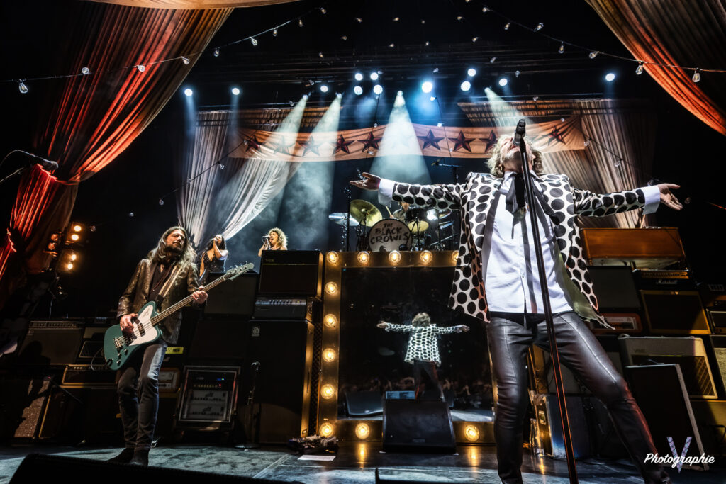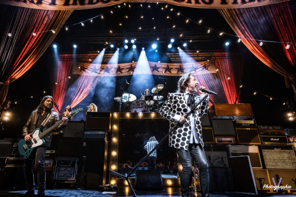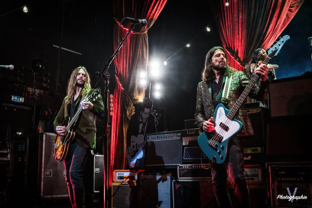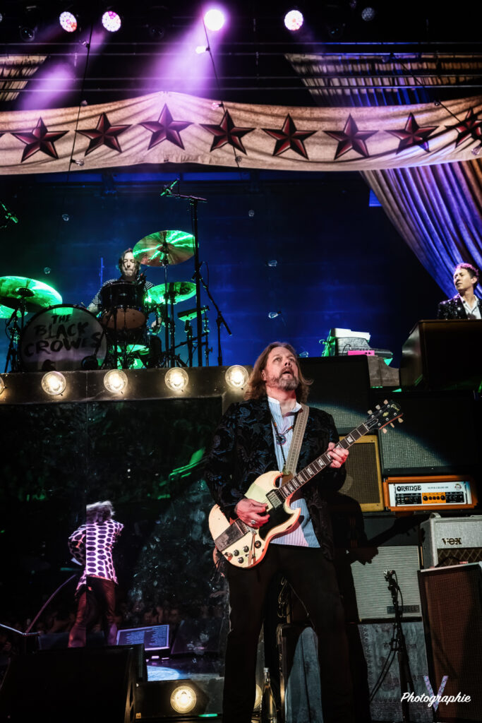 Devant la salle pleine, le décor se découvre et quel décor ! Une montagne de têtes d’amplis et de combos avec du Marshall, du Orange, du Fender, du Vox occupe le fond de scène. Au milieu un miroir entouré d’ampoules donne de la profondeur. Au sommet des amplis se tiennent deux choristes à gauche, le claviériste à droite et le batteur au centre. Sur le plancher, des vaches, les frères Robinson, au centre, et à droite sont accompagnés de Isaiah Mitchell et Sven Pipien respectivement guitariste lead et bassiste, deux valeurs sûres et discrètes. L’ambiance générale est entre le cirque et la guinguette avec une très jolie guirlande d’ampoules et des bannières au nom du dernier album sorti en mars de cette année dont il s’agit de la tournée de support : Hapiness Bastards.