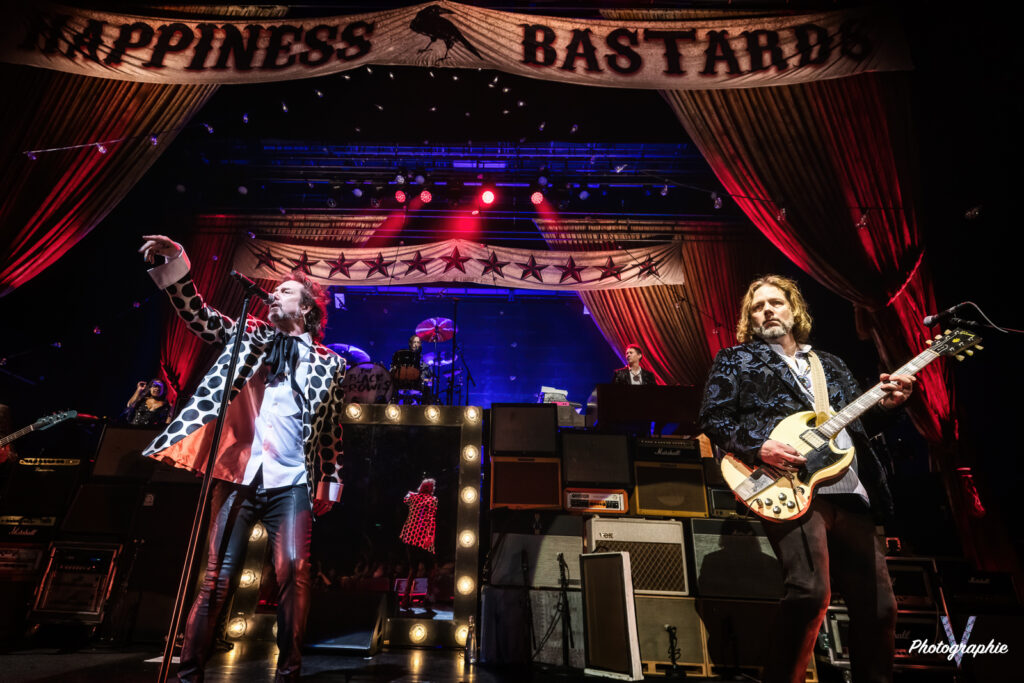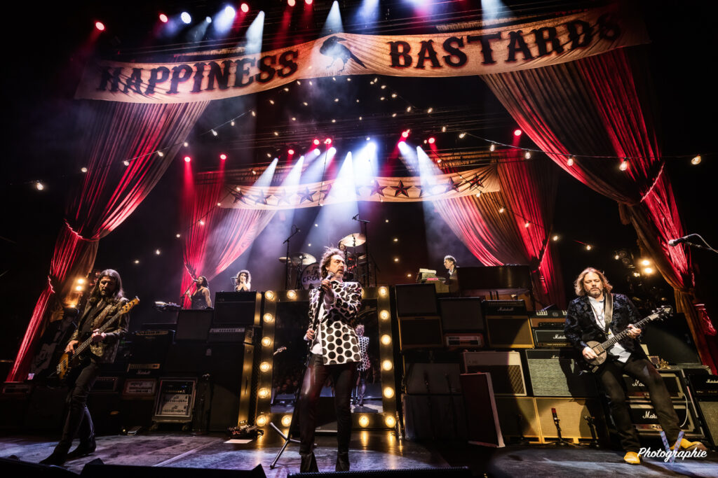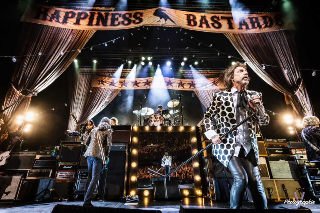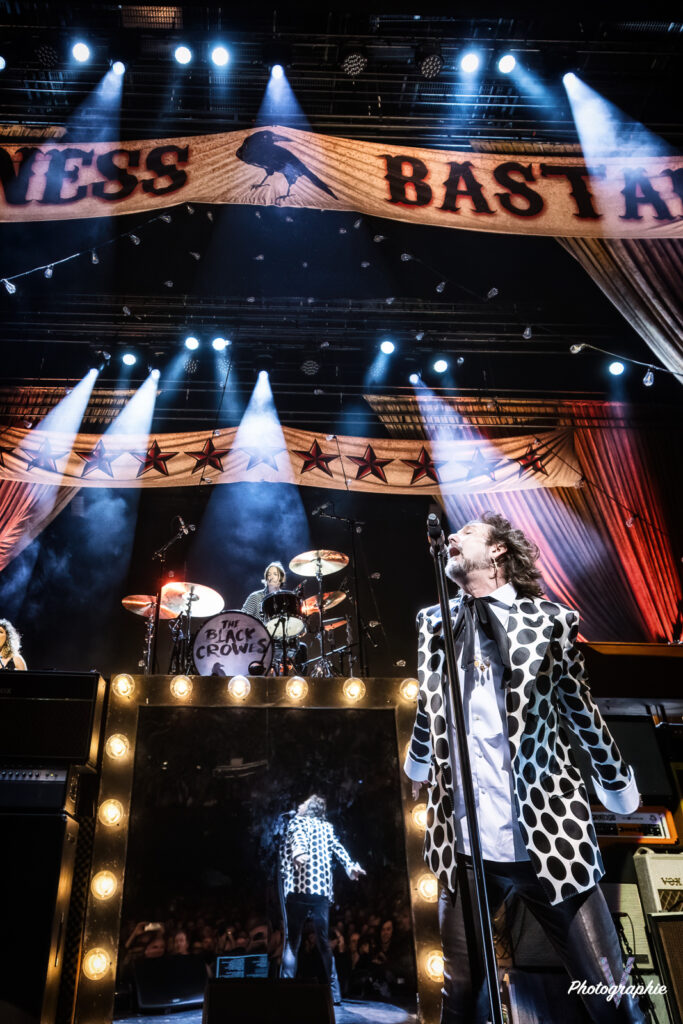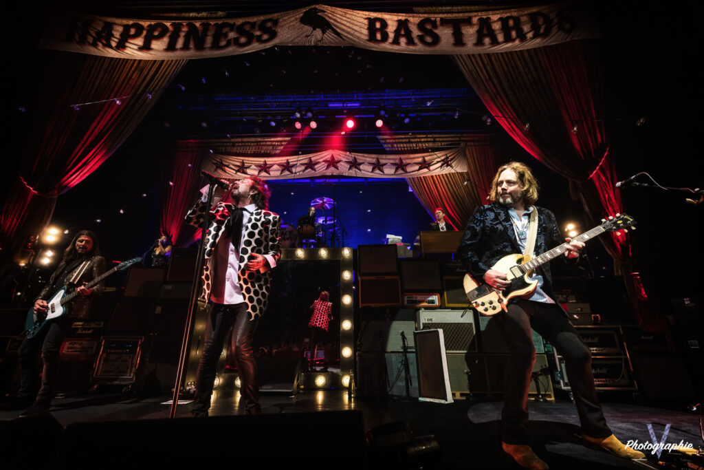Devant la salle pleine, le décor se découvre et quel décor ! Une montagne de têtes d’amplis et de combos avec du Marshall, du Orange, du Fender, du Vox occupe le fond de scène. Au milieu un miroir entouré d’ampoules donne de la profondeur. Au sommet des amplis se tiennent deux choristes à gauche, le claviériste à droite et le batteur au centre. Sur le plancher, des vaches, les frères Robinson, au centre, et à droite sont accompagnés de Isaiah Mitchell et Sven Pipien respectivement guitariste lead et bassiste, deux valeurs sûres et discrètes. L’ambiance générale est entre le cirque et la guinguette avec une très jolie guirlande d’ampoules et des bannières au nom du dernier album sorti en mars de cette année dont il s’agit de la tournée de support : Hapiness Bastards.