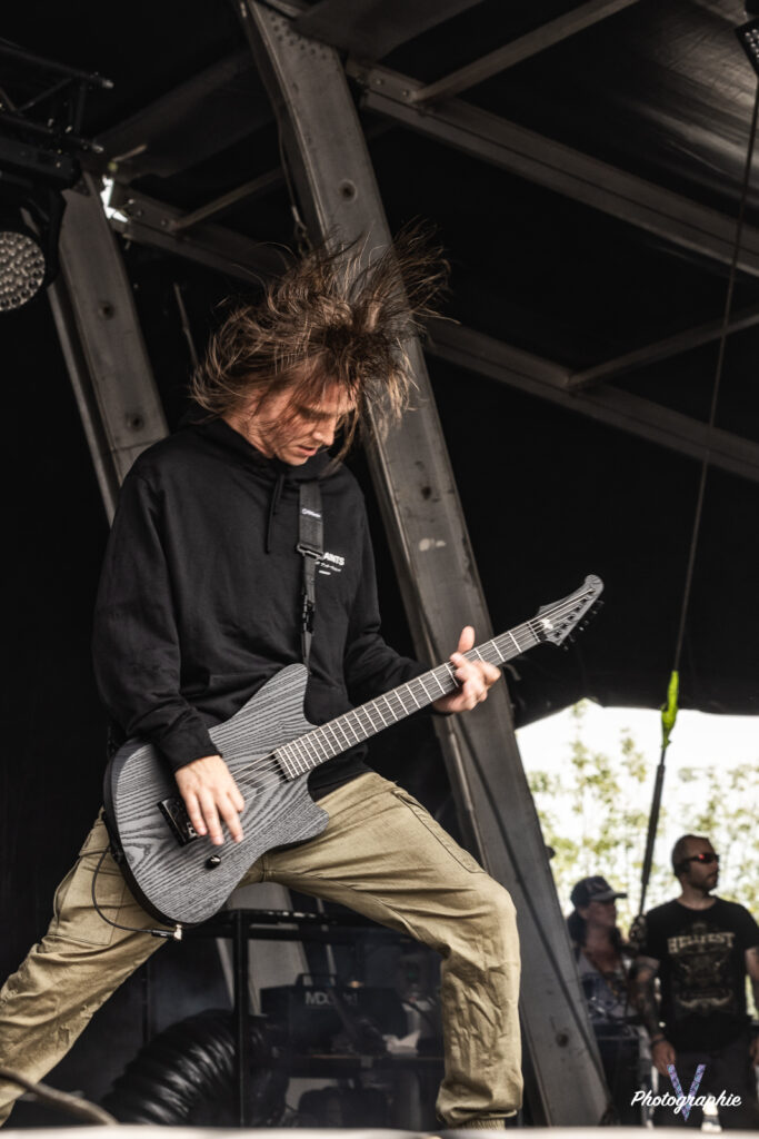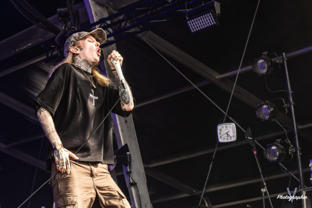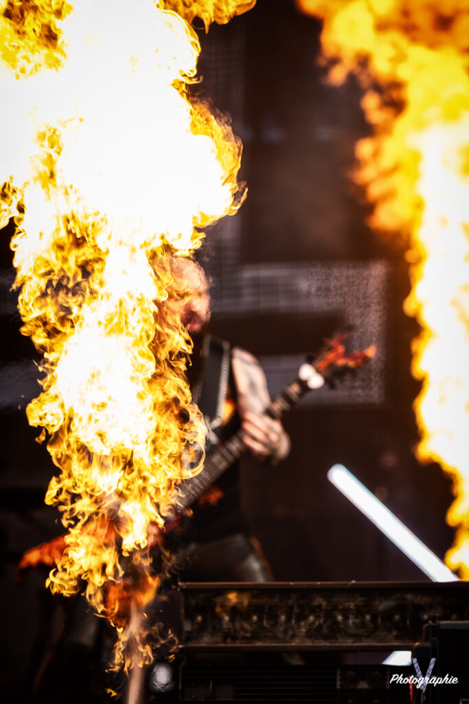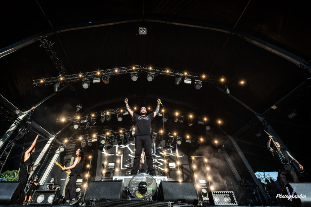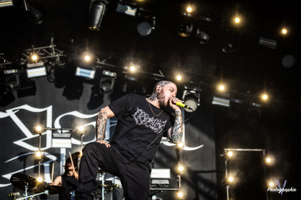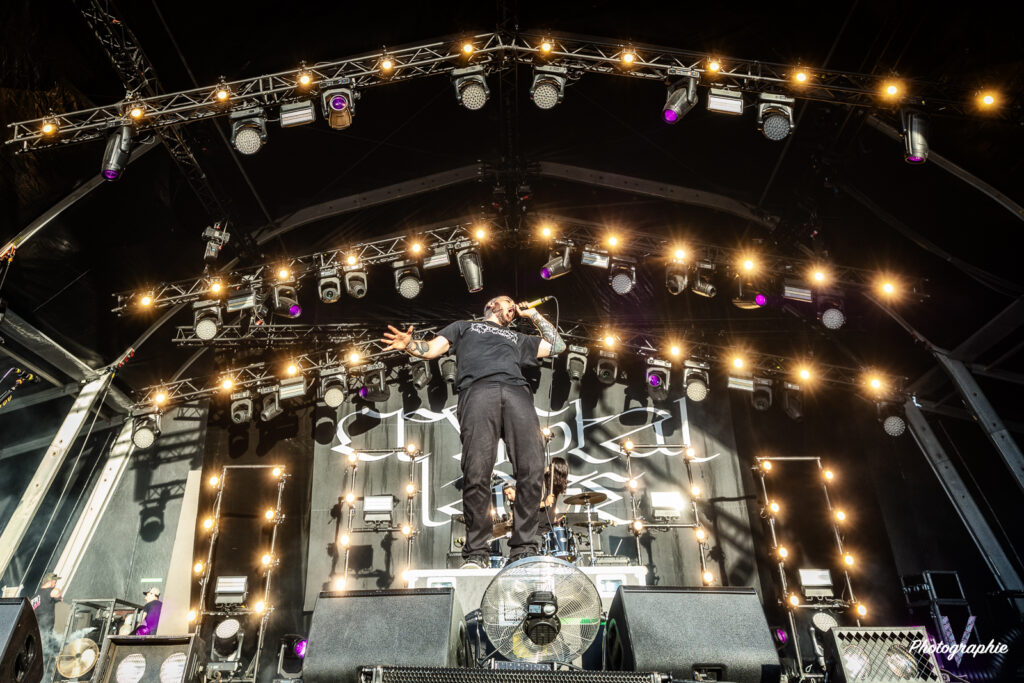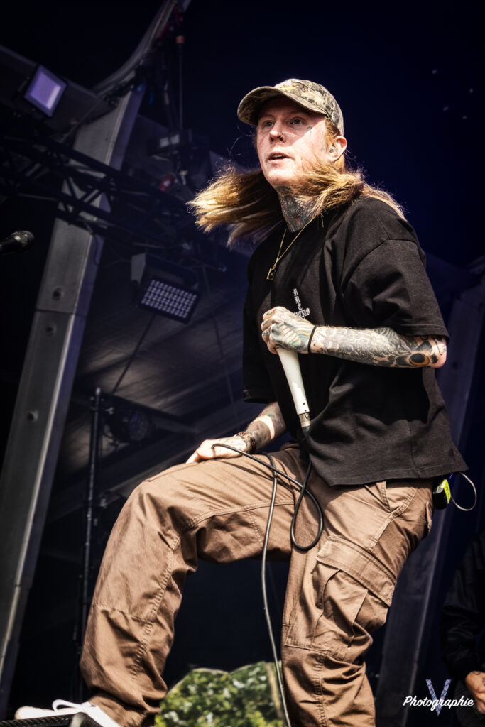 Le passage du Death Old School d’Asinhell au Metalcore n’engendre aucun turn over et le public apprécie de griller au soleil. Pourquoi ne pas ajouter quelques effets pyrotechniques pour finir la cuisson. Côté musical, on est sur une représentation assez lourde il faut dire. Le chant clair s’installe progressivement au cours du set, laissant une place importante au growl et scream de Scott Kenedy.