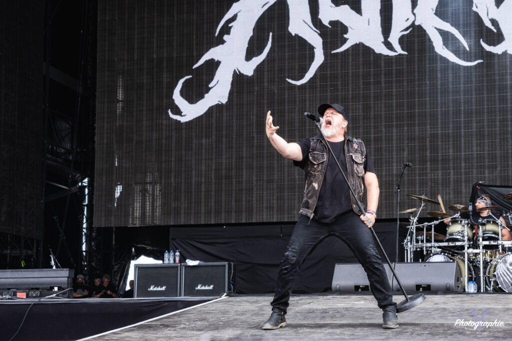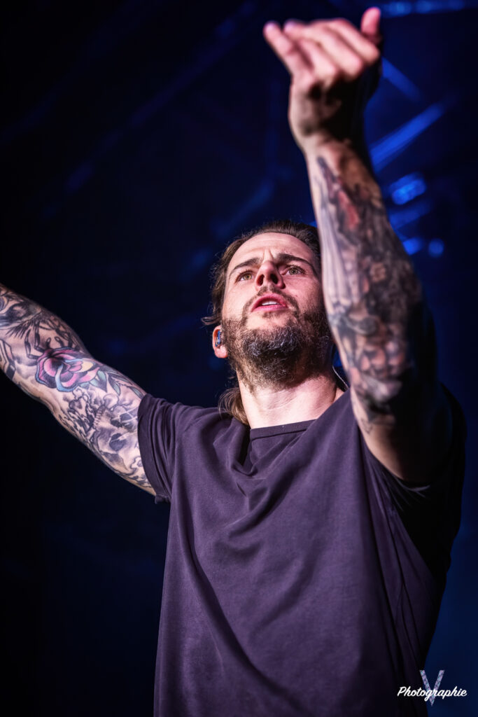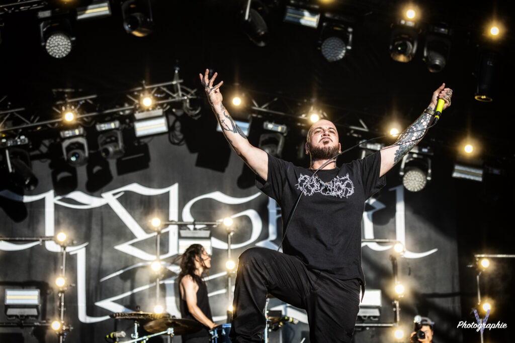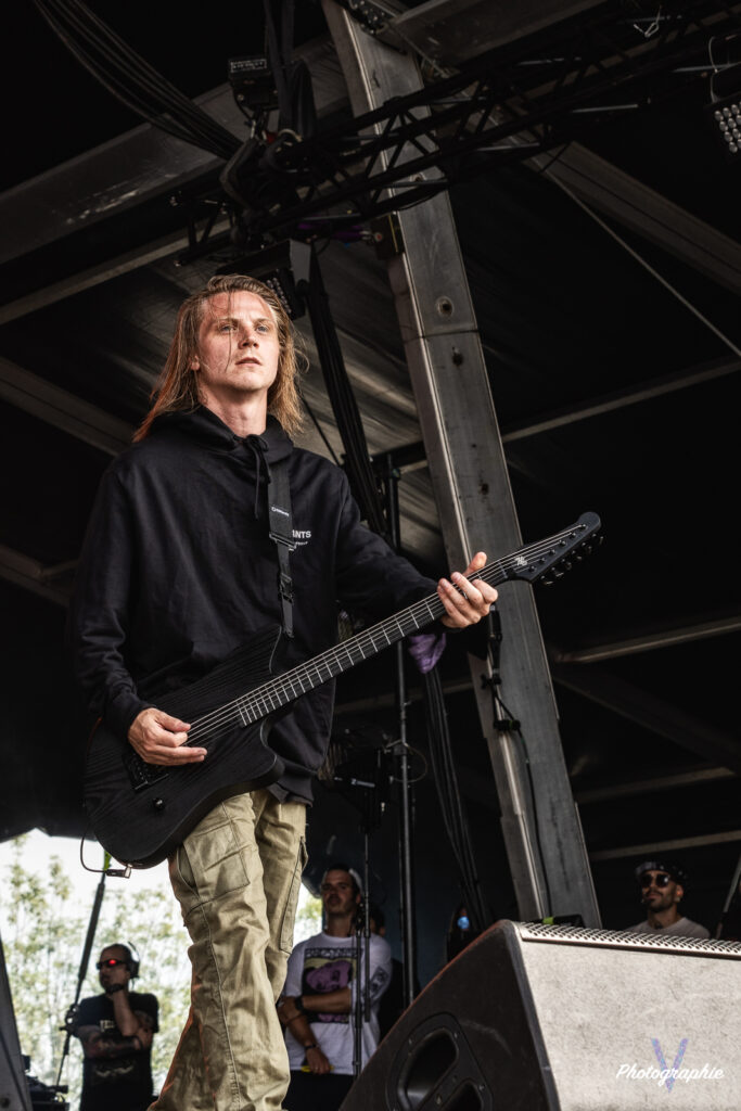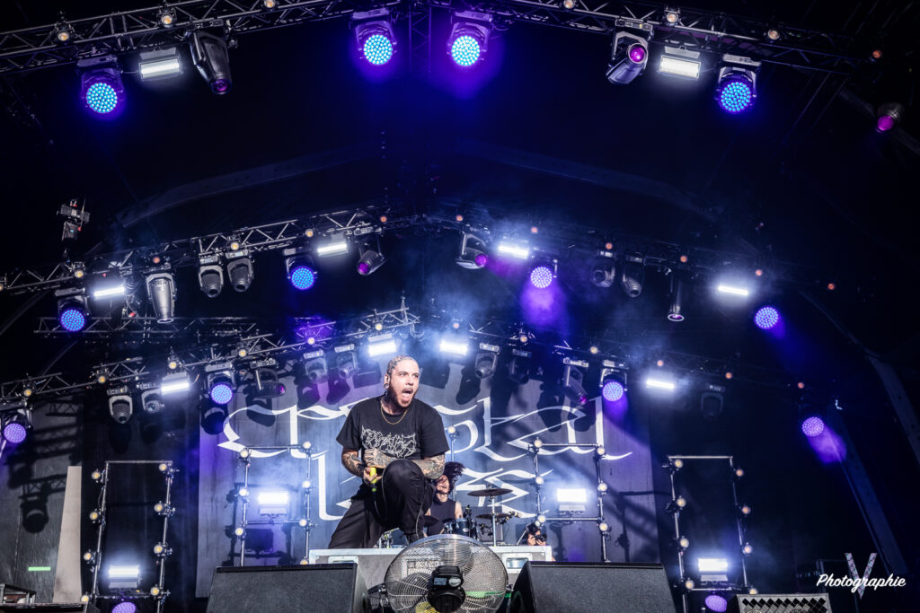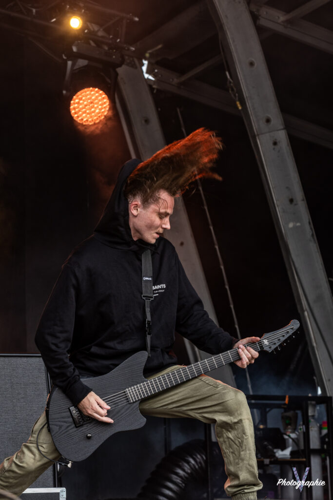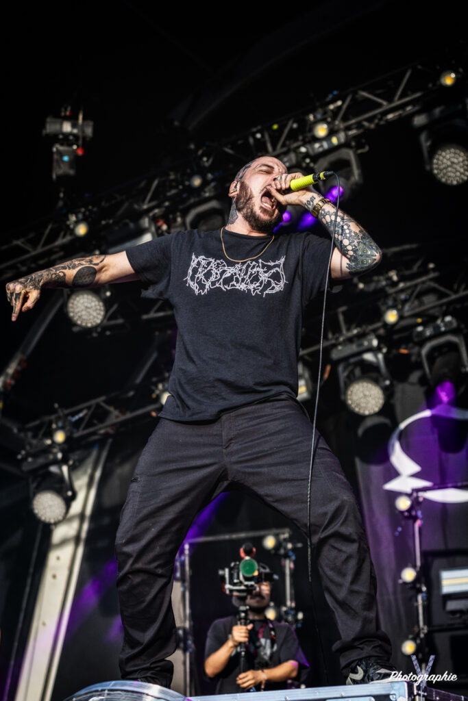 Le passage du Death Old School d’Asinhell au Metalcore n’engendre aucun turn over et le public apprécie de griller au soleil. Pourquoi ne pas ajouter quelques effets pyrotechniques pour finir la cuisson. Côté musical, on est sur une représentation assez lourde il faut dire. Le chant clair s’installe progressivement au cours du set, laissant une place importante au growl et scream de Scott Kenedy.