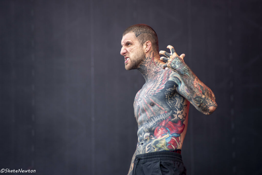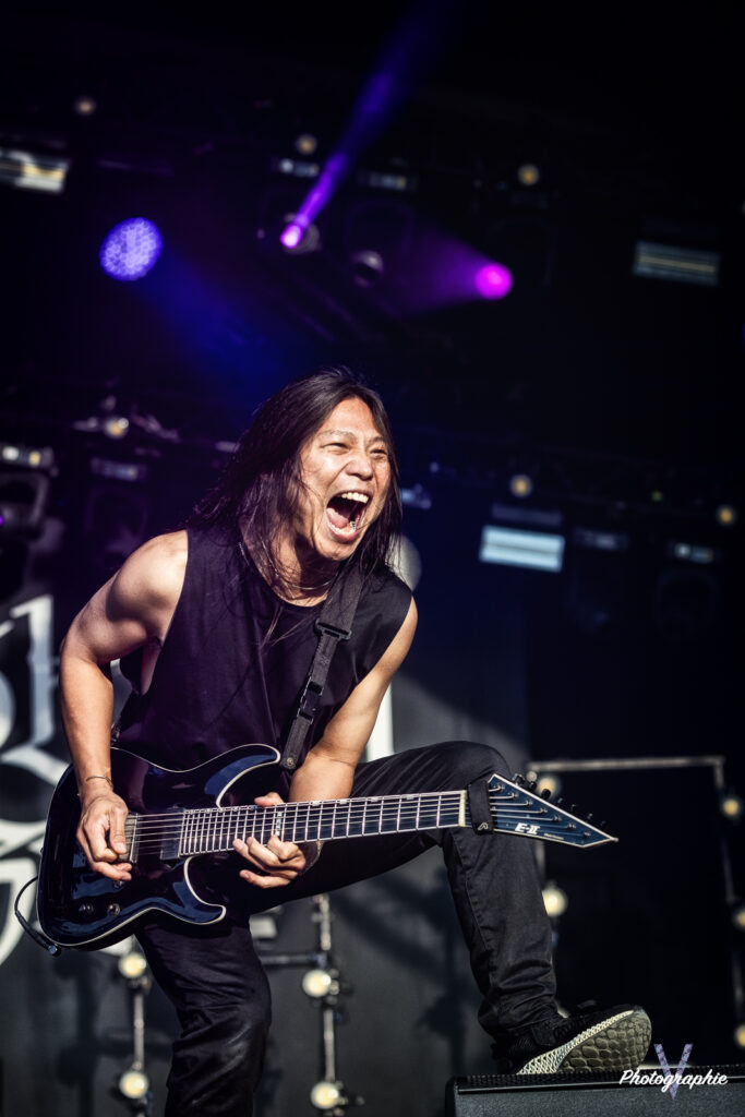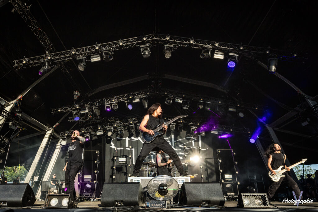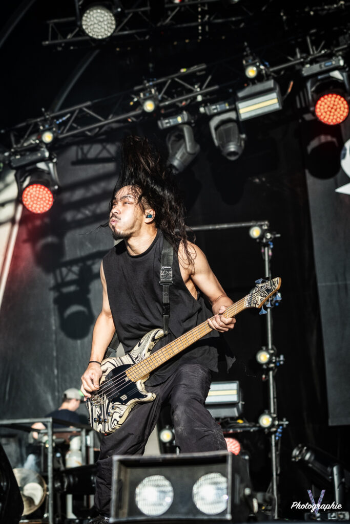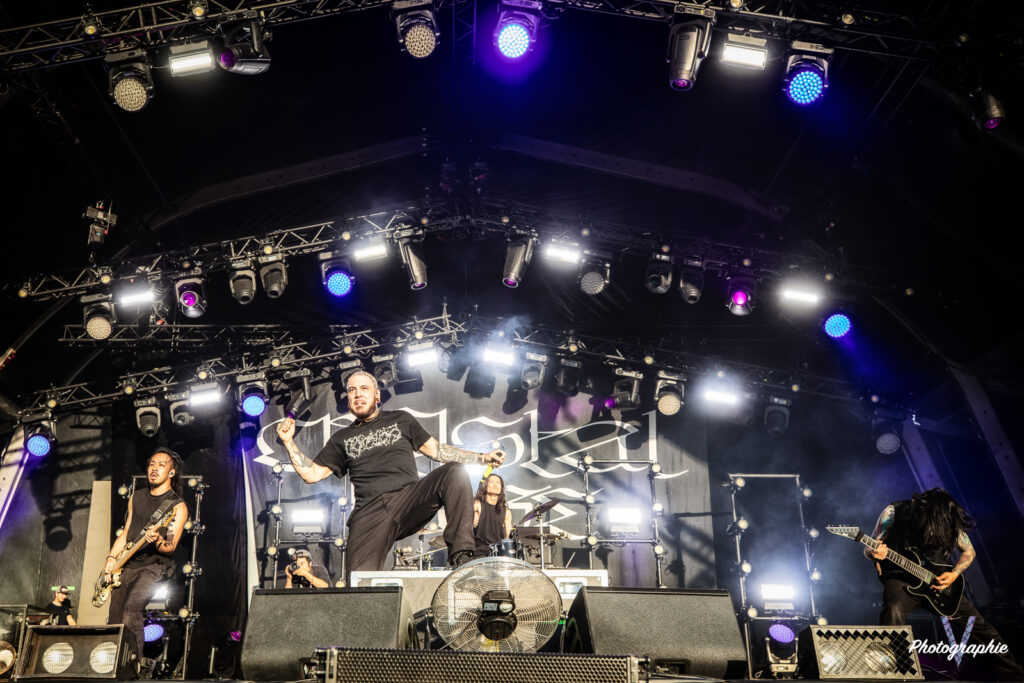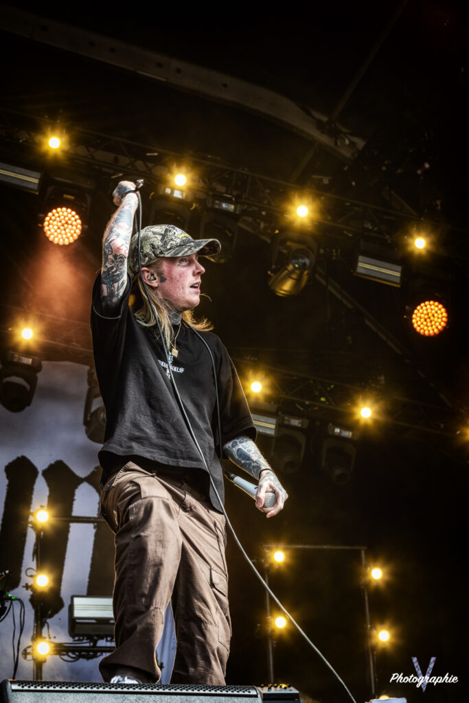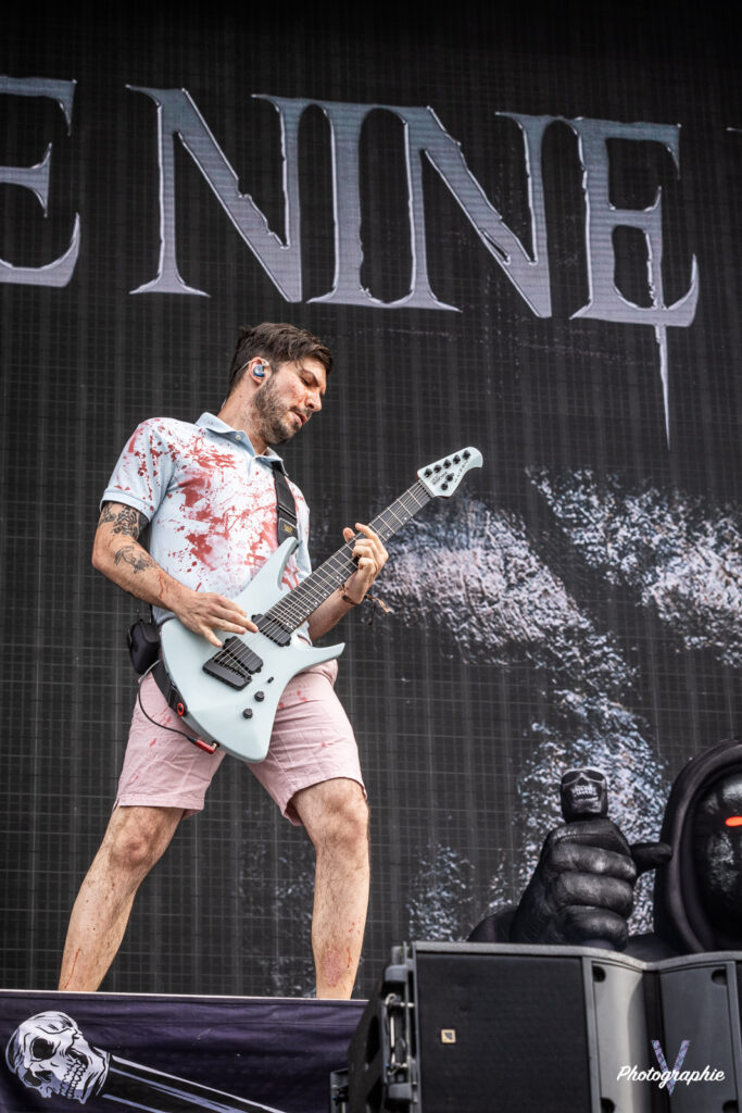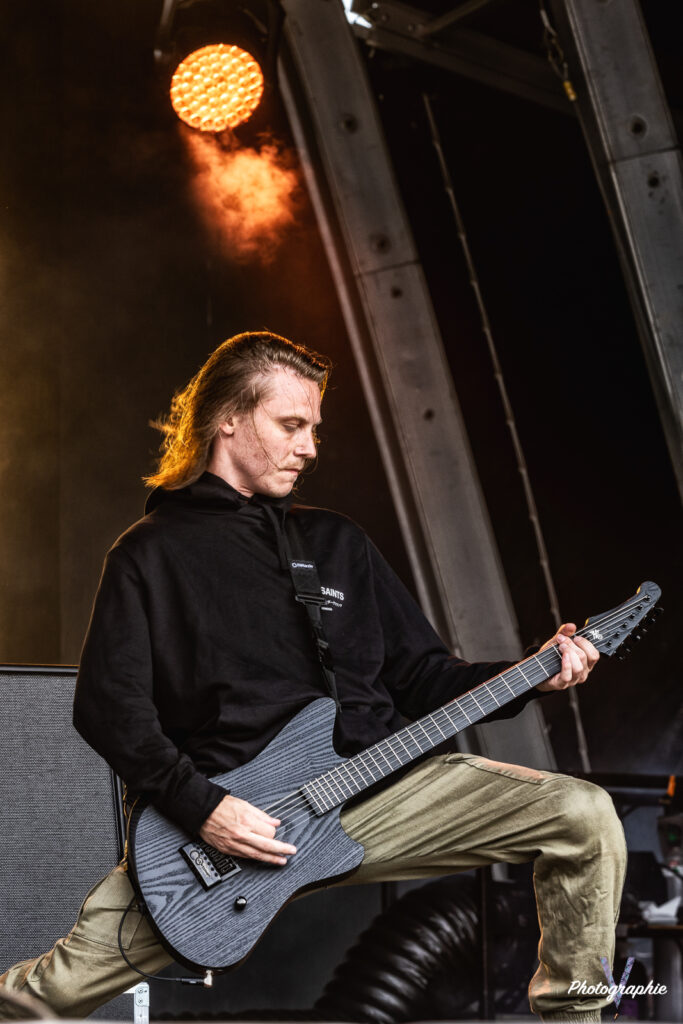 Le passage du Death Old School d’Asinhell au Metalcore n’engendre aucun turn over et le public apprécie de griller au soleil. Pourquoi ne pas ajouter quelques effets pyrotechniques pour finir la cuisson. Côté musical, on est sur une représentation assez lourde il faut dire. Le chant clair s’installe progressivement au cours du set, laissant une place importante au growl et scream de Scott Kenedy.