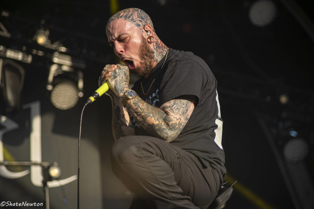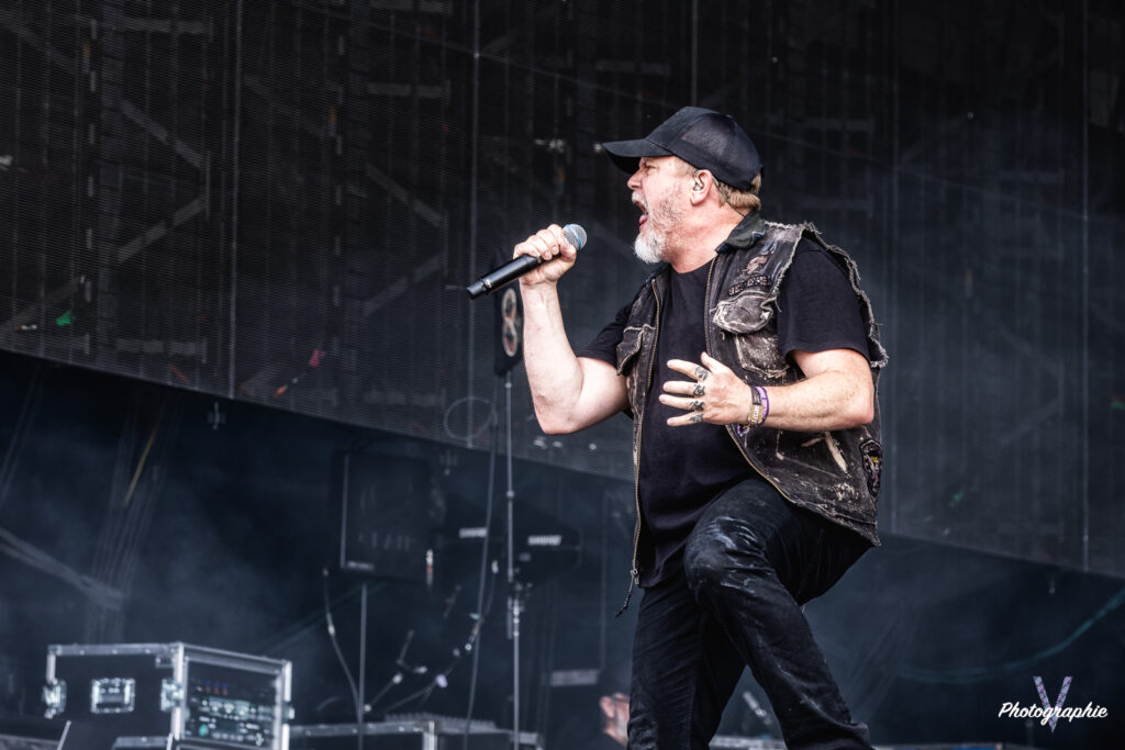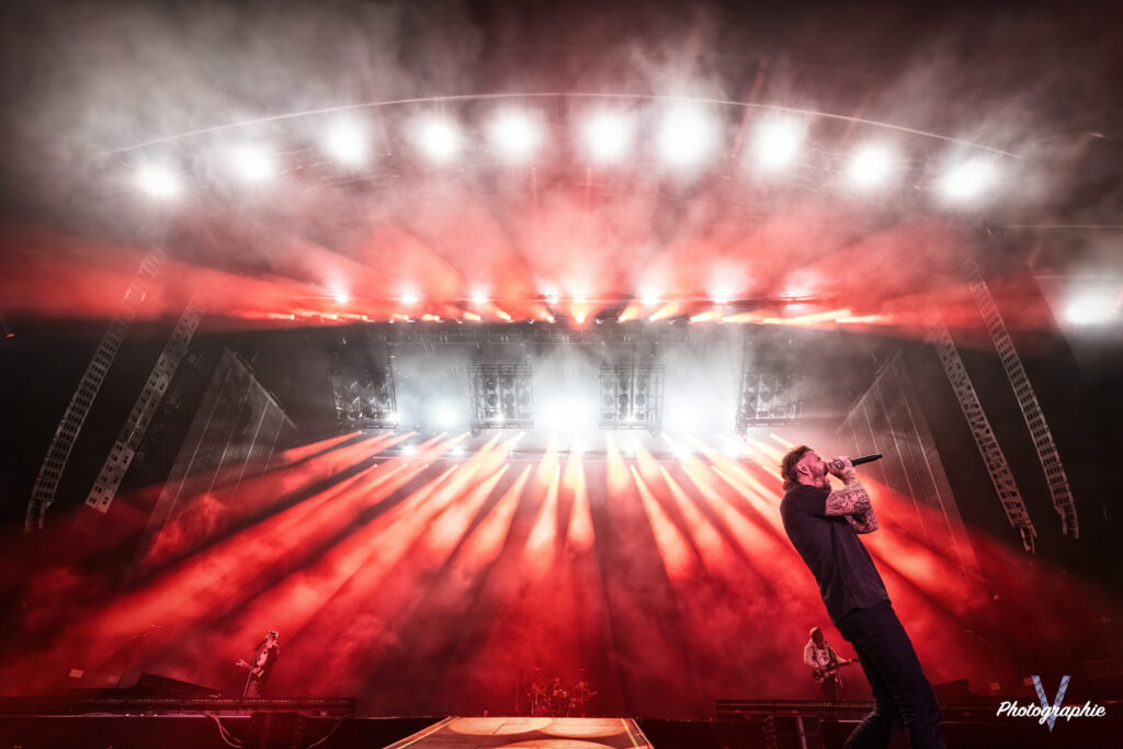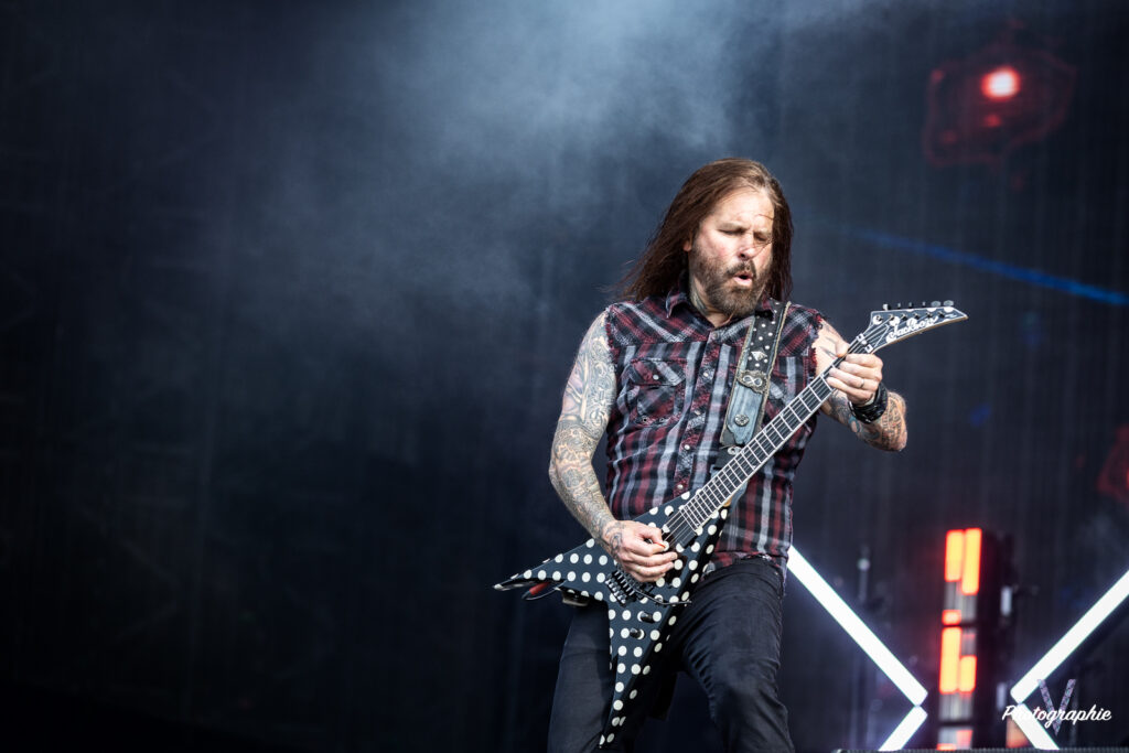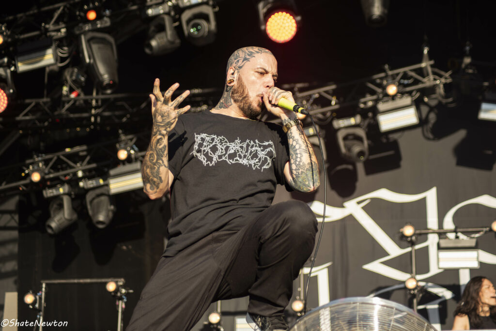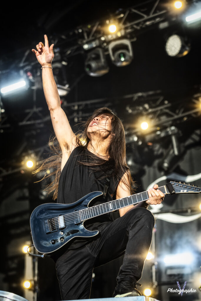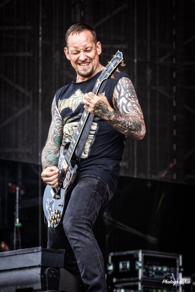 Le passage du Death Old School d’Asinhell au Metalcore n’engendre aucun turn over et le public apprécie de griller au soleil. Pourquoi ne pas ajouter quelques effets pyrotechniques pour finir la cuisson. Côté musical, on est sur une représentation assez lourde il faut dire. Le chant clair s’installe progressivement au cours du set, laissant une place importante au growl et scream de Scott Kenedy.