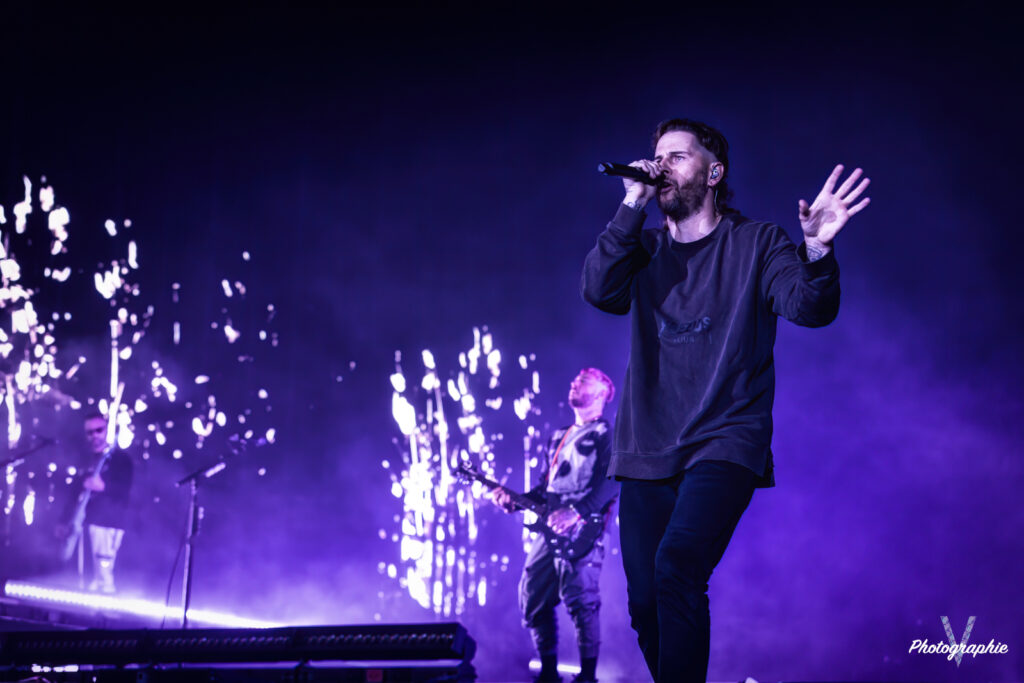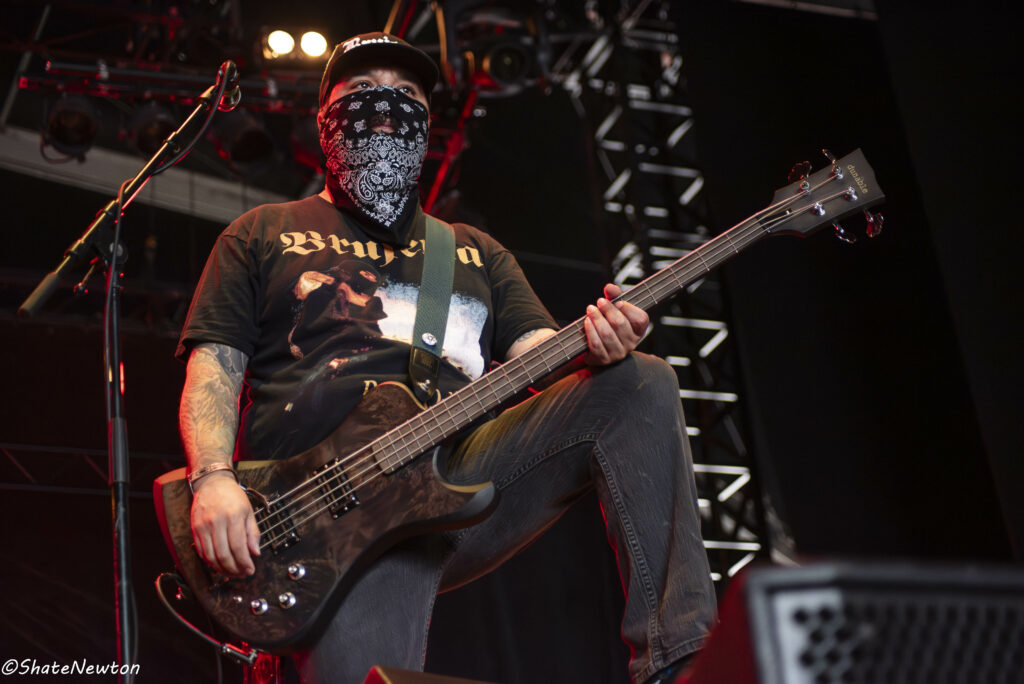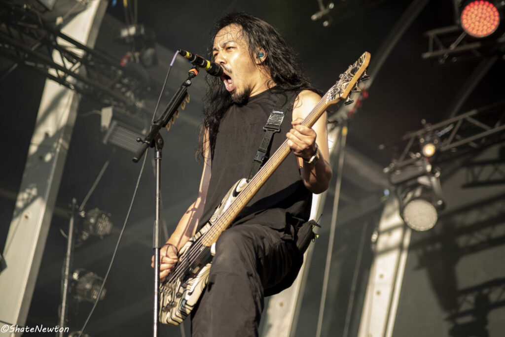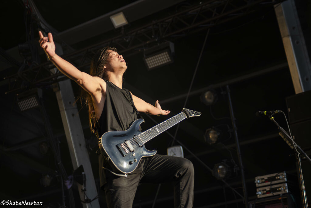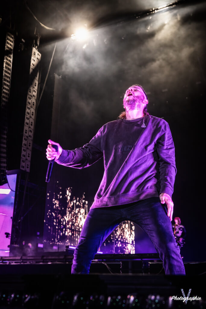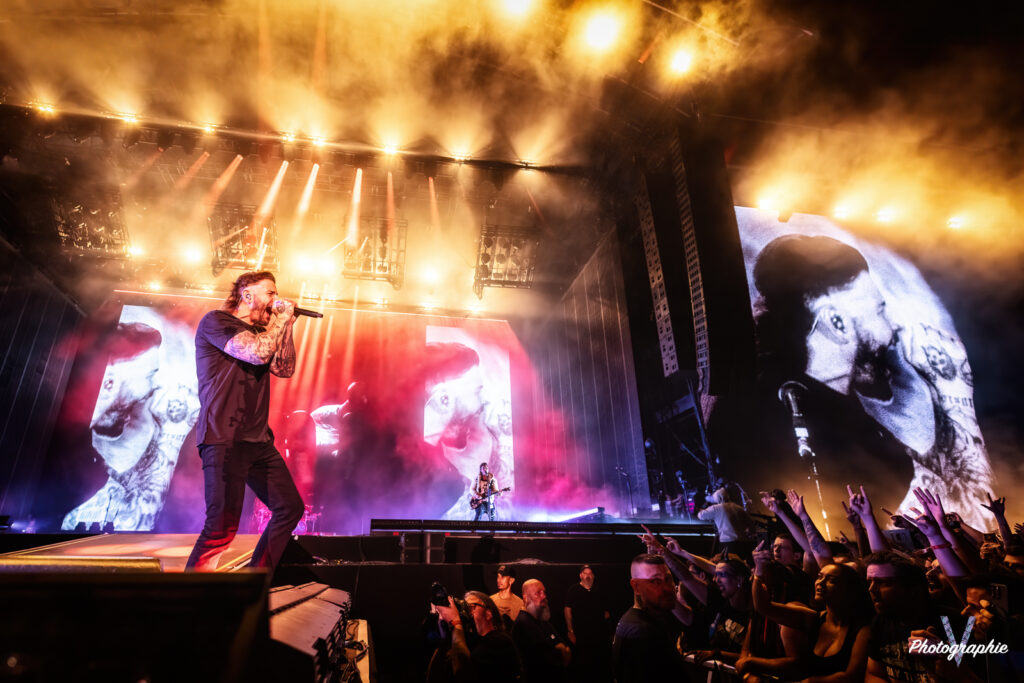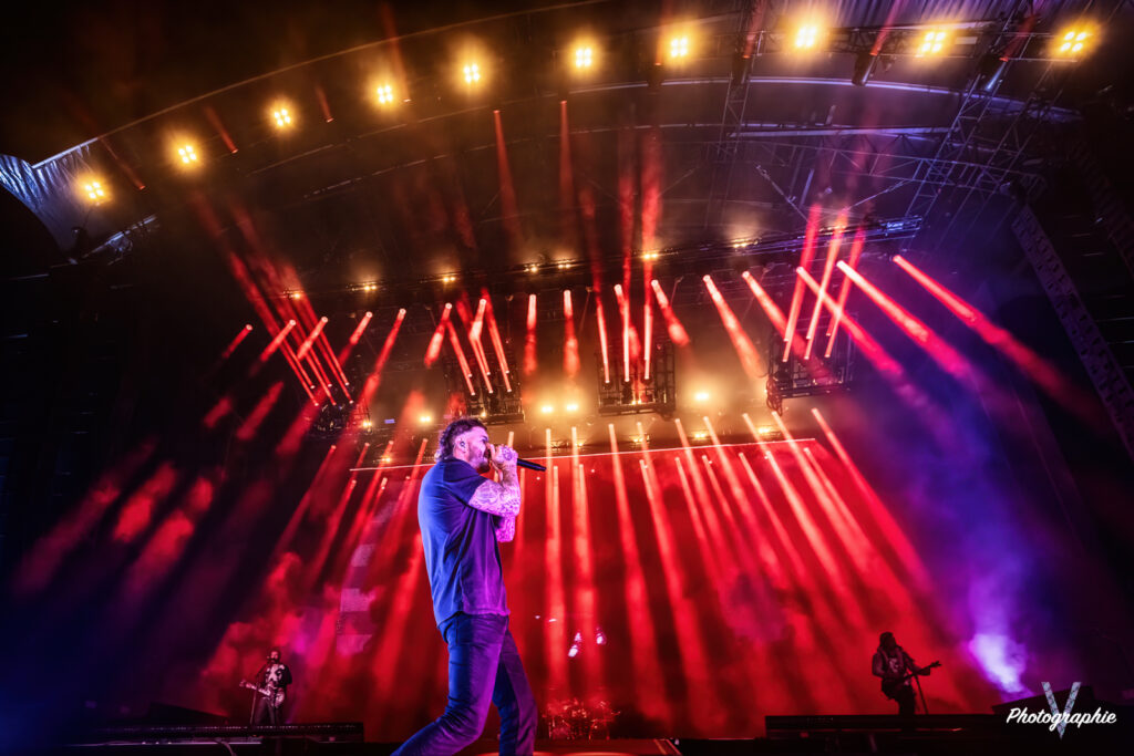 Le passage du Death Old School d’Asinhell au Metalcore n’engendre aucun turn over et le public apprécie de griller au soleil. Pourquoi ne pas ajouter quelques effets pyrotechniques pour finir la cuisson. Côté musical, on est sur une représentation assez lourde il faut dire. Le chant clair s’installe progressivement au cours du set, laissant une place importante au growl et scream de Scott Kenedy.