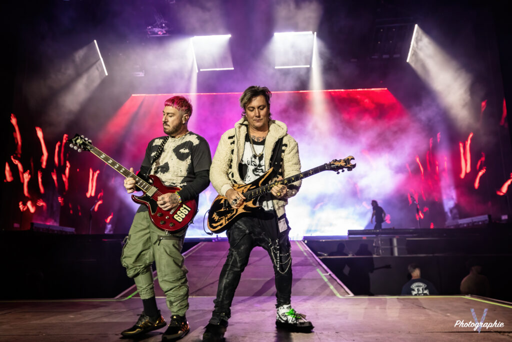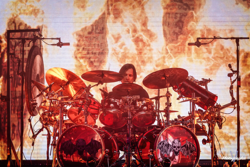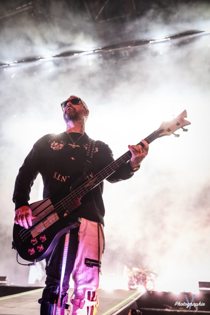 La tête d’affiche du soir s’inscrit parfaitement dans une prog plus tôt éclectique. Son large champ musical est vraiment fédérateur comme on pouvait s’y attendre. M. Shadows ouvre la soirée encagoulée en mode Moscow Death Brigade ou qui sait, peut-être un hommage pour Solitaris. Sa voix plus que reconnaissable est tout aussi efficace et grinçante que sur les enregistrements. À noter que l’on peut observer un concept capillaire une fois sa tête découverte. En attendant les photos, imaginez un croisement des franges à la russe et une coupe mulet… magique. Côté stylisme le reste du groupe n’est pas en reste avec des fringues qui sortent des canons du genre, il y’a une certaine forme de sophistication dans leur démarche vestimentaire. Scéniquement le groupe délivre une performance correct, mais ça ne sent pas la sueur. On a la froideur d’un show très pro, mais pas de chaleur ou de connivence avec le public. Comme un exercice imposé. Pire les deux guitaristes ont l’air de se faire chier. Ce ne sont pas des sœurs sourires, ils font le job mais c’est sans passion et ça se ressent. Dommage car Avenged Sevenfold a l’expérience pour lui, mais il lui manque un petit truc pour se hisser à la place des plus grands dont ils se sont inspirés pour construire leur identité. Ce petit quelque chose c’est sans doute l’envie.