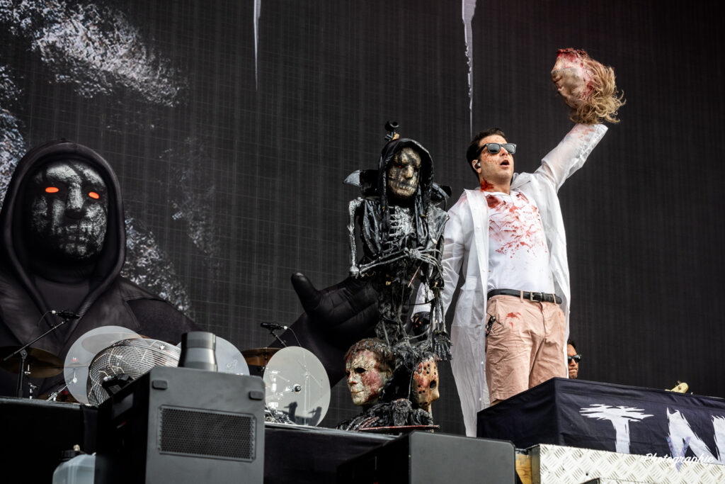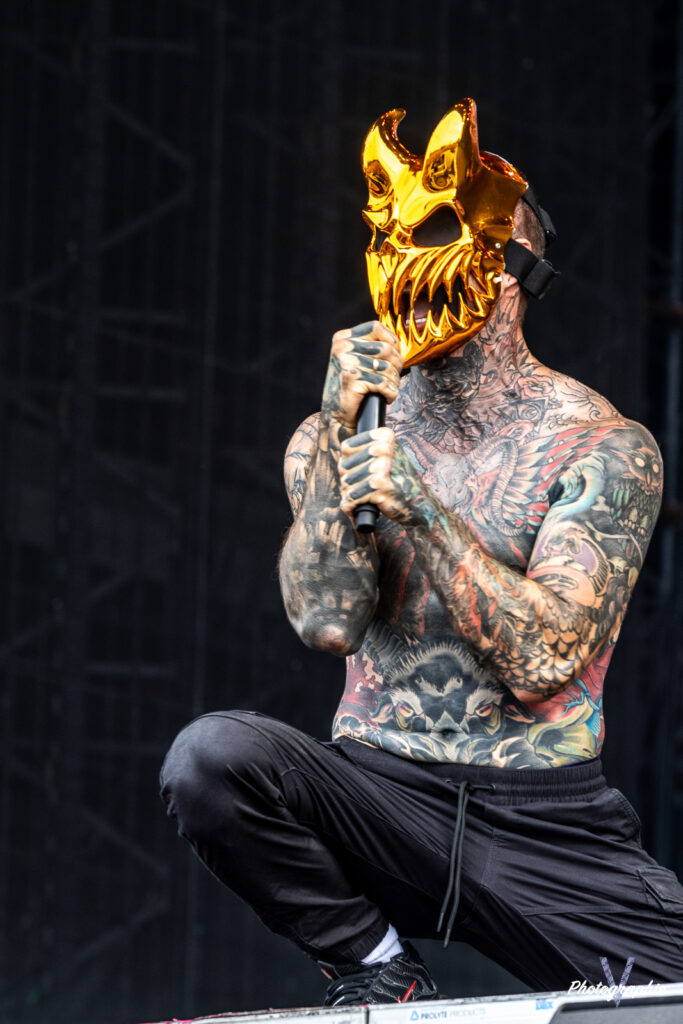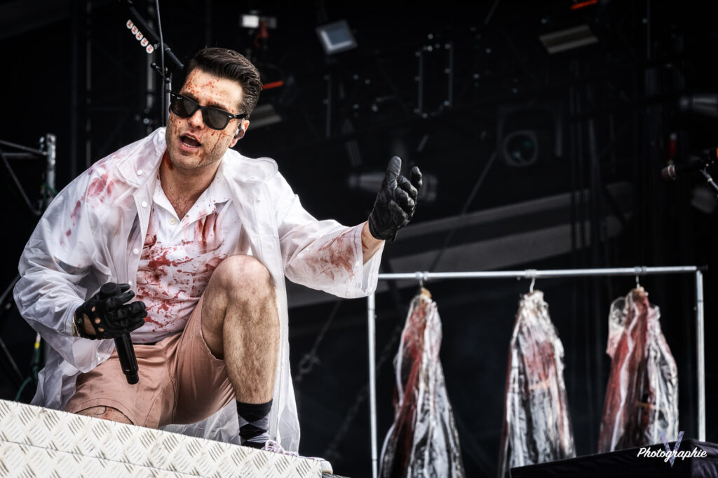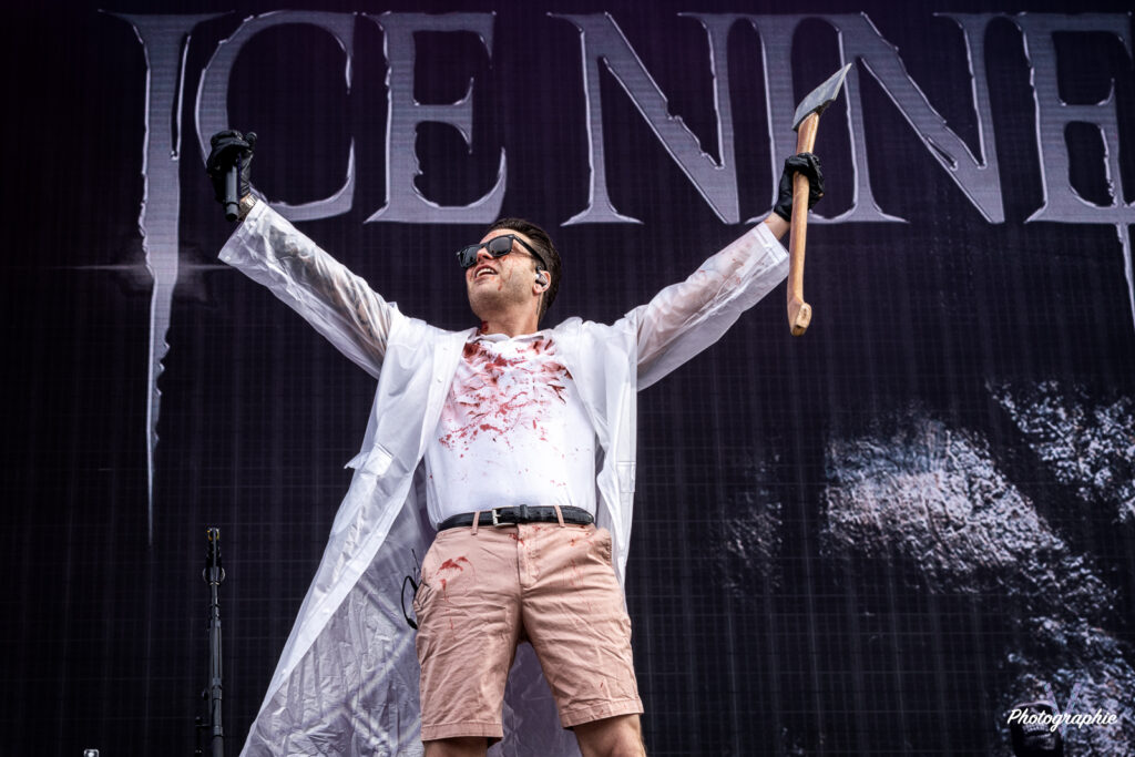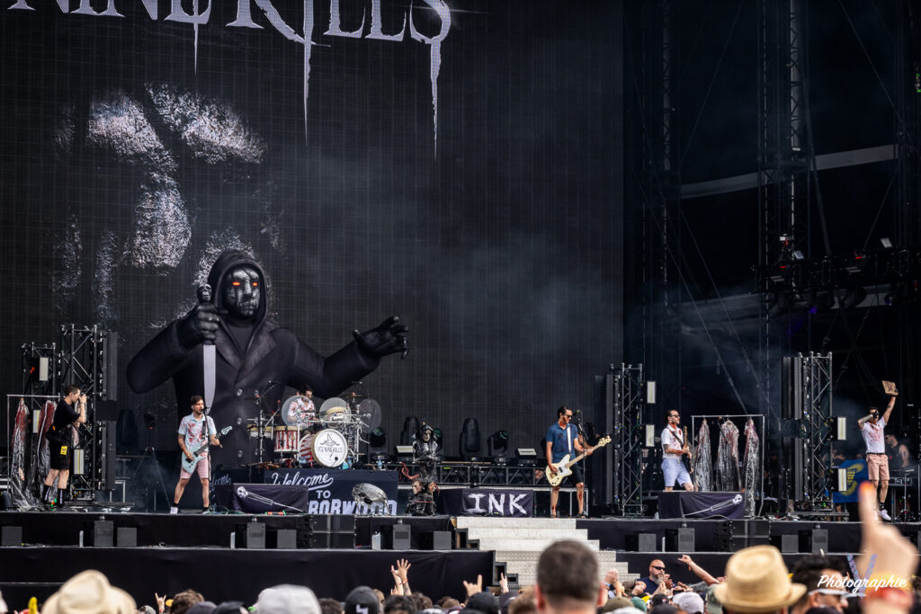 On commencerait presque à bien se sentir aux abords de ces grandes scènes principales. 4/4 de la programmation avec les coreux d’Ice Nine Kills. Membres de cette énorme famille du Metalcore américain, ils proposent une approche du genre très visuelle, principalement empruntée au thriller Psychose, chef d’œuvre d’Hichcock mais qui fait la part belle au cinéma gore de la fin des années 80.