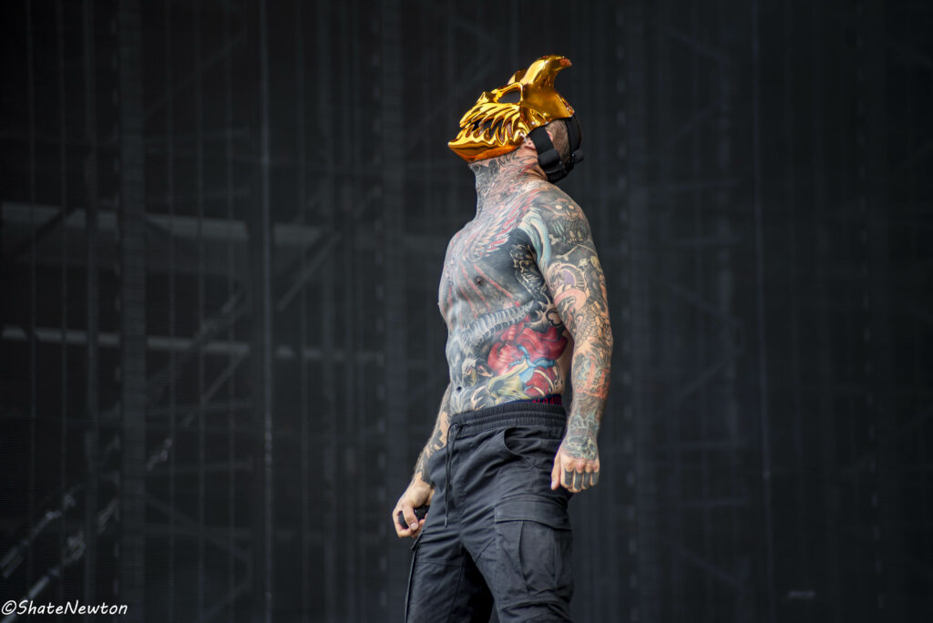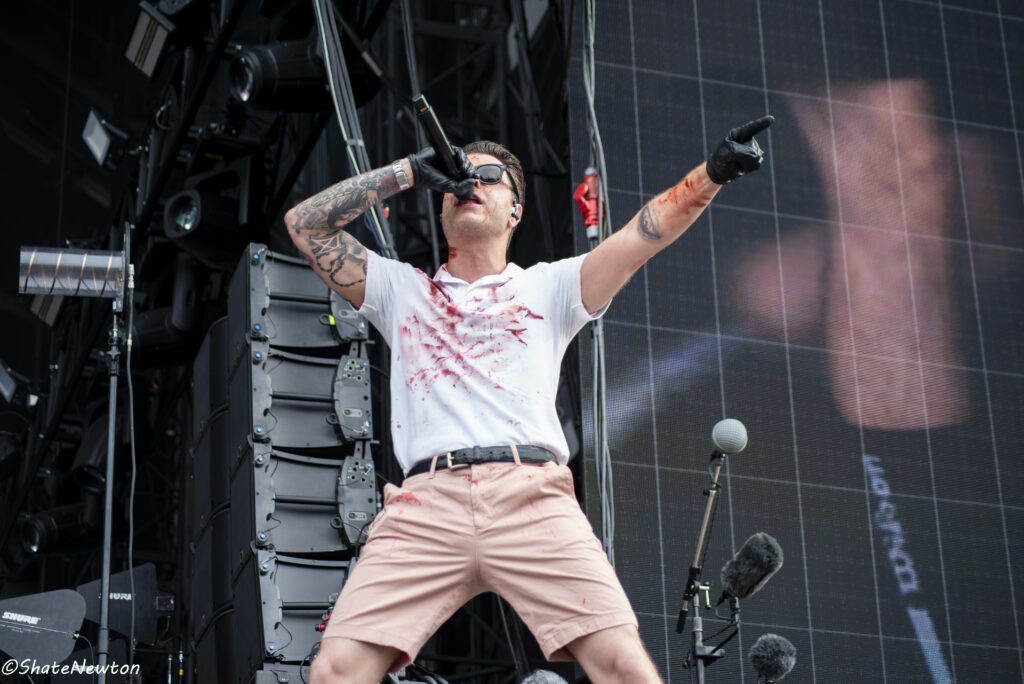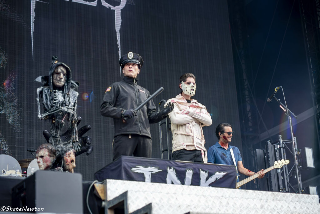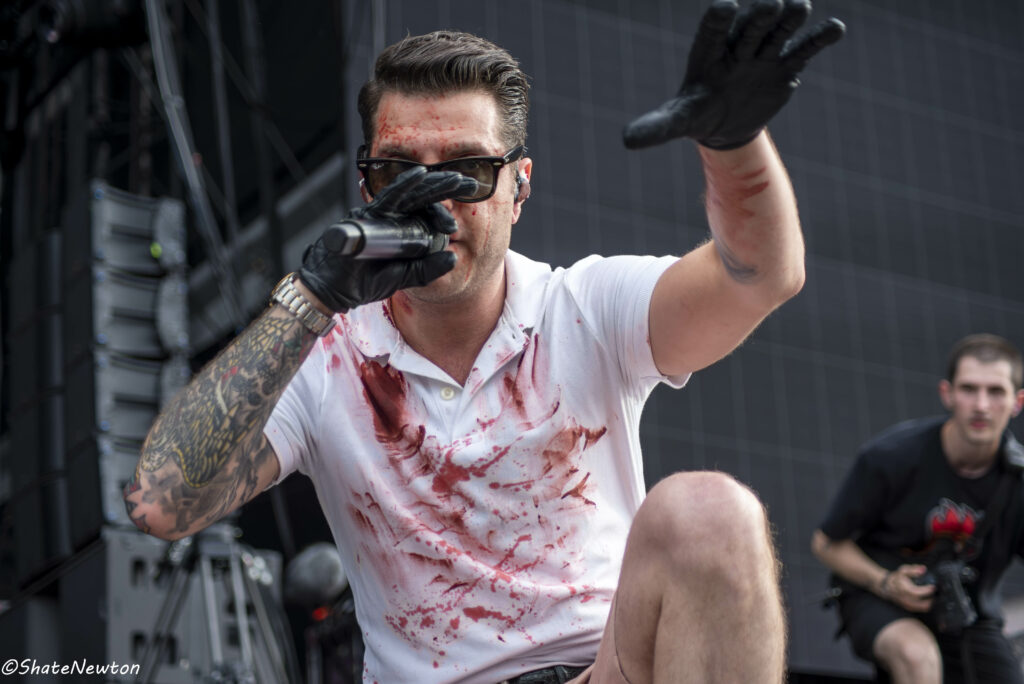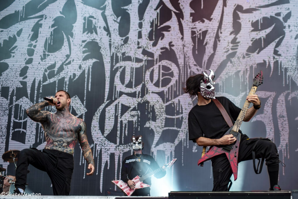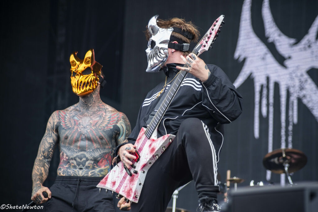 On commencerait presque à bien se sentir aux abords de ces grandes scènes principales. 4/4 de la programmation avec les coreux d’Ice Nine Kills. Membres de cette énorme famille du Metalcore américain, ils proposent une approche du genre très visuelle, principalement empruntée au thriller Psychose, chef d’œuvre d’Hichcock mais qui fait la part belle au cinéma gore de la fin des années 80.