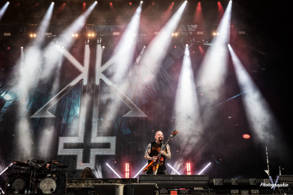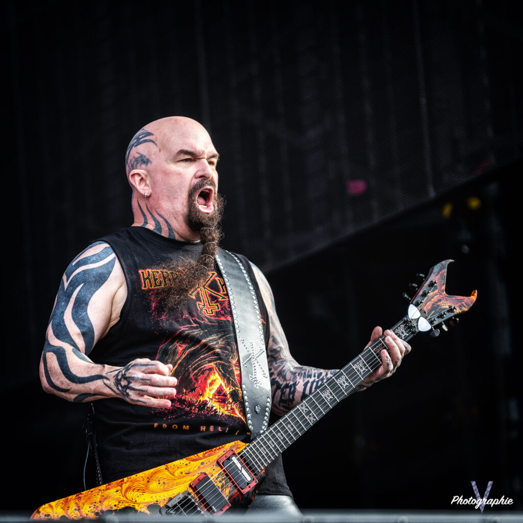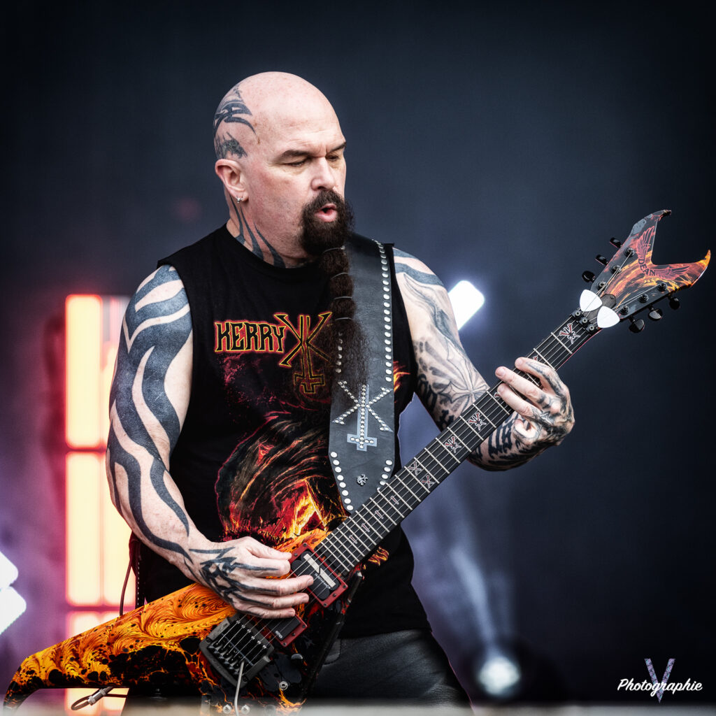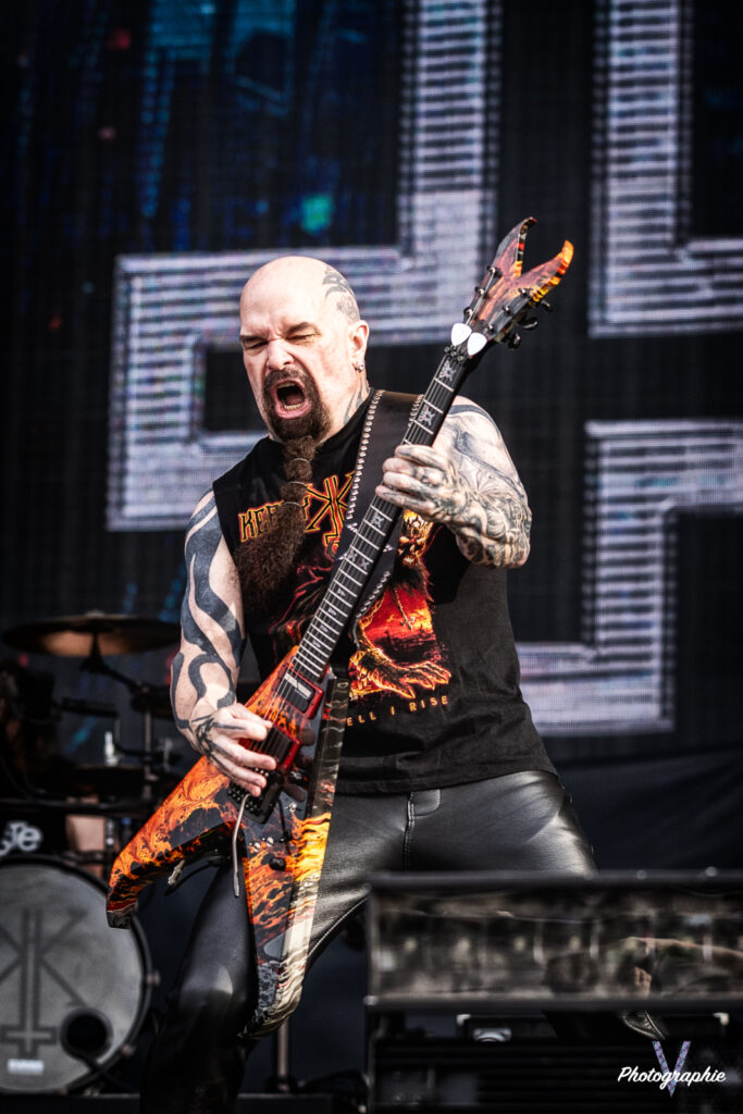 On s’accroche comme une moule à son rocher sur les Mainstages pour retrouver Kerry King le guitariste qui pratique le Thrash sans concession depuis que ce style existe ! Slayer étant en pause retraite (avant qu’ils décident de remettre ça), c’est en solo que le roi s’impose à ce Hellfest venu en masse pour le saluer. Pour ce faire il est accompagné par Mark Osegueda pour le chant (Deaht Angel), par Kyle Sanders à la basse, Phil Demmel (Ex-Machine Head) et Paul Bostaph qu’on ne présente plus.