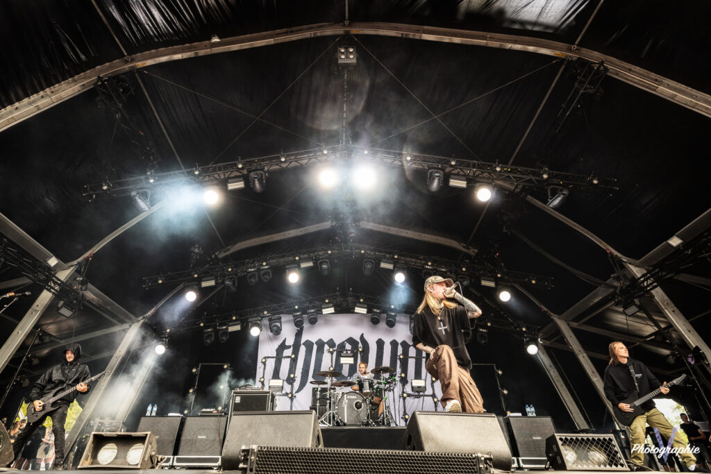 Pour notre première visite du côté de la Warzone nous avons choisi de venir jouer les curieux auprès du groupe Suédois Thrown qui va régaler la foule avec son Hardcore sans concession. Particularité intéressante de cette formation ? Il n’y a pas de bassiste et curieusement ça ne s’entend pas trop. Comme pour la Valley, la Warzone est déjà full, les festivaliers font honneurs aux groupes qui démarrent cette journée. Surement un petit effet d’aubaine de commencer en milieu de journée, mais on gage que la qualité des groupes n’est pas étrangère à cet engouement.