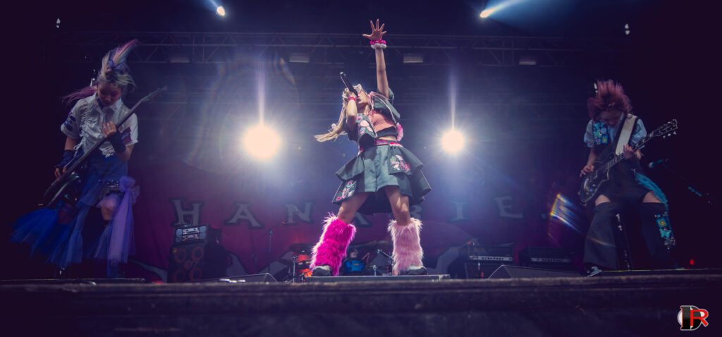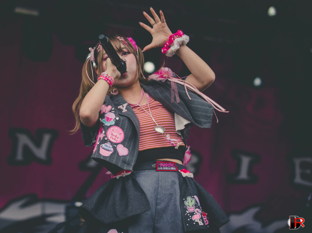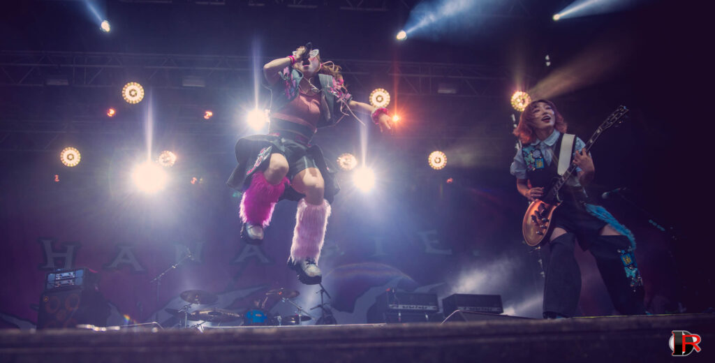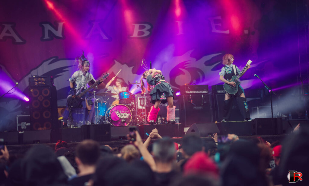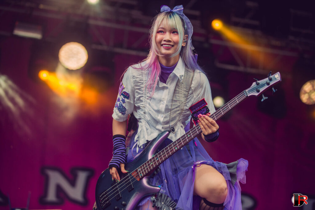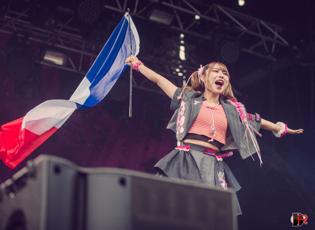Place maintenant à l’un des groupes les plus attendus par le public, Hanabie. Le groupe japonais de Metalcore, originaire de Tokyo, se compose de Yukina (voix), Matsuri (guitare et voix), Hettsu (basse et chœurs), et Chika (batterie). C’est sous une pluie battante, que la chanteuse fera son apparition, drapeau français en main. Avec un groupe looké en mode Kawaii, on rentre dans un univers à part, celui du « Harajuku-core », un mélange de sonorités Metal intenses et d’éléments visuels inspirés de ce quartier de Tokyo. Ce fut une vraie découverte pour nous, à l’inverse du public qui les attendait en masse, mais aura passé un excellent concert, grâce à leur énergie débordante et un live de qualité, et ce malgré la pluie incessante.