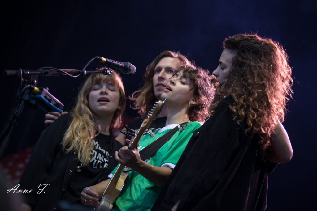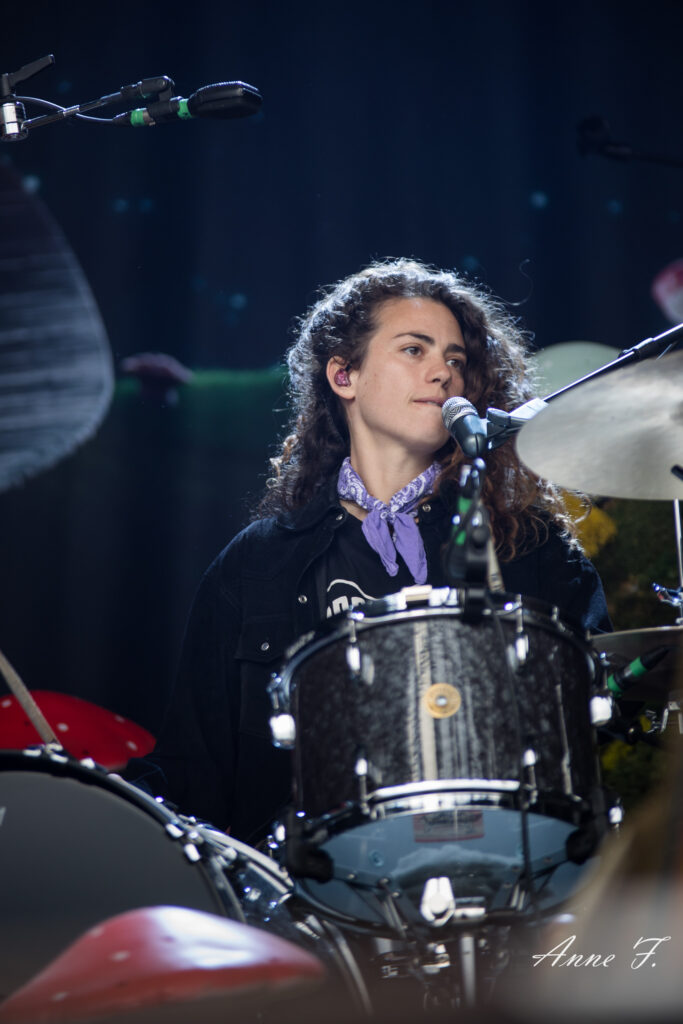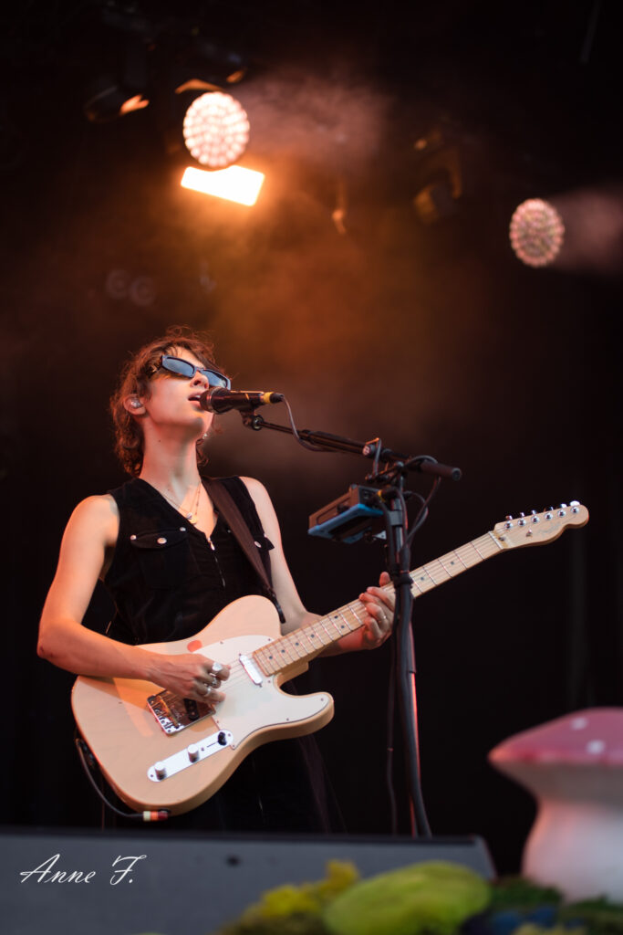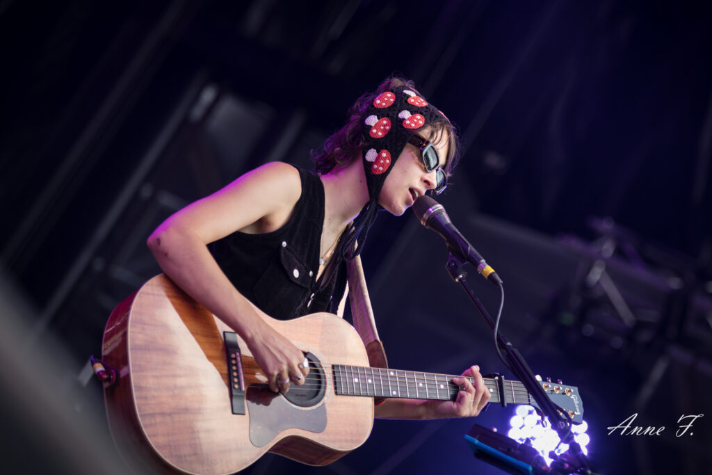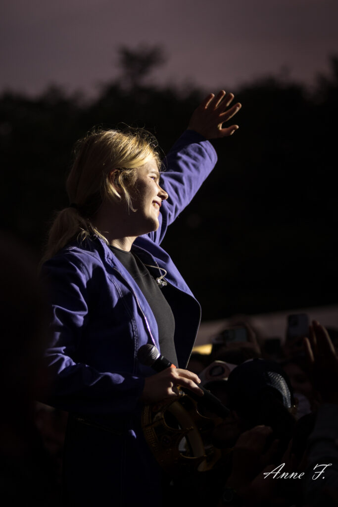 Après la séquence émotion d’une demande en mariage depuis la scène (spoiler : elle a dit oui !), c’est dans un magnifique décor champêtre que Pomme commence son concert qui ressemble à une voyage poétique mené en douceur par sa très jolie voix. Elle s excuse de chanter des chansons tristes dans un festival mais le public est bercé par le spectacle tout aussi visuel que mélodique..
