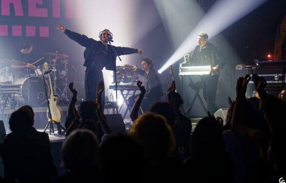 Je n’ai pas tout suivi de ce qui se passait pendant cette soirée. A un moment, j’ai même cru que je faisais un rêve. Je vous raconte. Au milieu d’une gigantesque scène, dans une salle de plusieurs étages, j’ai vu des personnes en combinaisons orange ou blanche envahir l’espace et s’arrêter devant des instruments. Il semblait s’agir de musiciens et performeurs. J’ai essayé de déterminer leurs rôles dans le groupe mais ai vite capitulé. En effet, en quelques minutes, la chanteuse grattant un ukulélé se retrouvait avec un didgeridoo. Le chanteur/pianiste faisait de même en passant des touches du clavier aux cordes d’une guitare, avant d’apparaître devant une batterie. Les autres musiciens étaient aussi polyvalents que ces deux membres en avant-scène. Sensiblement en avance sur Noël, j’ai aussi aperçu des lutins à l’aise sur scène jouer avec un public très réceptif. Après m’être pincé 5 fois et quelques vérifications, je me suis aperçu que j’assistais juste à un concert des Walk Off The Earth. Les lutins avaient aussi un nom : les Luminati Suns. J’avais déjà vu en concert les Canadiens musiciens lors du Lollapalooza de Paris pendant un court set en plein après-midi. J’étais impatient de voir ce qu’était un concert version longue. Bah je n’ai pas été déçu. Leur setlist comprenait leurs titres et des reprises à la sauce WOTE comme Eye of the tiger ou bien un medley des quatre garçons dans le vent. Dans les vidéos qui ont contribué à leur notoriété, nous pouvons les voir en studio lancer des instruments pour en réceptionner d’autres (la reprise de Karma Police me vient spontanément en tête comme exemple). C’était un joli clin d’œil de voir qu’ils faisaient la même chose en vrai et en direction des backliners (les personnes sporadiquement présentes sur scène pour redonner des accessoires tombés, placer ou échanger des instruments). Les enfants semblent suivre la voix de leurs parents : ils ont aussi contracté le virus musique et ont entre autres, repris la chanson de Benson Boone, Beautiful Things, pour le plus grand bonheur des fans à fond pendant tout le concert de Walk Off The Earth.