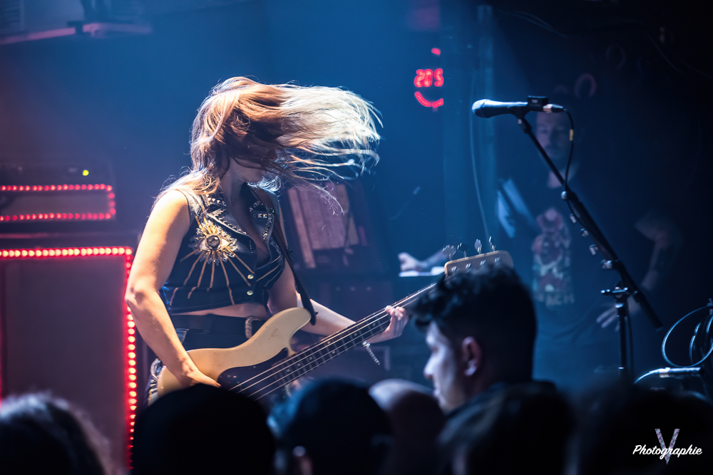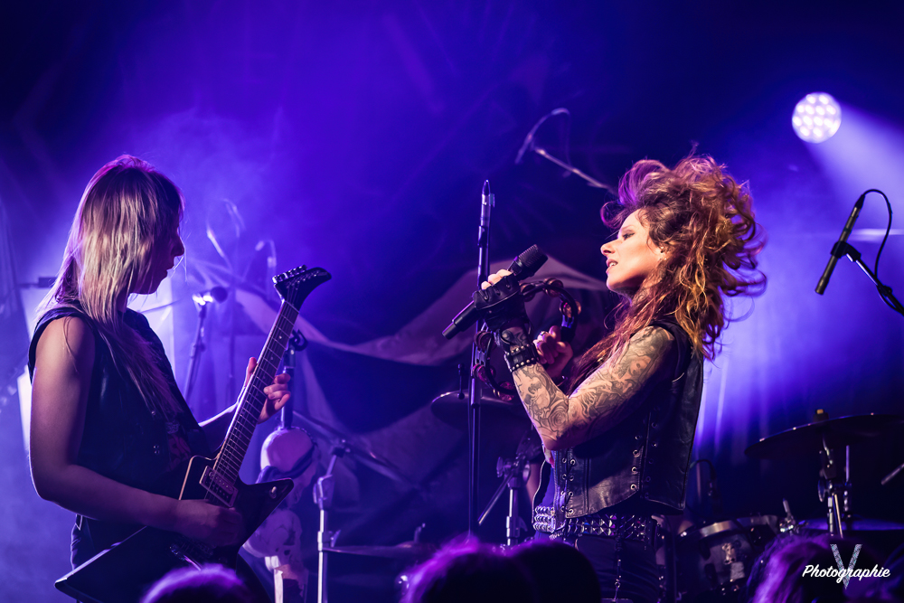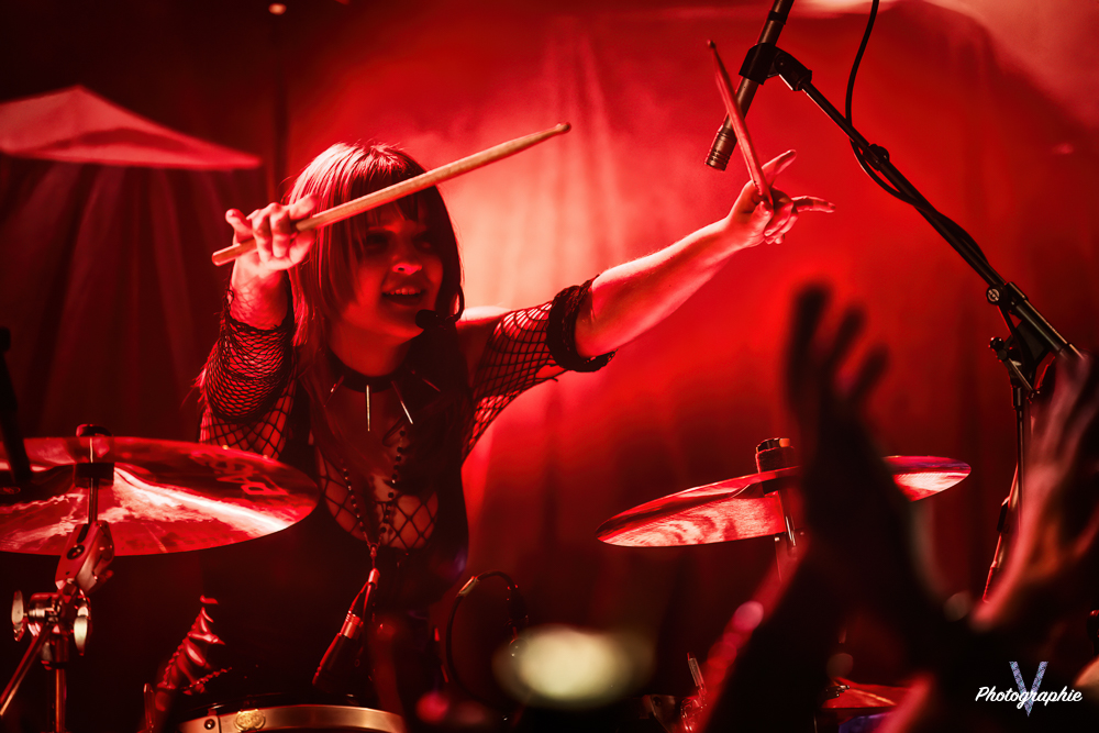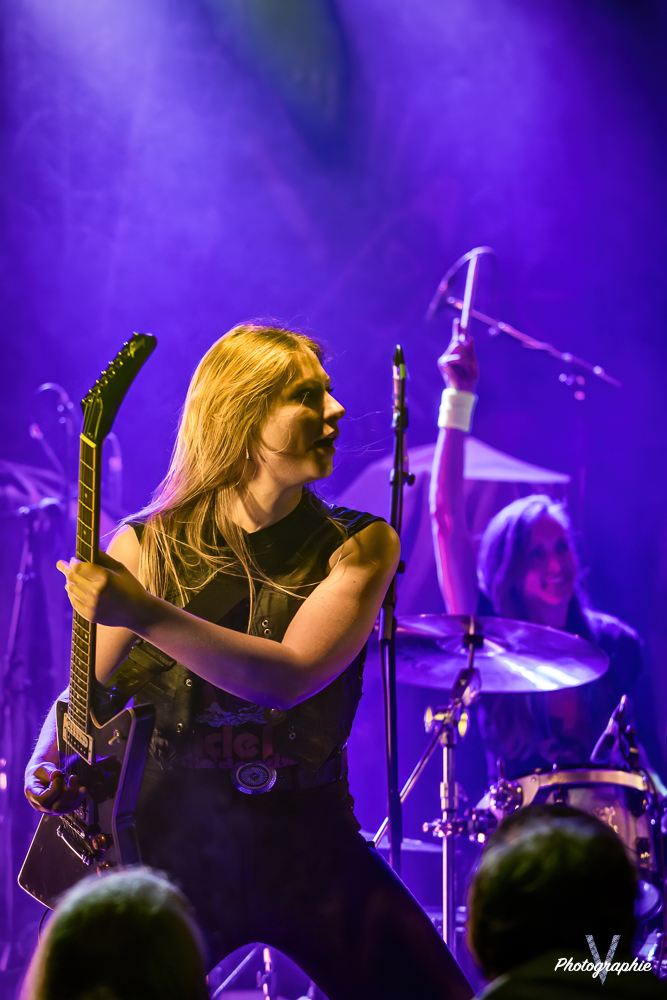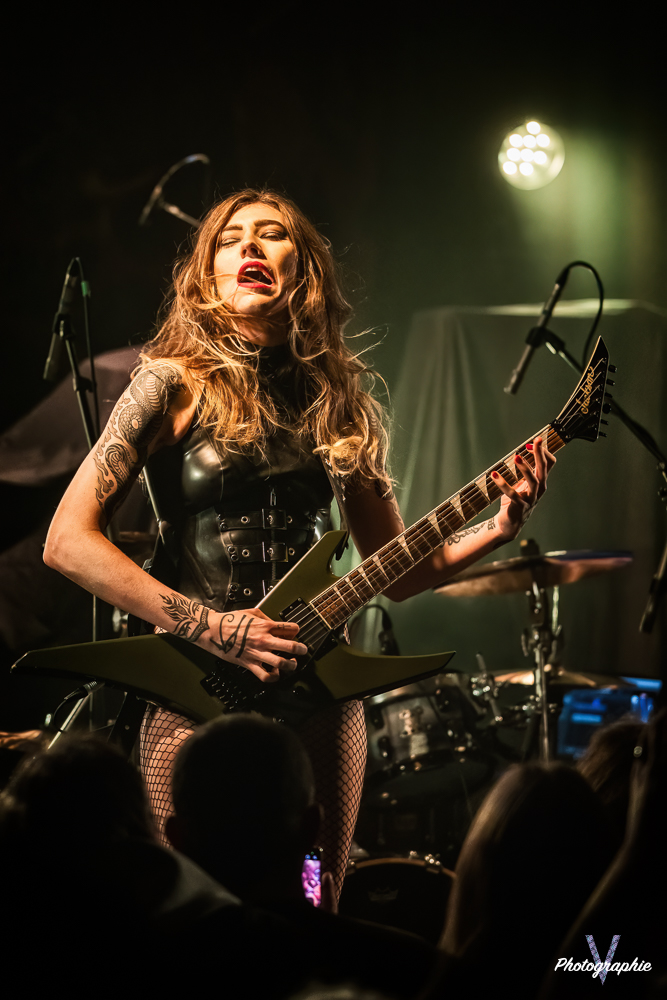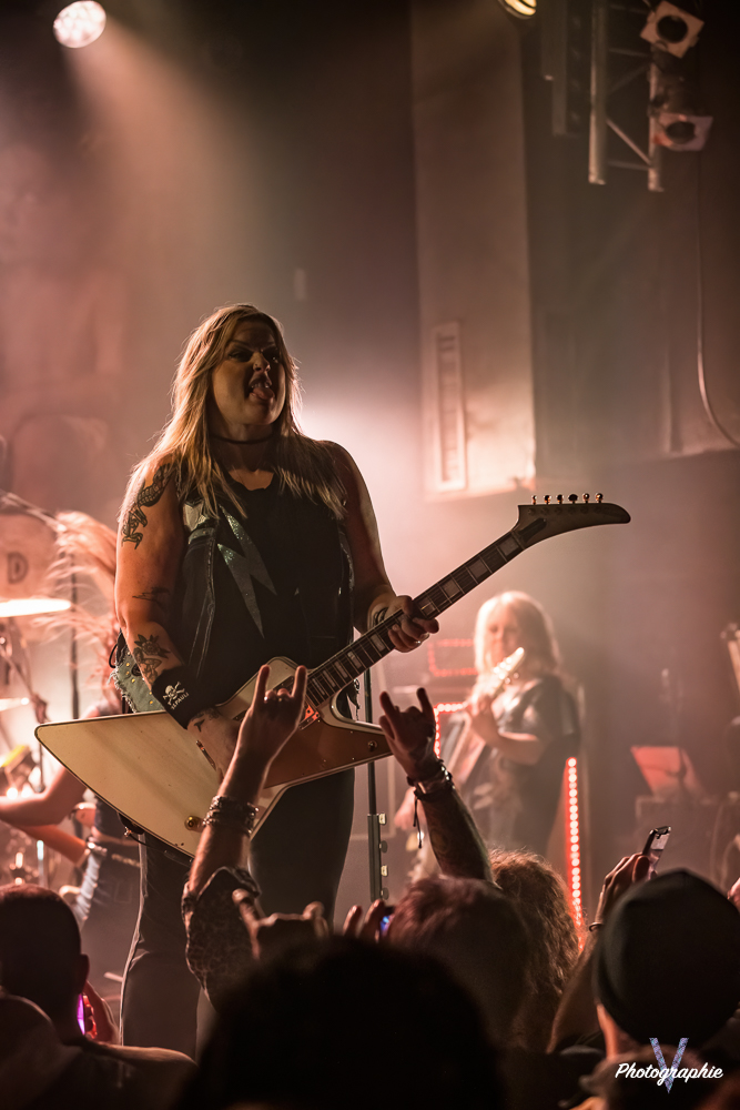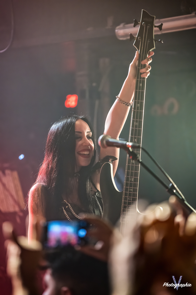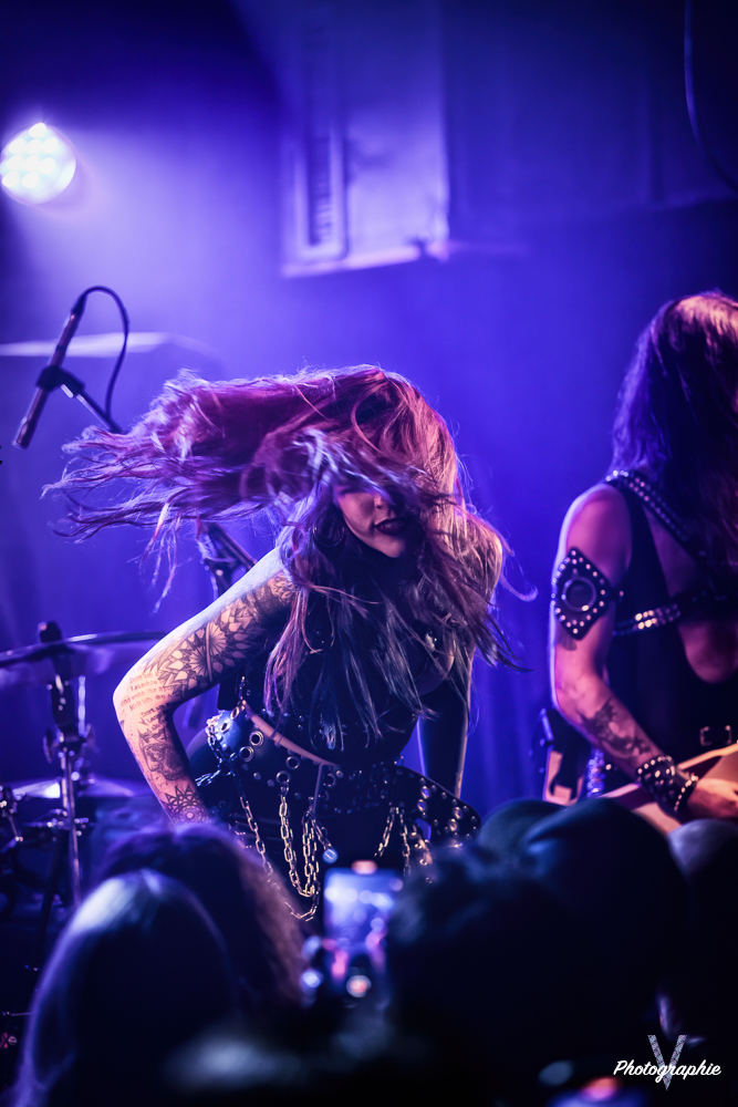 Les mamans vont mettre tout le monde d’accord dès les premières notes. Ce sont bien elles les reines du bal de ce soir. Des trois groupes c’est clairement le plus à l’aise sur scène. Pas de temps mort entre les titres, pas d’hésitation lorsque Linnéa s’adresse au public et des titres qui vont faire mouche à chaque fois. Pourtant on aurait pu avoir un petit doute car ce line up n’est pas si vieux. On se souvient du départ de Guernica qui avait entrainé ensuite le reste du groupe pour en former un nouveau. Filippa se retrouvant toute seule a réussi à recruter dare-dare les nouvelles recrues et elle a plutôt bien choisi parce qu’on a vraiment l’impression qu’elles se connaissent depuis des lustres. On ressent une vrai connivence entre elles sur scène et tout le monde paraît content d’être là. A ce propos, l’annonce de Joan à la batterie comme venant de Lorraine réveille chez le public la fibre patriotique. Elle nous fera un petit solo pour marquer le coup démontrant son savoir-faire. Linnéa Vikström (ex Therion, ex Kamelot) ira prendre un petit bain de foule en allant chanter un titre depuis le bar de Petit Bain avec une bière à la main. Nous aurons également droit à un un titre semi-acoustique pour calmer le jeu et donner un peu de relief au set.