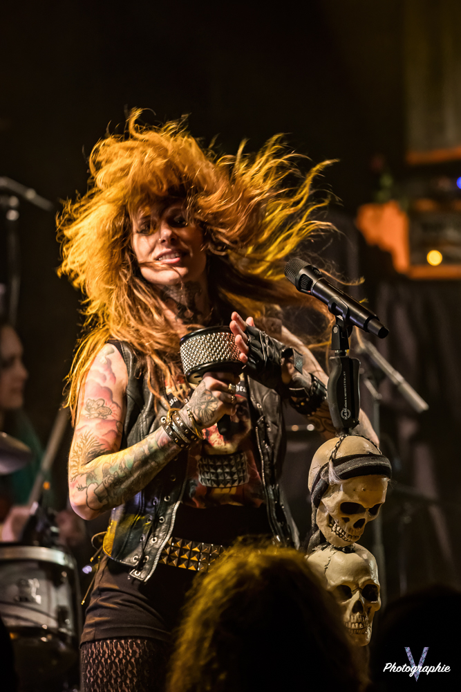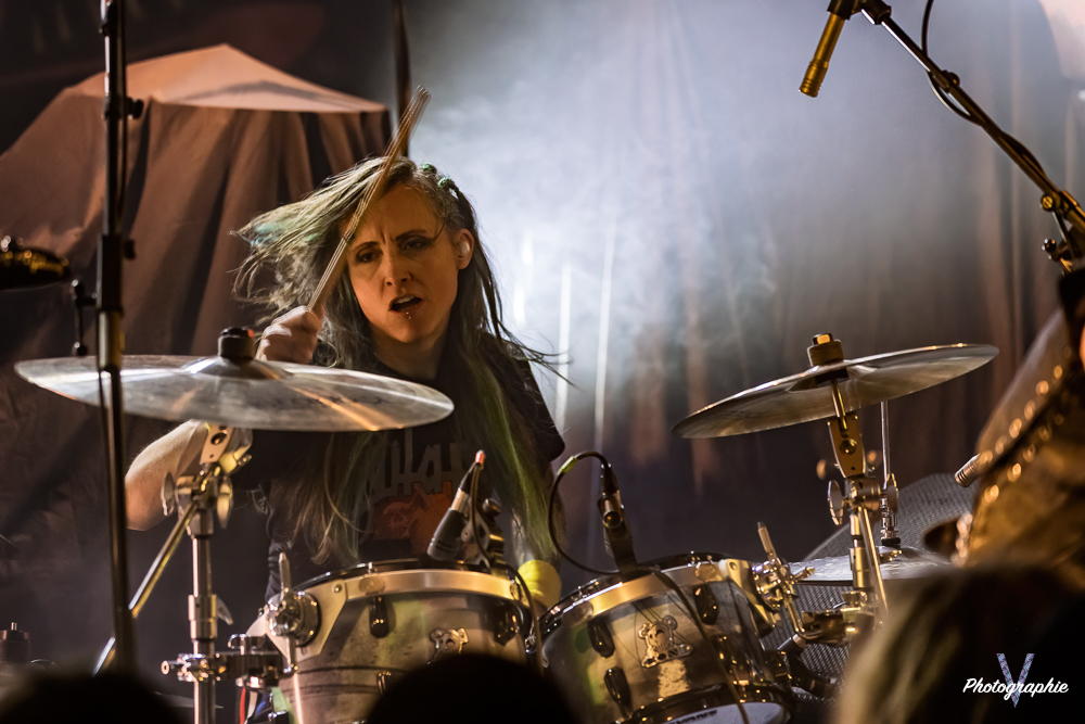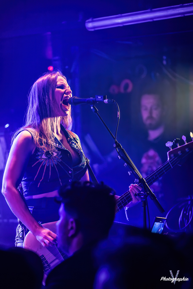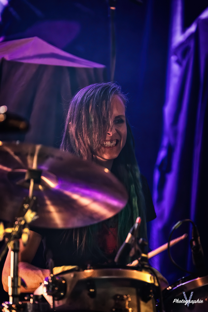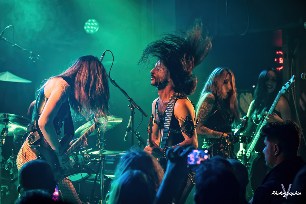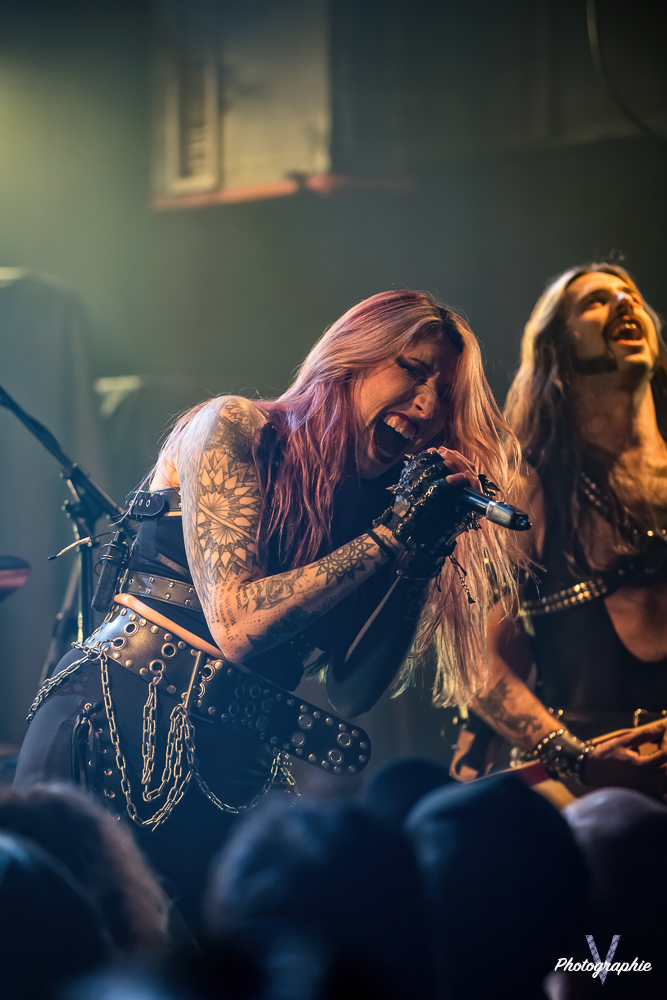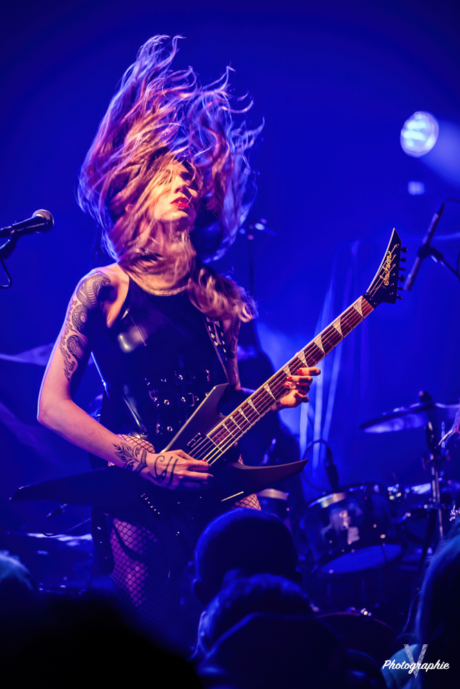 Les mamans vont mettre tout le monde d’accord dès les premières notes. Ce sont bien elles les reines du bal de ce soir. Des trois groupes c’est clairement le plus à l’aise sur scène. Pas de temps mort entre les titres, pas d’hésitation lorsque Linnéa s’adresse au public et des titres qui vont faire mouche à chaque fois. Pourtant on aurait pu avoir un petit doute car ce line up n’est pas si vieux. On se souvient du départ de Guernica qui avait entrainé ensuite le reste du groupe pour en former un nouveau. Filippa se retrouvant toute seule a réussi à recruter dare-dare les nouvelles recrues et elle a plutôt bien choisi parce qu’on a vraiment l’impression qu’elles se connaissent depuis des lustres. On ressent une vrai connivence entre elles sur scène et tout le monde paraît content d’être là. A ce propos, l’annonce de Joan à la batterie comme venant de Lorraine réveille chez le public la fibre patriotique. Elle nous fera un petit solo pour marquer le coup démontrant son savoir-faire. Linnéa Vikström (ex Therion, ex Kamelot) ira prendre un petit bain de foule en allant chanter un titre depuis le bar de Petit Bain avec une bière à la main. Nous aurons également droit à un un titre semi-acoustique pour calmer le jeu et donner un peu de relief au set.