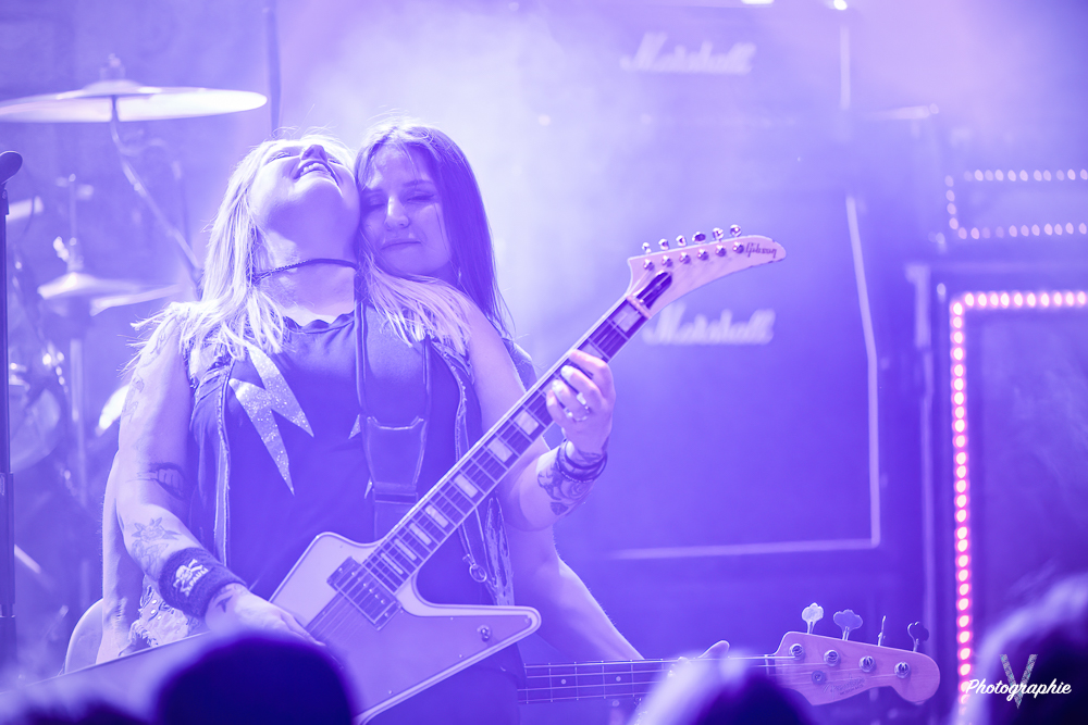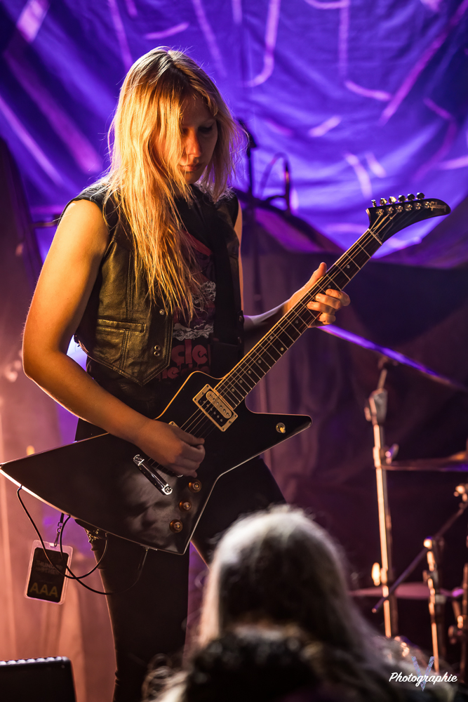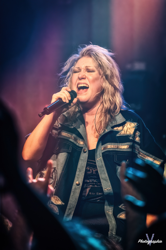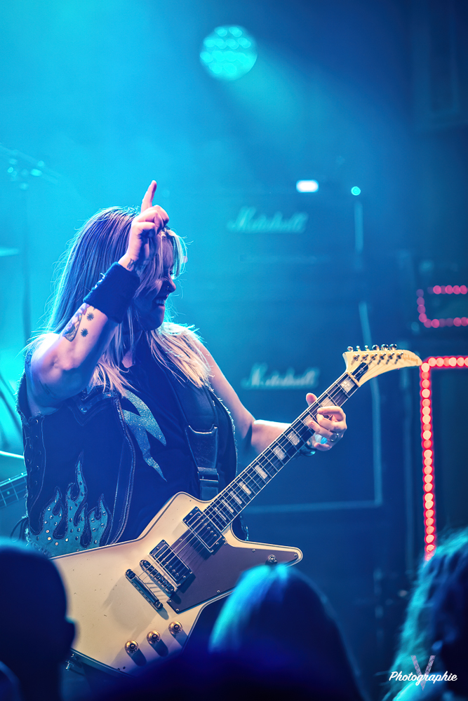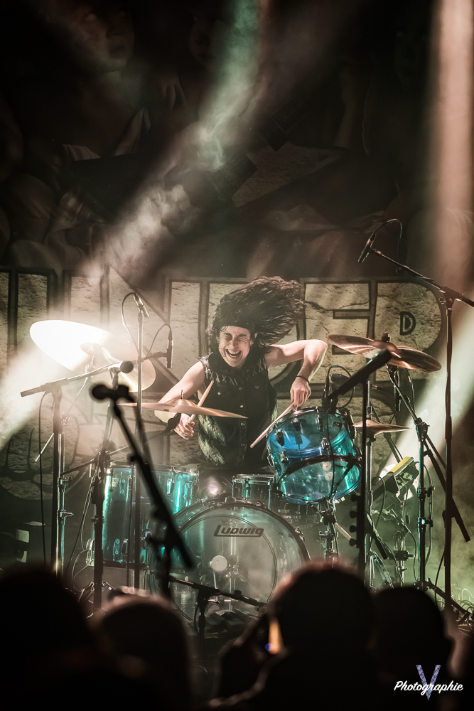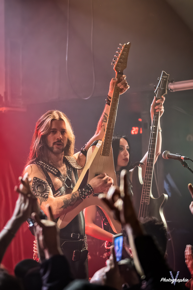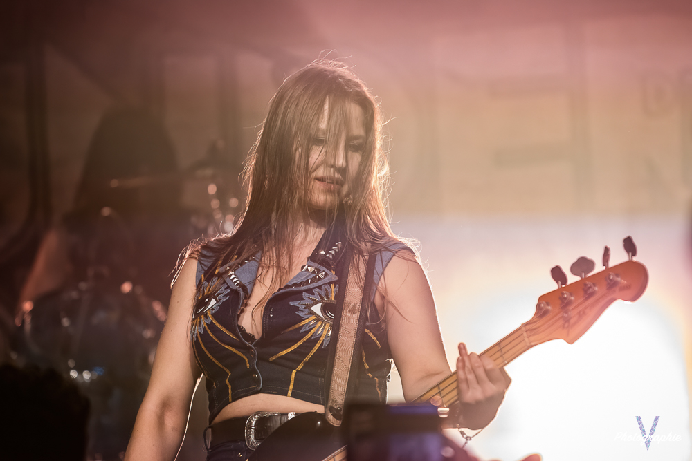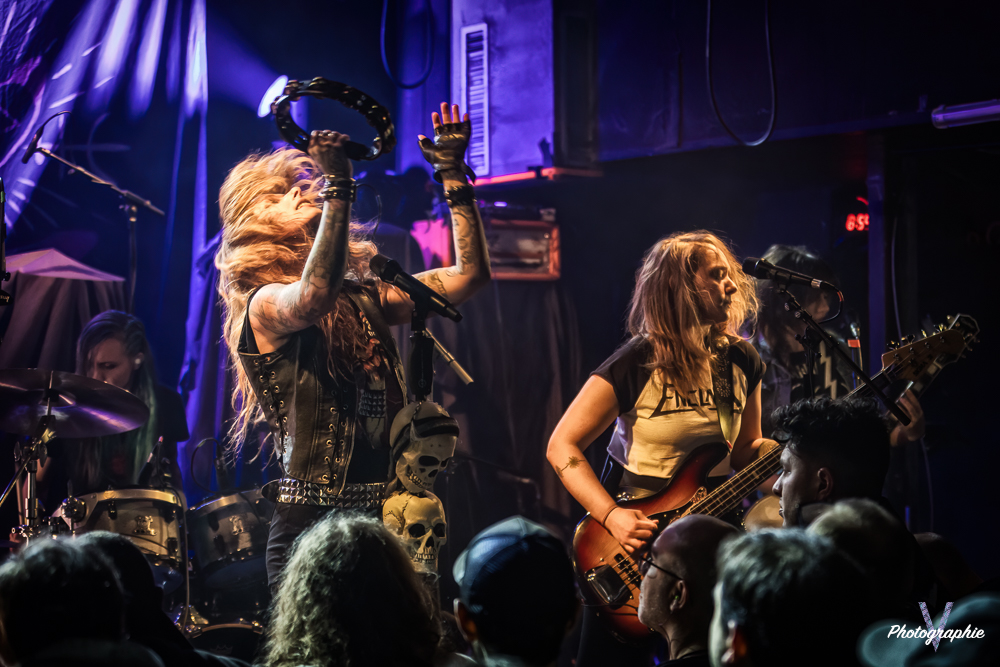 Les mamans vont mettre tout le monde d’accord dès les premières notes. Ce sont bien elles les reines du bal de ce soir. Des trois groupes c’est clairement le plus à l’aise sur scène. Pas de temps mort entre les titres, pas d’hésitation lorsque Linnéa s’adresse au public et des titres qui vont faire mouche à chaque fois. Pourtant on aurait pu avoir un petit doute car ce line up n’est pas si vieux. On se souvient du départ de Guernica qui avait entrainé ensuite le reste du groupe pour en former un nouveau. Filippa se retrouvant toute seule a réussi à recruter dare-dare les nouvelles recrues et elle a plutôt bien choisi parce qu’on a vraiment l’impression qu’elles se connaissent depuis des lustres. On ressent une vrai connivence entre elles sur scène et tout le monde paraît content d’être là. A ce propos, l’annonce de Joan à la batterie comme venant de Lorraine réveille chez le public la fibre patriotique. Elle nous fera un petit solo pour marquer le coup démontrant son savoir-faire. Linnéa Vikström (ex Therion, ex Kamelot) ira prendre un petit bain de foule en allant chanter un titre depuis le bar de Petit Bain avec une bière à la main. Nous aurons également droit à un un titre semi-acoustique pour calmer le jeu et donner un peu de relief au set.