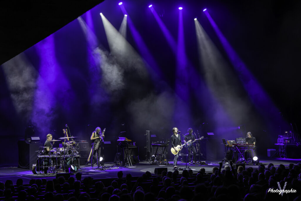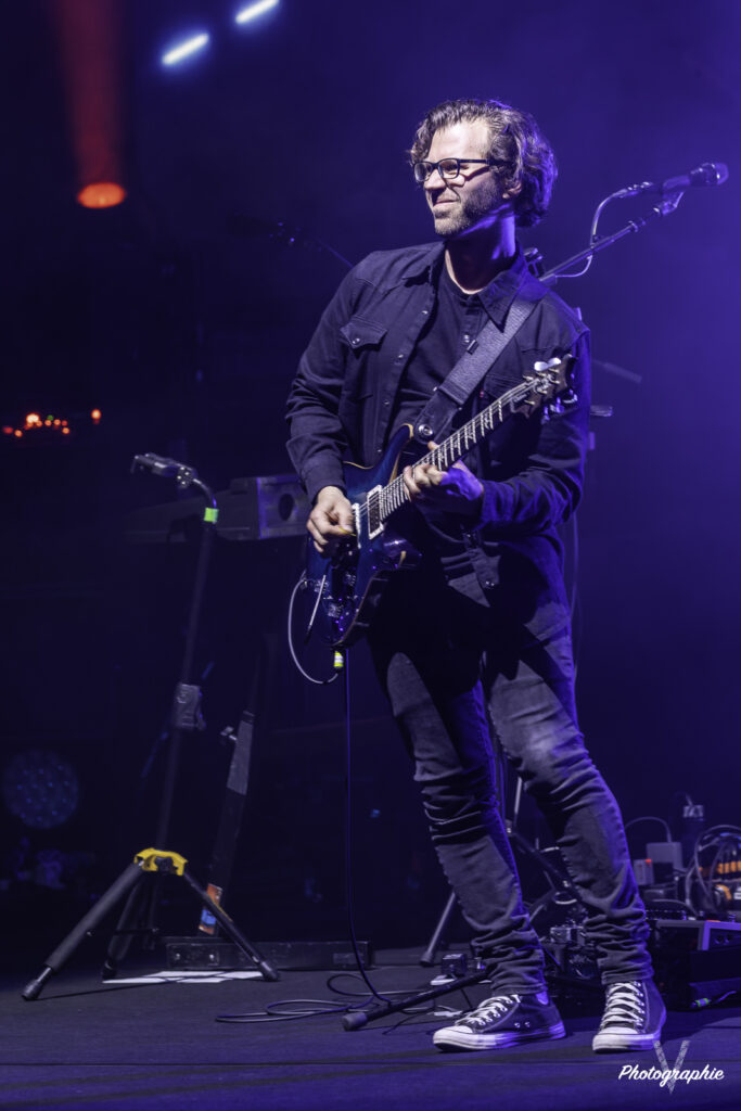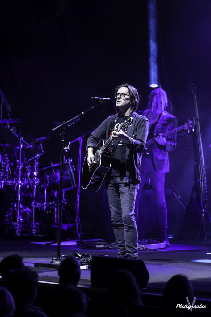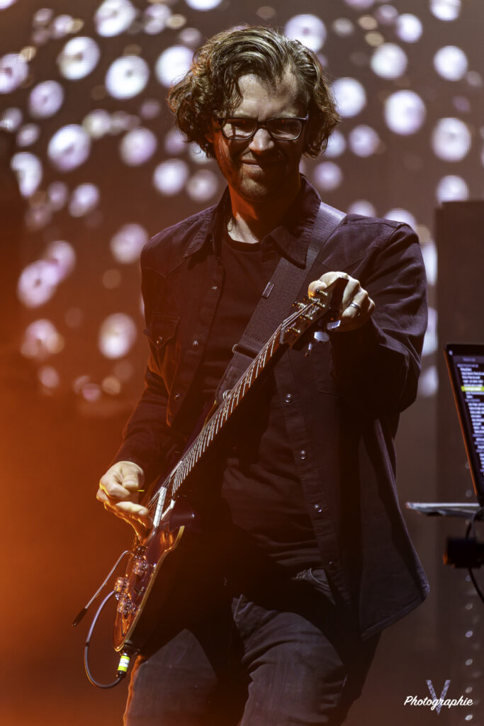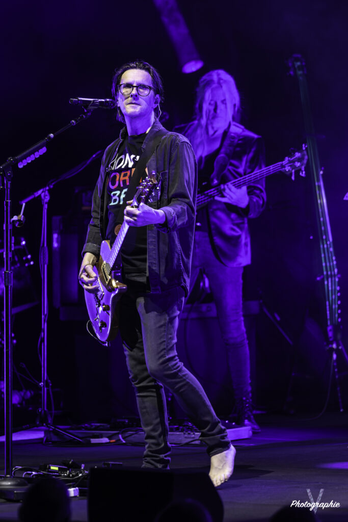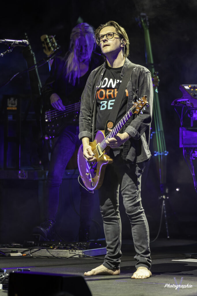 A la reprise pour la seconde partie du spectacle Steven plein d’auto-dérision se moque du côté élitiste de la musique qu’il joue ce soir. Il demande dans un premier temps qui est venu comme accompagnant et n’est pas du tout fan. Quelques mains timides se lèvent et il se veut rassurant en annonçant que le prochain titre ne dure pas plus de 4mn. Il se réclame autant influencé par Pink Floyd que par Prince. Tout au long des deux sets, Steven Wilson va passer de la guitare acoustique à la guitare électrique puis délaisser les six cordes pour s’accorder une récréation sur divers claviers et machines électroniques. Les transitions sont mégas soignées. Mention spéciale au guitariste soliste Randy McStine qui possède un touché incroyable et nous régalera de quelques envolées sans jamais tomber dans l’outrance. Craig Blundell à la batterie n’est pas manchot non plus, son touché oscillant entre pure Rock et Jazz colle parfaitement. Au début du second set, Rotem Wilson, la femme de Steven, donne de la voix avant de repartir en toute discrétion.