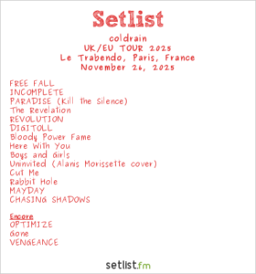 Mission accomplie : les deux précédents groupes ont fait le job. Le Trabendo affiche complet. Les 900 spectateurs attendent avec impatience l’entrée en scène de Coldrain pour slamer, pogoter et faire des circle pits. Le groupe de Metalcore originaire de Nagoya ne les fait pas trop languir et débute avec punch son set par deux chansons de leur nouvel EP, Optimize. La setlist variée ravit les fans de Metal. Elle séduit aussi les fans de pop culture qui auront reconnu certains génériques de leurs animés préféré(Fire Force, Bastard, …). J’ai été séduis par la prestation des cinq musiciens. J’ai aussi été conquis par l’atmosphère de fête générée par un public en feu. Je remercie l’ami qui m’a fait l’univers de Masato, RxYxO, Katsuma, Y.K.C. et Sugi. Sans mon matos photo, je l’aurais sûrement rejoint dans la fosse. Pour la deuxième et dernière anecdote de ce live report, cet ami est aussi présent sur une des photos. Coldrain est un de mes coups de cœur de l’année 2025. Je suivrai avec attention les prochaines dates de leurs tournées.