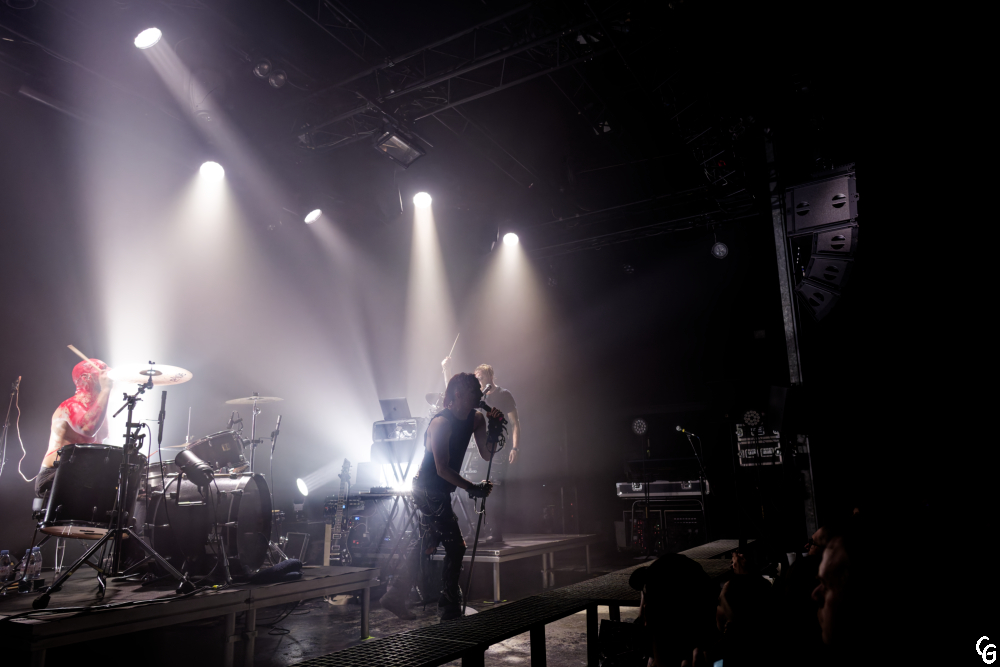 est « un groupe français abrasif et percutant qui mêle des influences Metal, Grunge et Electro à ce qui se fait de plus actuel voire futuriste. Qualifiés de Néo industriel, ce trio développe une énergie cataclysmique lors de leurs performances à la fois sauvages et millimétrées ». Leur mini biographie d’illustration résume bien l’atmosphère qui régnait dans la salle de Savigny-le-Temple en cette fin de soirée. Quelques minutes après le changement de plateau, l’installation d’estrades métalliques en avant-scène et d’une puissante machine à fumée, nous nous serions crus dans un univers post-apocalyptique. Merci aux trois groupes pour cette soirée fusionnelle, où les genres musicaux se sont liés et confrontés pendant plusieurs heures,  nous offrant une expérience auditive et sensorielle très intéressante.