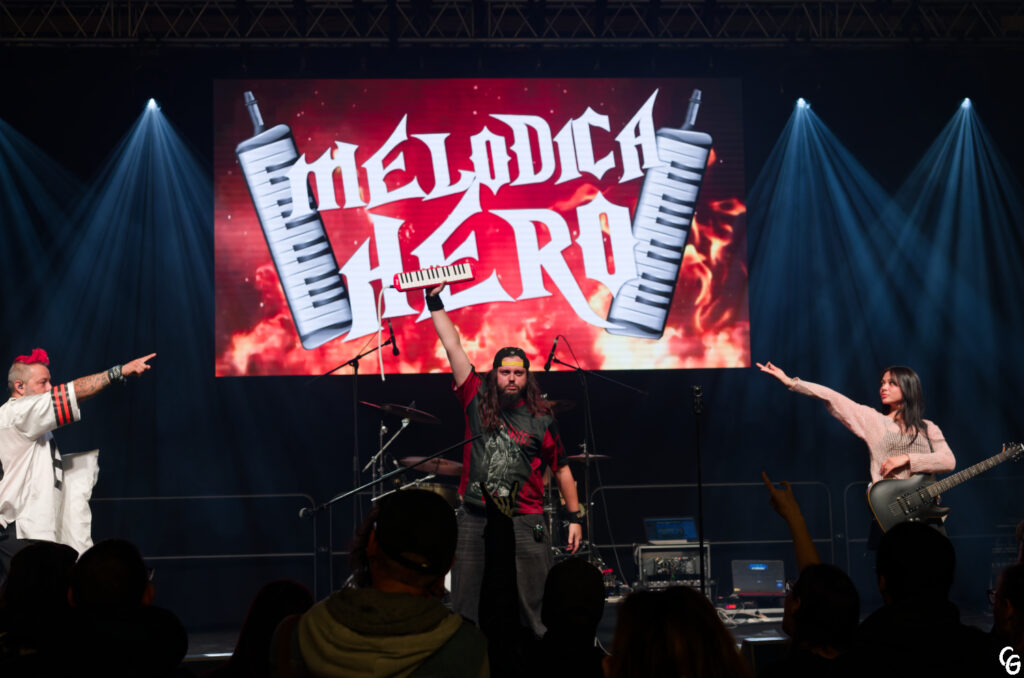 Ils sont quatre. Ils manient les étincelles, les cordes et les baguettes à la perfection et ont réussi à se faire un nom depuis 2019 dans le sud de la France. La réputation des Pixel Syndrome n’est plus à faire. Lorsqu’ils ont été contactés par la Game’In Reims, victime d’une cyber-attaque commanditée par le diabolique Jack, ils n’ont pas hésité une seule seconde à quitter leur repère et franchir le nord de la France. Soutenue par une foule composée de metalleux, cosplayers et curieux, la compagnie qui passe son temps à voguer entre pixels et décibels (clin d’œil à la chanson Gamers jusqu’à la moelle) n’avait à peine foulé la scène pop culture qu’elle subissait en début de set, un piratage électrique. Ceci était sûrement un piège de Jack le Metalleux Geek, prêt à user de n’importe quel subterfuge pour détruire le monde. Malheureusement pour lui, Pixel Syndrome pouvait compter sur une communauté solidaire prête à participer à un défi pour maintenir une ambiance et une connexion convenable pour le contrer. Dans cette partie d’échec, le groupe possédait une même une pièce maîtresse : le Nokia 3310.