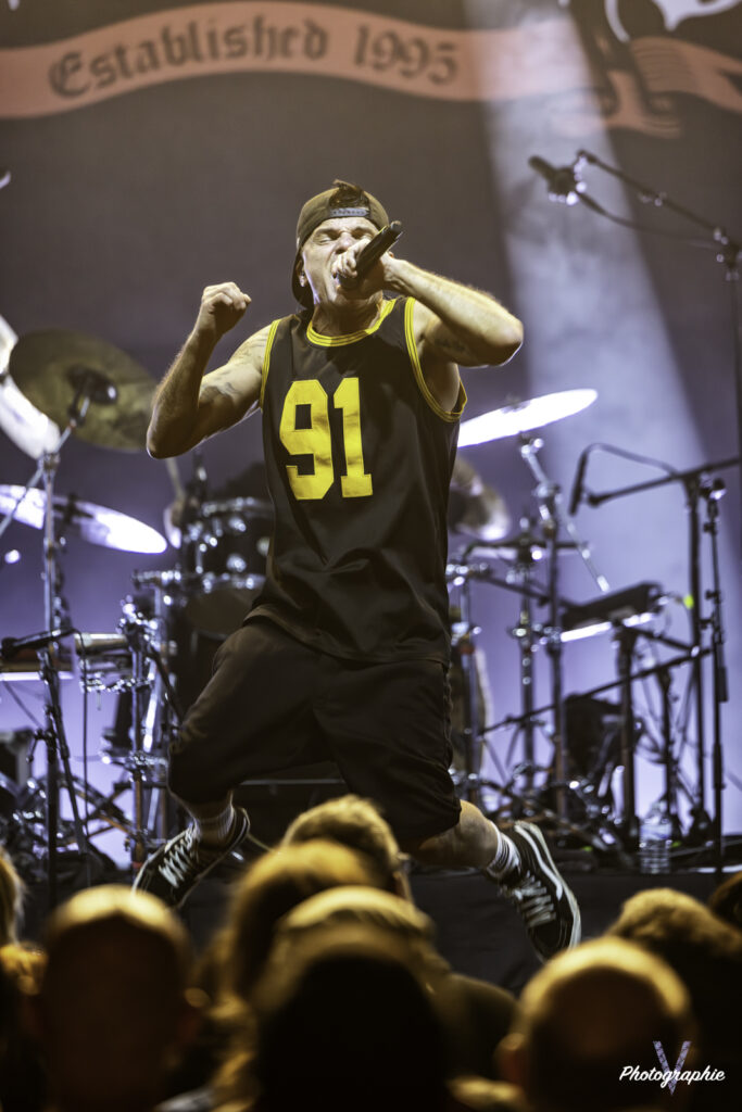 Silmarils investi la scène en toute décontraction, on est entre potes, pas de chichi, de mise en scène très travaillée, la démarche est limite Punk. Cette nonchalance sympathique perdurera entre chaque titre avec de l’autodérision et une forte proximité avec le public. La fosse n’est pas extrêmement compacte ce soir, mais on est nettement plus serré qu’au moment de la première partie. En revanche le public présent sera nettement plus engagé que d’habitude dans cette salle. Tout le monde saute, danse, David Salsedo arrivera même à former un wall of death vers la fin du set. Il faut dire que le groupe donne tout, c’est la dernière date de la tournée il s’agit de finir en beauté. C’est principalement David qui fait le show très sautillant, il trône au centre de la scène et déclame son Rap sur fond de Fusion Rock/Metal avec l’aide de ses acolytes Brice Montessuit qui se colle de temps en temps à la trompette et Jean-Pierre Martins qui vont occuper chaque côté de la scène en renfort. Le line up du jour se complète de Stéphane « Jimi » Daurs à la guitare, d’Aymeric Moneste à la batterie, mais en revanche nous ne retrouvons pas Côme Aguiar à la basse mais quelqu’un que nous n’arrivons pas à identifier. Les musiciens sont globalement assez statiques laissant la place aux trois chanteurs.