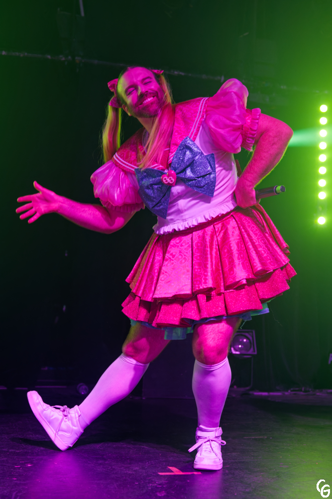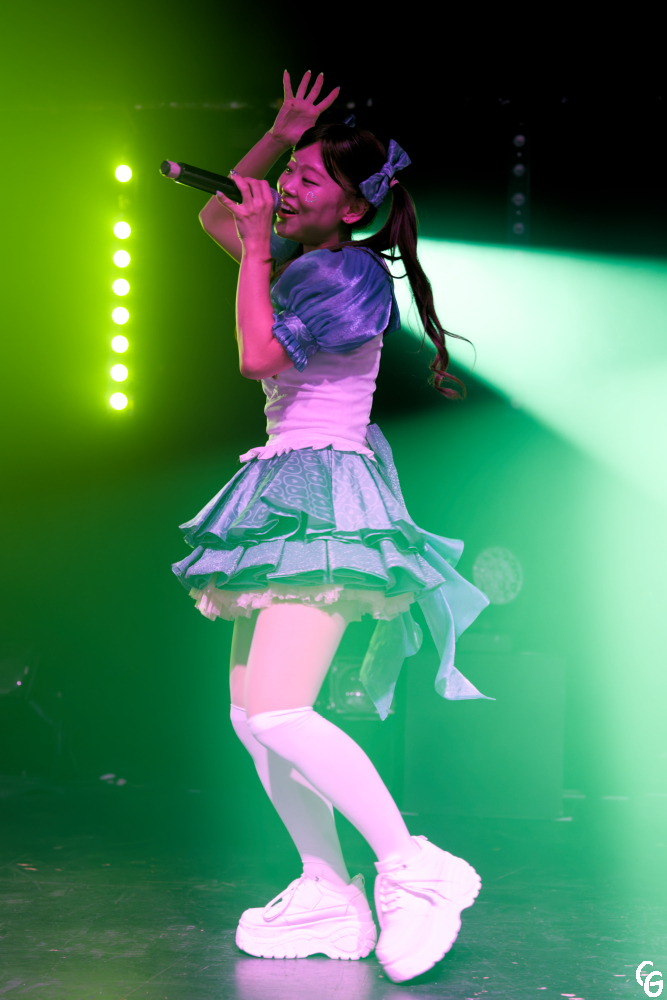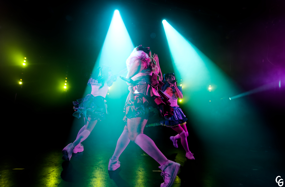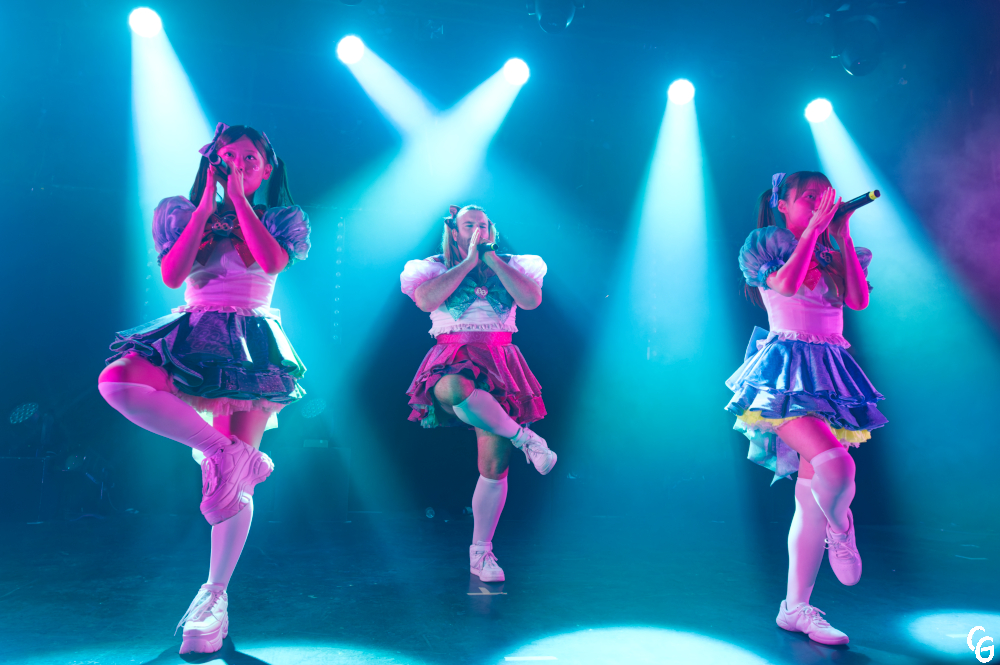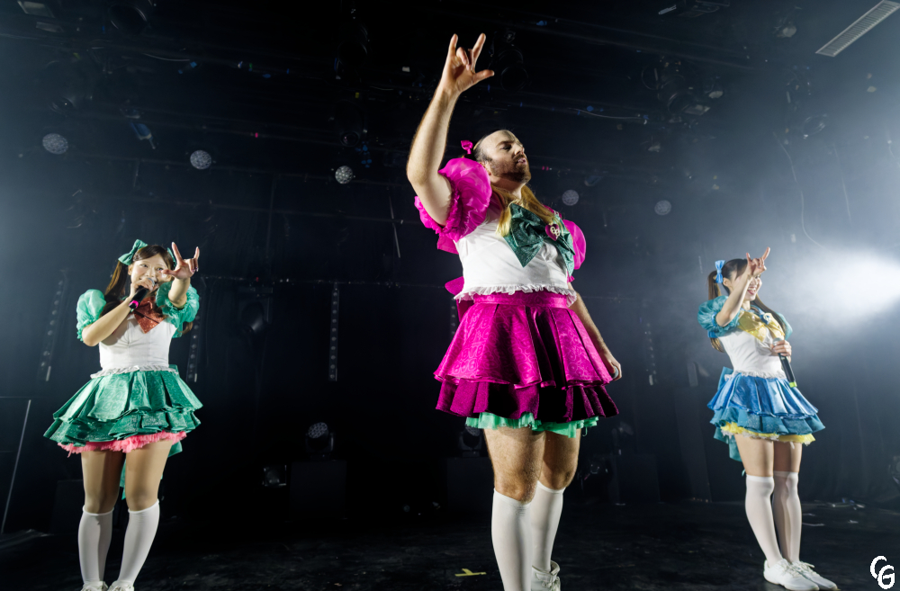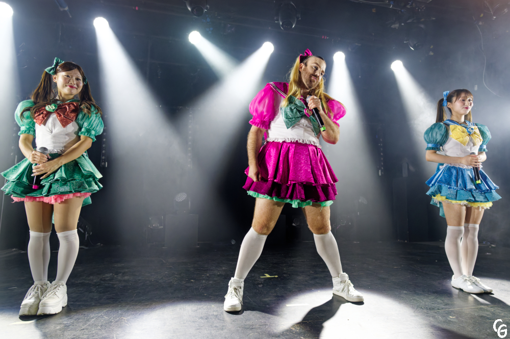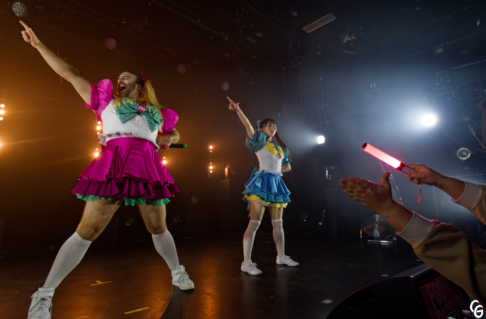 Le 17 janvier 2025, le tour européen de Babybeard passait par Paris. Le groupe composé de deux Idoles Pop japonaises énergiques et d’un troisième membre à la fois catcheur, danseur et chanteur ne passe pas inaperçu. Vêtu lui aussi en costume d’Idole avec sa couleur préférée (le rose), Ladybeard se plaçait au milieu de Mizuki et Suzu. Le trio enchaînait les chorégraphies millimétrées . Leurs chants à la fois brutaux et mélodieux ont ambiancé les spectateurs. Pendant que je rangeais rapidement mon matériel photographique dans le hall après les trois premières chansons, j’entendais derrière les portes un spectateur mécontent. Il s’agissait en fait d’un catcheur local qui défiait Ladybeard. En quelques minutes, la salle du FGO Barbara s’était transformée en ring géant ! Le combat qui a commencé sur scène a très vite dégénéré et continué dans la fosse. Des coups ont été échangés et les murs ont été dépoussiérés (un corps projeté, cela nettoie bien). Bien aidé par ses deux partenaires vêtues de vert et de bleu, Ladybeard a finalement gagné le combat. Cette explosion de testostérone a rendu l’atmosphère encore plus énergique, pour le plus grand plaisir des fans venus de Belgique et de France pour la première expérience du groupe de KawaiiCore en France. Le public était très actif. En plus des chants et des mains levées en l’air, des spectateurs ont même initiés un circle pit très festif à la fin du set. J’ai beaucoup aimé l’ambiance puis les échanges entre le groupe et le public. La setlist de Babybeard composée de nouveautés et sons connus par les fans était à l’image du groupe : À la fois Kawaii et musclée ! A la fin du concert, le trio d’Idoles Pop Métal le plus fou du Japon est venu saluer une dernière fois le public à côté du stand de merchandising.