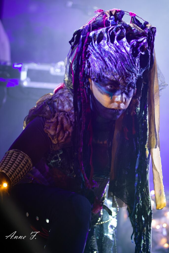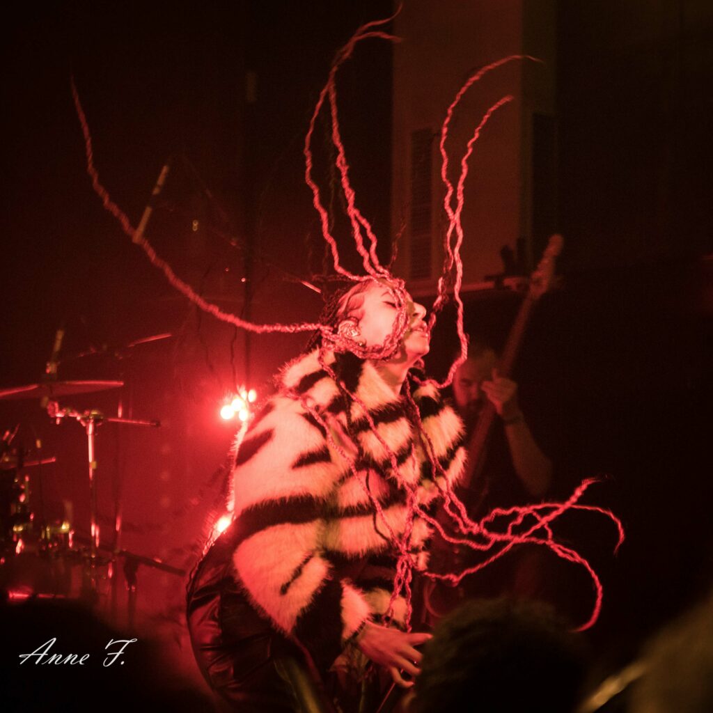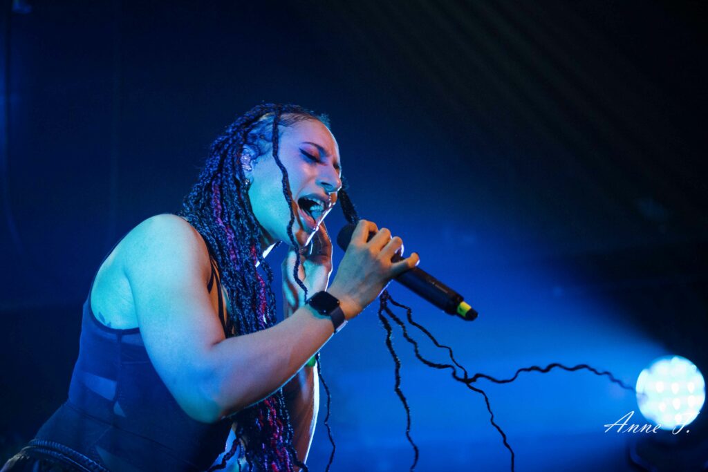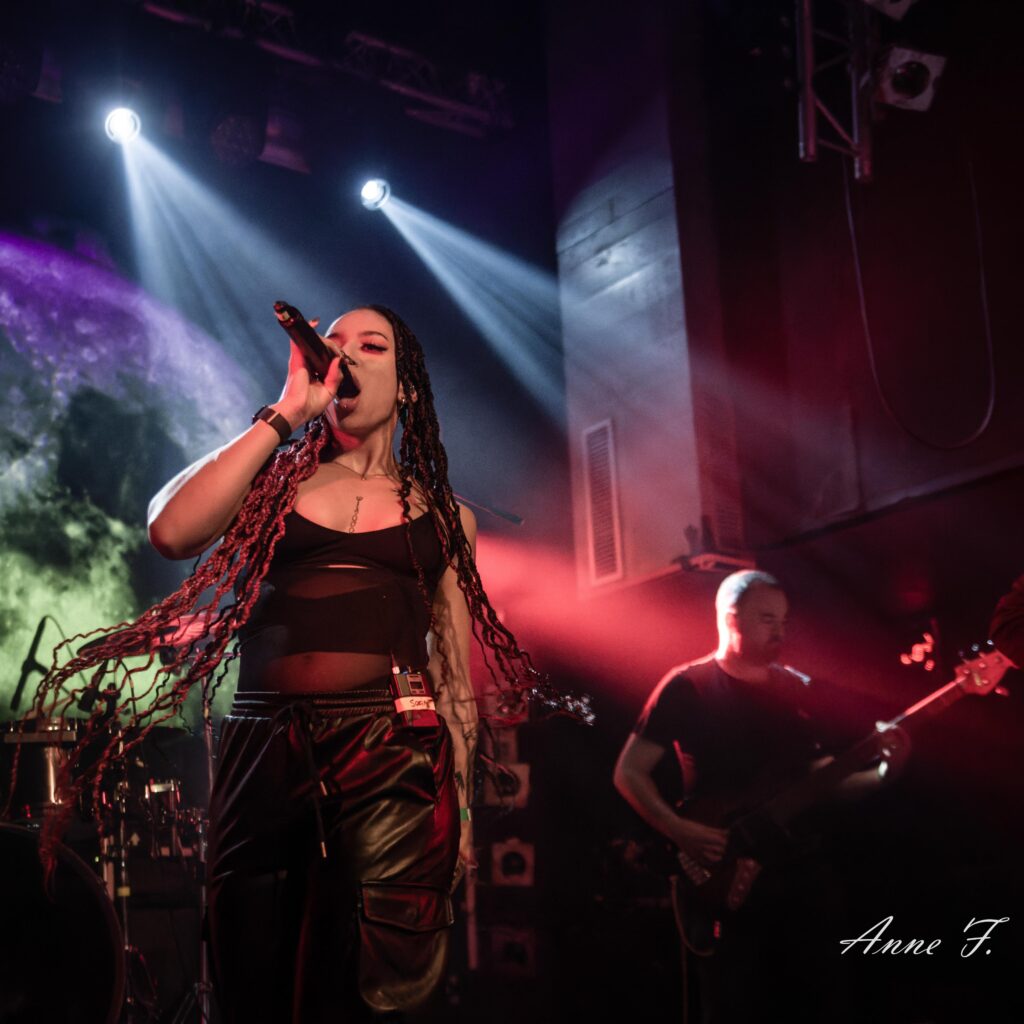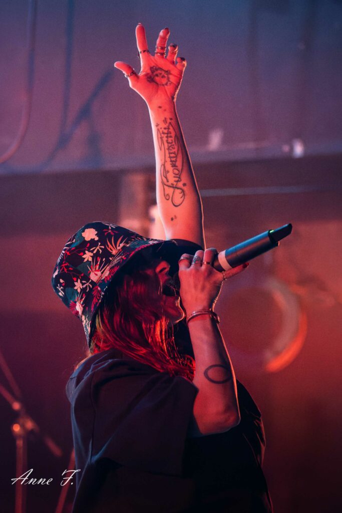 Le collectif musical et graphique La Nébuleuse d’Hima, mené par la chanteuse Faustine Berardo, va aussi mettre tout le monde d’accord. Ce soir, ils seront 5 sur scène, 4 musiciens, et une performeuse. Avec une scénographie qui pose visuellement l’ambiance, ils nous font entrer dans leur univers fusion Metal, Hip Hop et Electro aux larges influences.