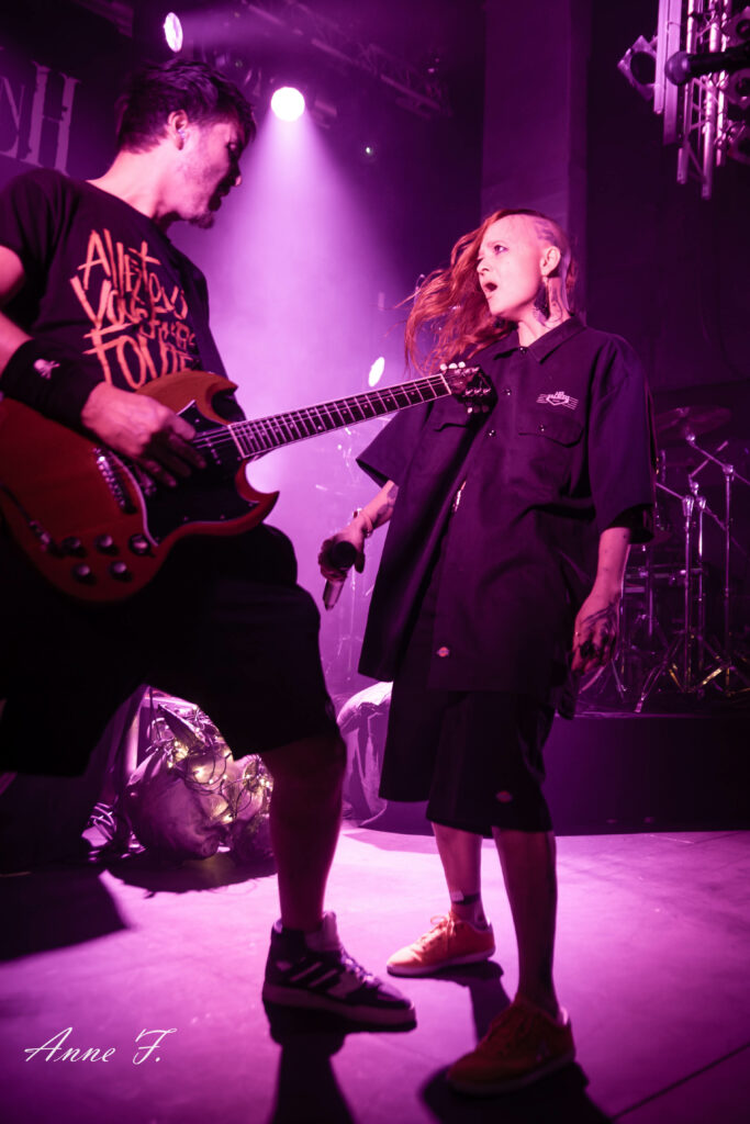 Seule en scène, Yenne va ouvrir la soirée et sera soutenue par les premiers rangs pour son tout premier concert. Avec son Rock teinté de Metal Emo, malgré quelques problèmes techniques, elle assure avec une forte présence scénique et va conquérir le reste de la fosse qui participe notamment sur le reprise de t.A.T.u. All The Things She Said. Une belle découverte à suivre.