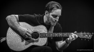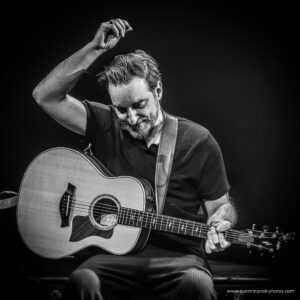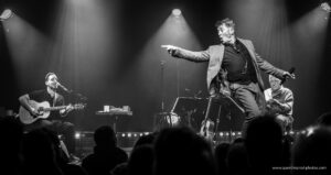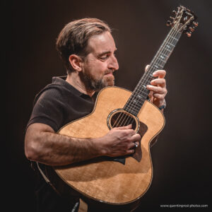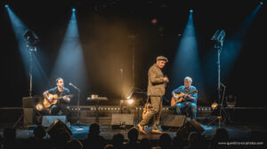 La soirée débute dans un dépouillement total. Yves Jamait arrive seul sur scène, a cappella, avec une simple lumière qui dessine sa silhouette. Sa voix, nue et grave, impose immédiatement le silence. Puis il est rejoint par ses deux guitaristes : Jérôme Broyer, dijonnais comme lui, compagnon fidèle qui l’accompagne depuis dix ans, et Michel Haumont. Présence discrète mais impressionnante, Haumont est l’un des très grands guitaristes français, musicien d’exception à la carrière impressionnante, qui a notamment accompagné Maxime Le Forestier pendant de nombreuses années. La filiation se joue aussi là, dans les doigts, dans les cordes, dans cette manière d’habiter la chanson sans l’écraser.