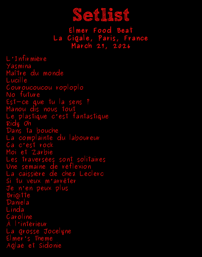 Cigale en place, la salle parisienne n’en pouvait plus d’attendre. Ici et là, une génération dominante, celle de leurs exploits, de leurs disques d’or, de leur Victoire de la musique – en somme, de leur omniprésence, et notamment outre-Atlantique, au célèbre CBGB de New-York où passèrent, entre autres, les Ramones. Ils sont donc là les fans de la première heure, au taquet, toujours, munis de leurs casquettes blanches flanquées du doux nom d’Elmer Food Beat – fermez les yeux et vous saisirez l’idée des garçons…