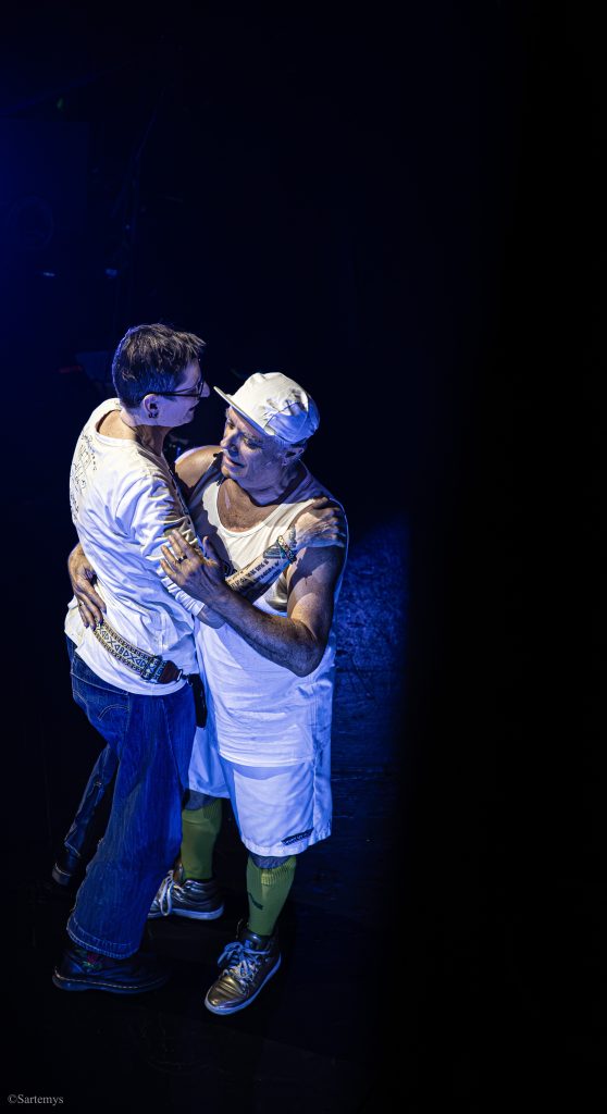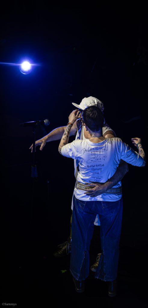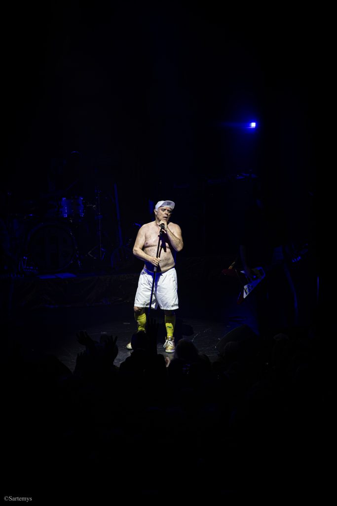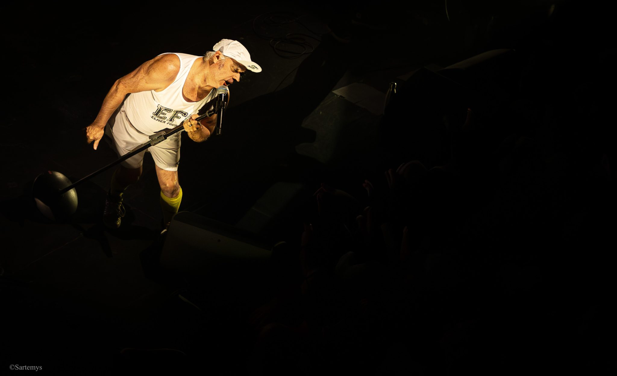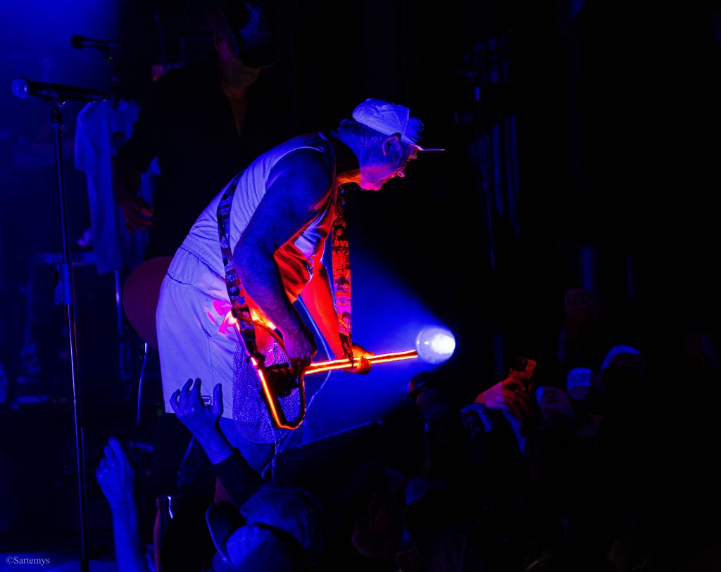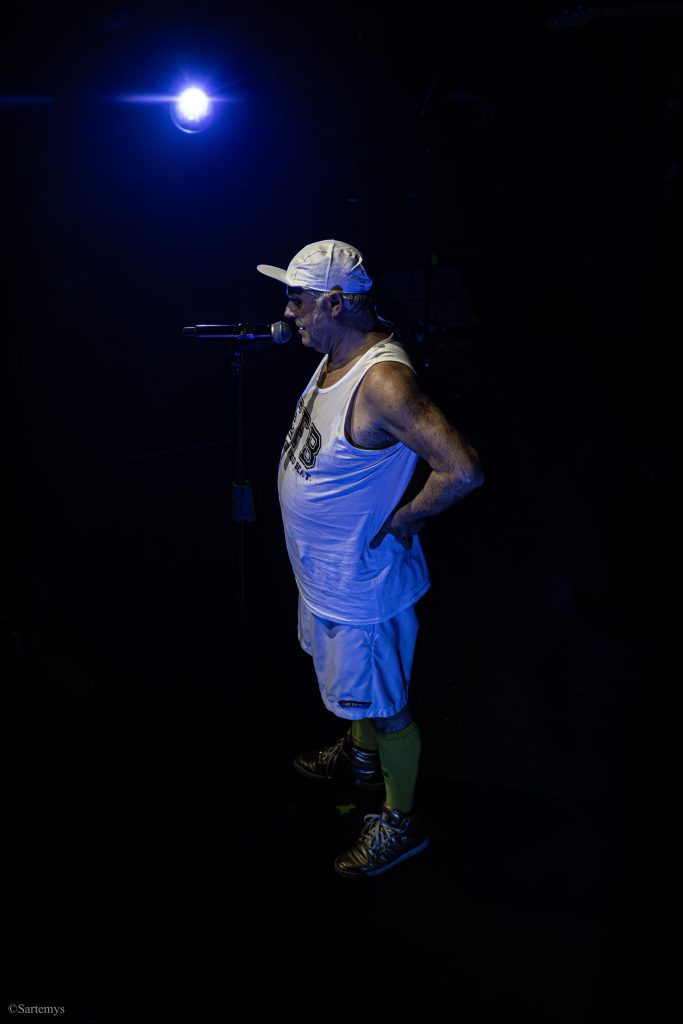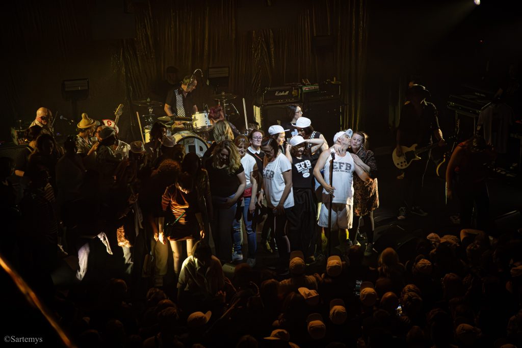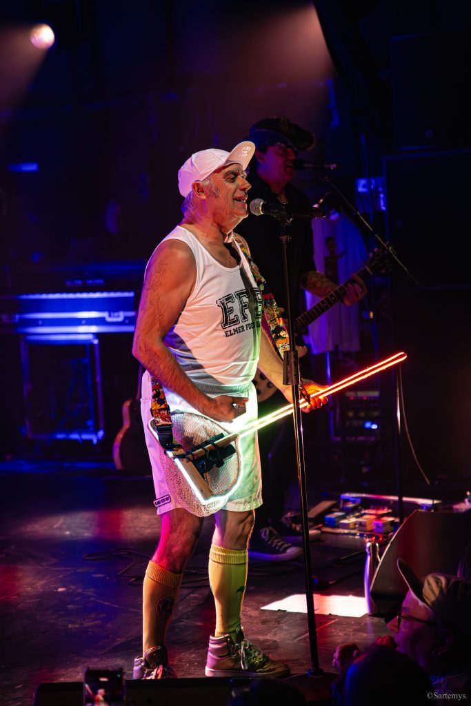 Et c’est donc avec assurance que le chanteur originel, Manou, dégaina sourires et gestes à faire plier les plus facétieux de la bande qui, soyons honnêtes, représentaient la salle toute entière. Elmer Food Beat était attendu ce soir, et ils le savaient, s’en donnant à cœur joie pour faire profiter leurs fidèles. L’échange sera tel qu’un membre du public sera convié à monter sur scène afin de partager une danse avec l’homme en blanc : Manou-Messie, ce n’est qu’une question de lettres !